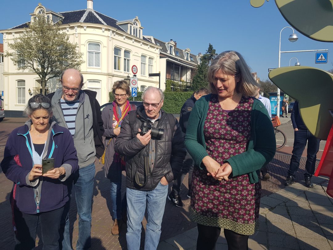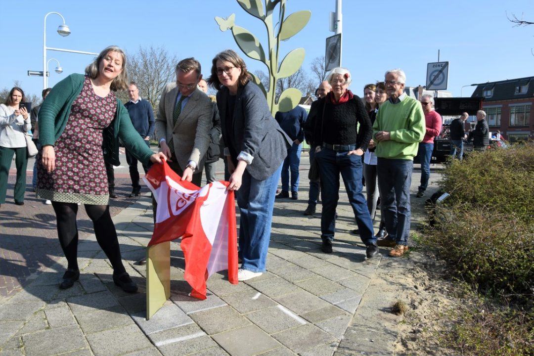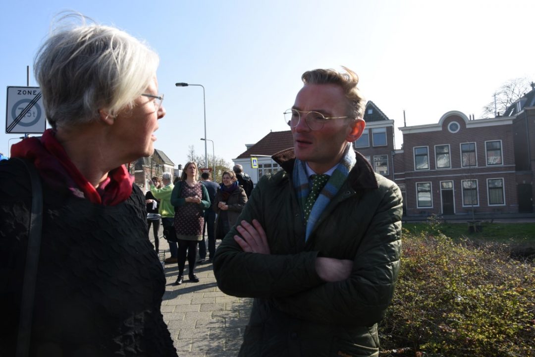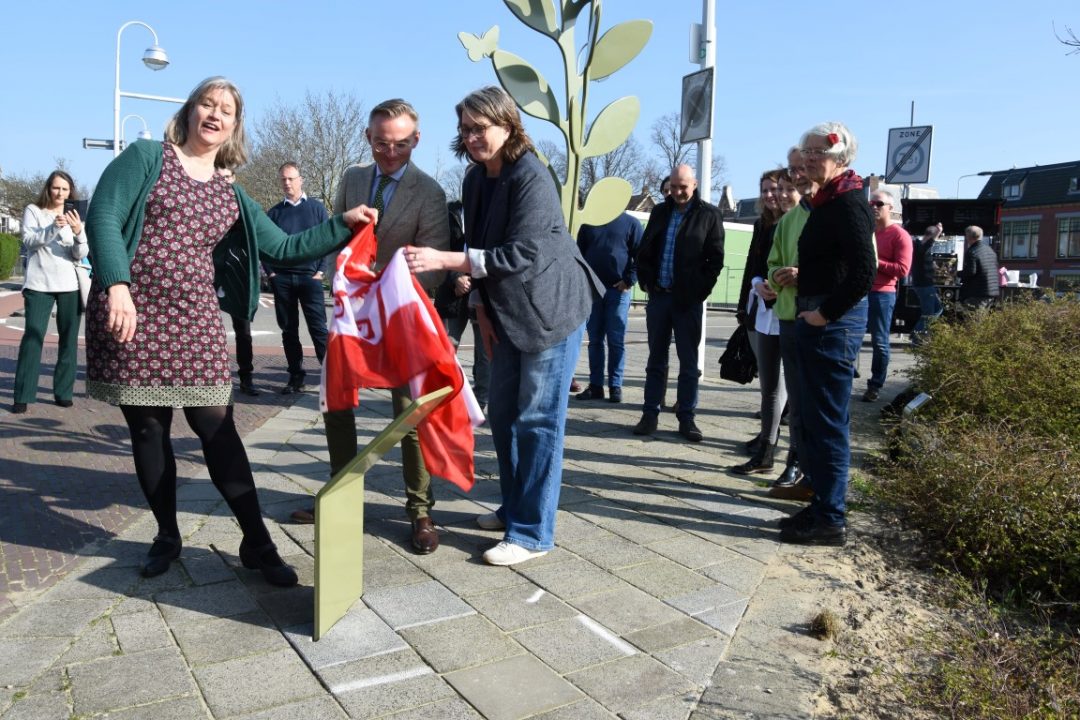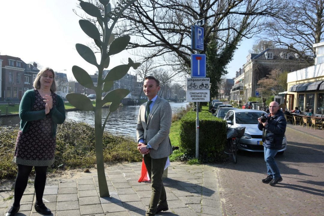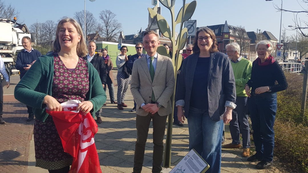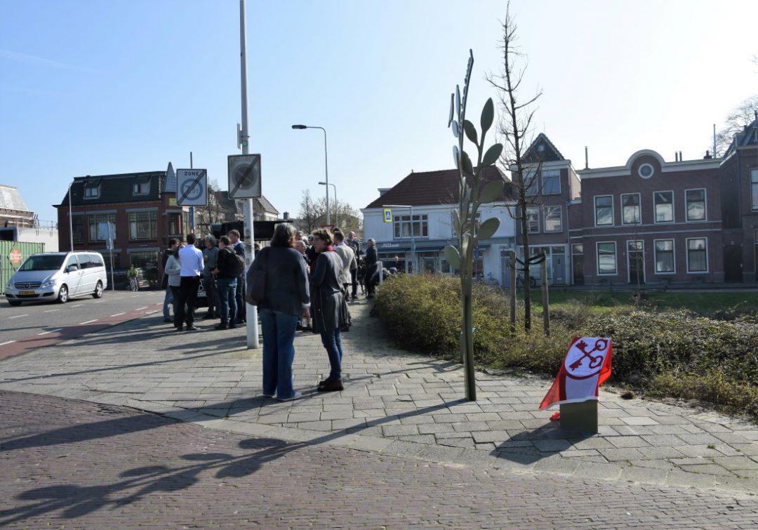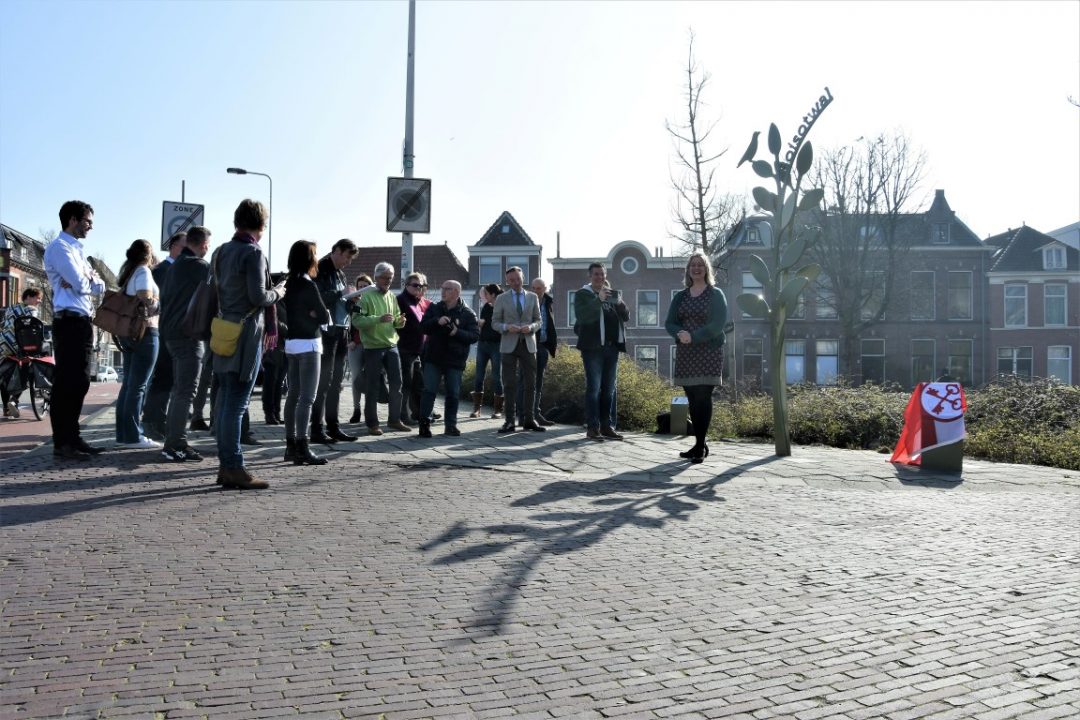 Chris de Waard was bij de onthulling op de plek waar de Jan van Houtkade over gaat in de Boisotkade en sprak met wethouder Martine Leewis, Holland Rijnland-bestuurder Nanning Mol en Claudia Brown van de Vrienden van het Singelpark.