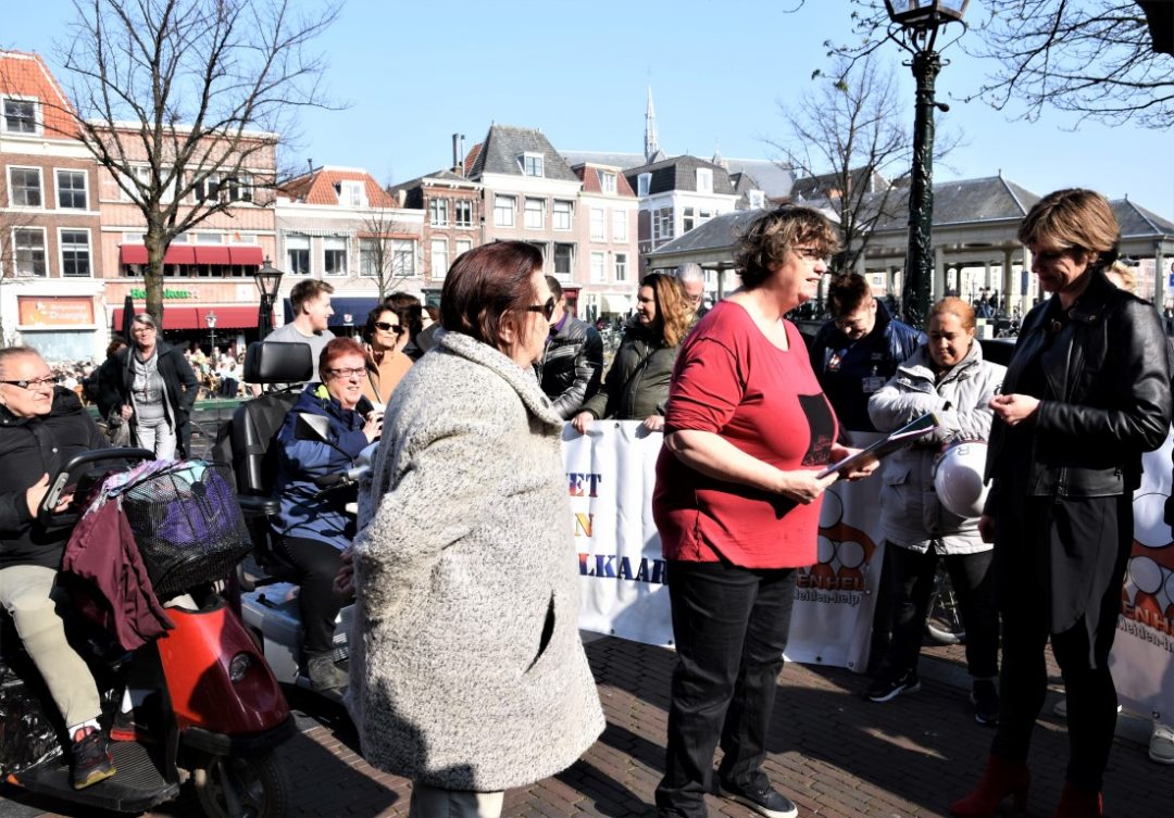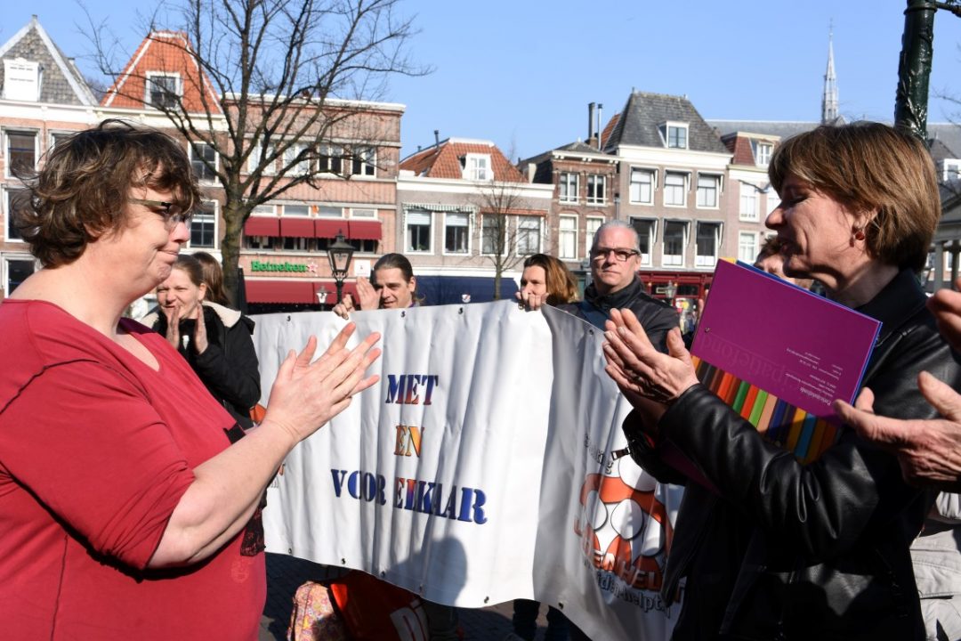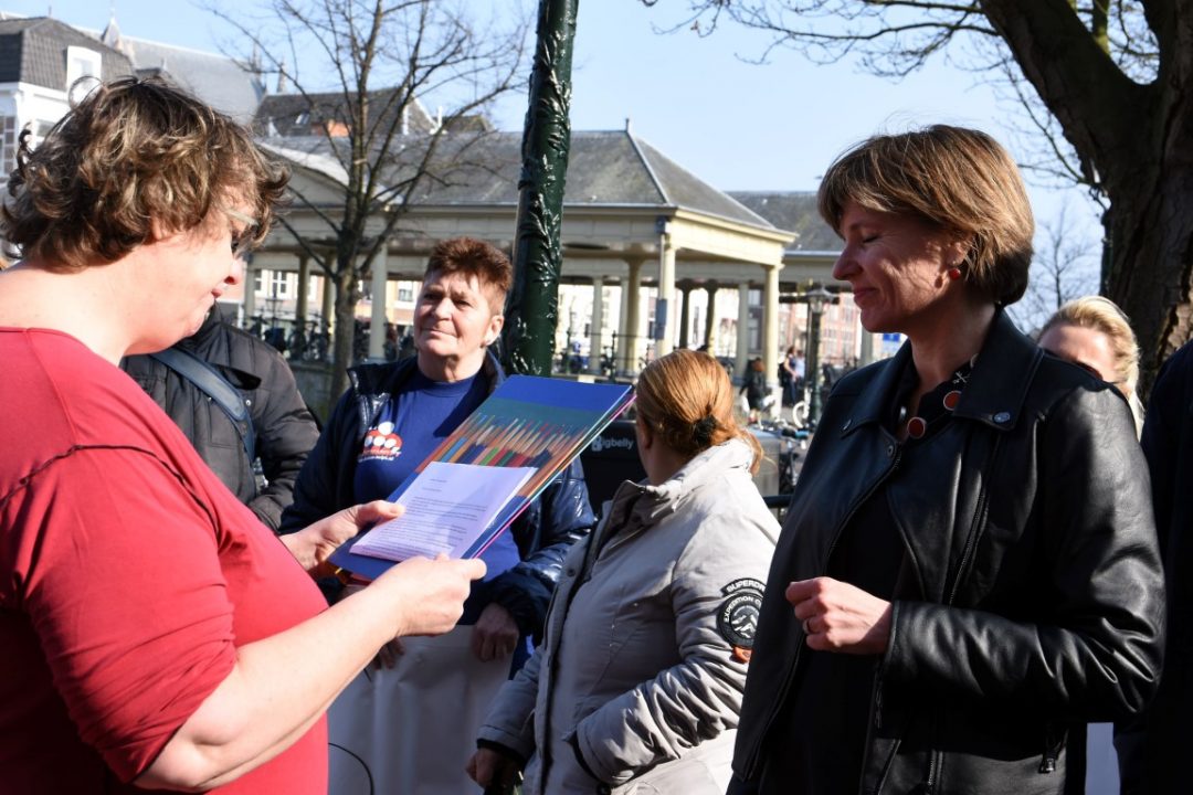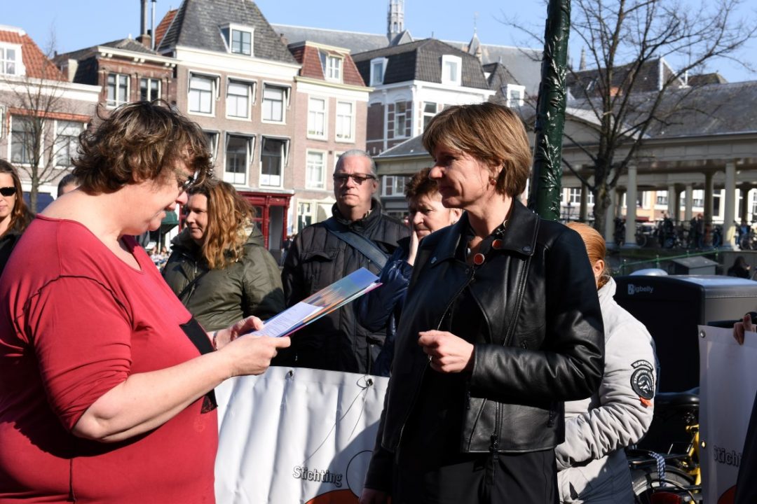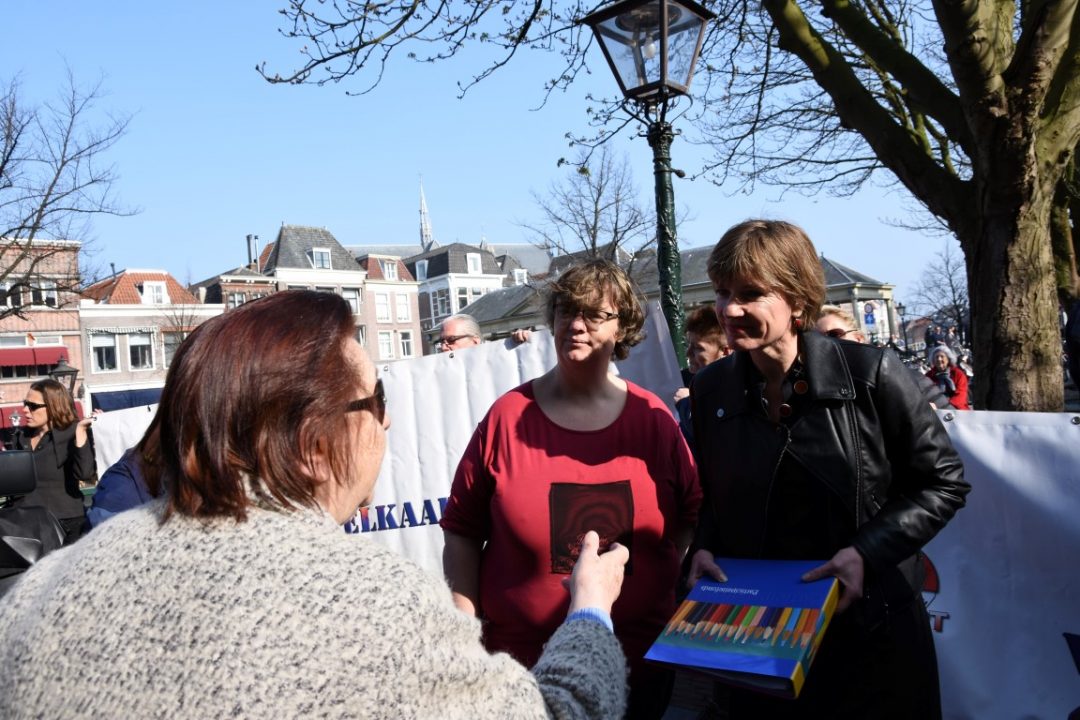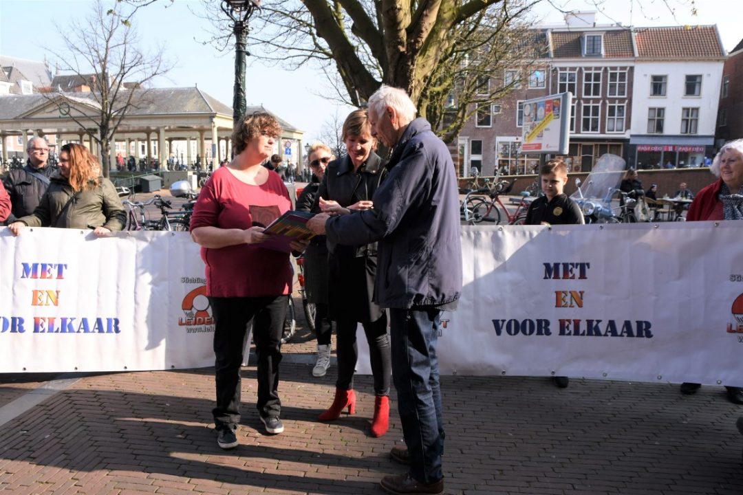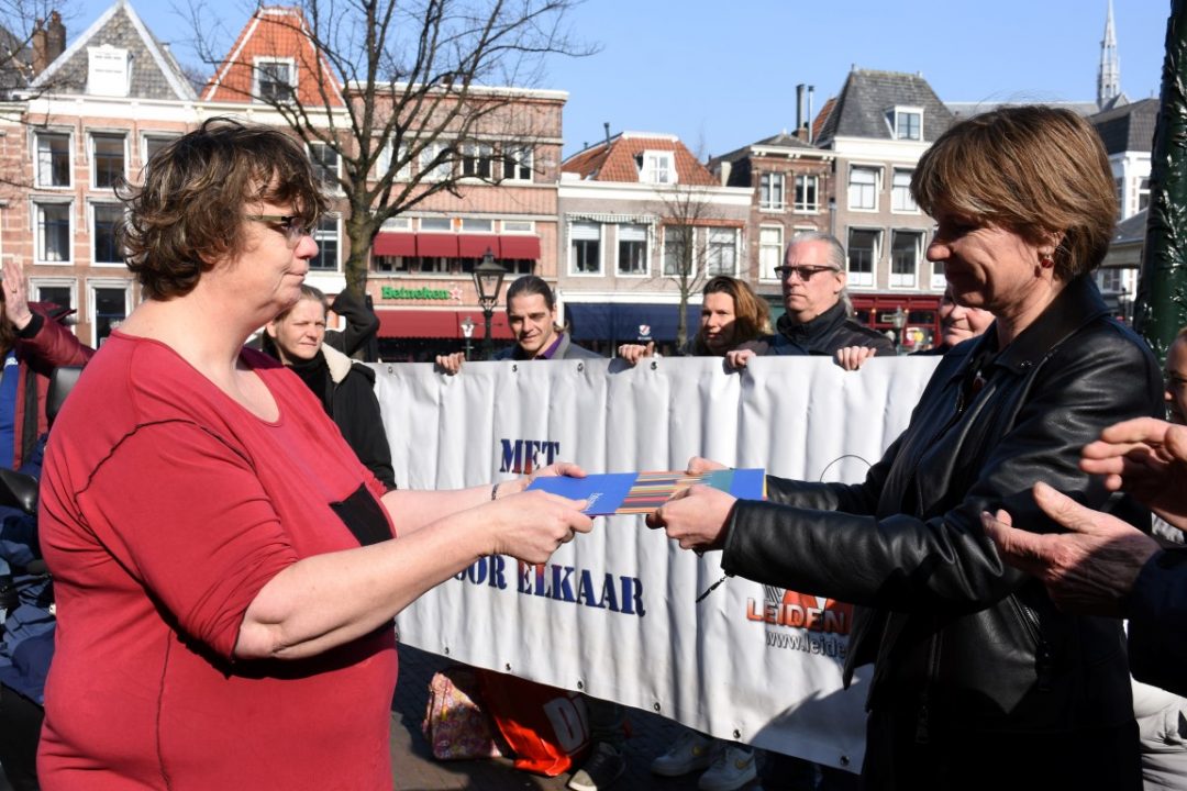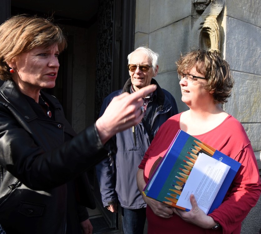 De wethouder neemt de map met handtekeningen mee naar binnen. Een nieuw gesprek is altijd mogelijk en het laatste woord is zoals altijd aan de Leidse gemeenteraad.