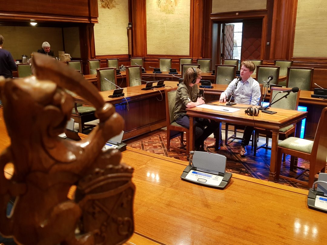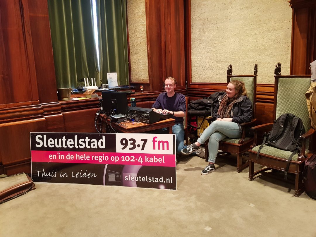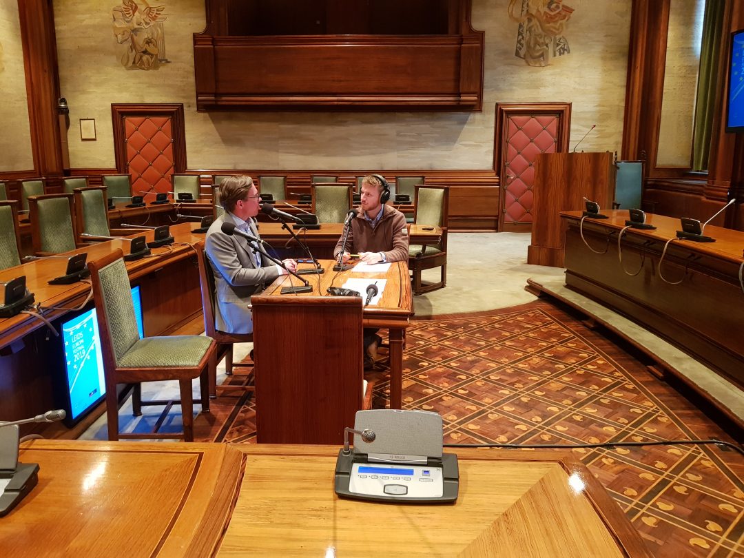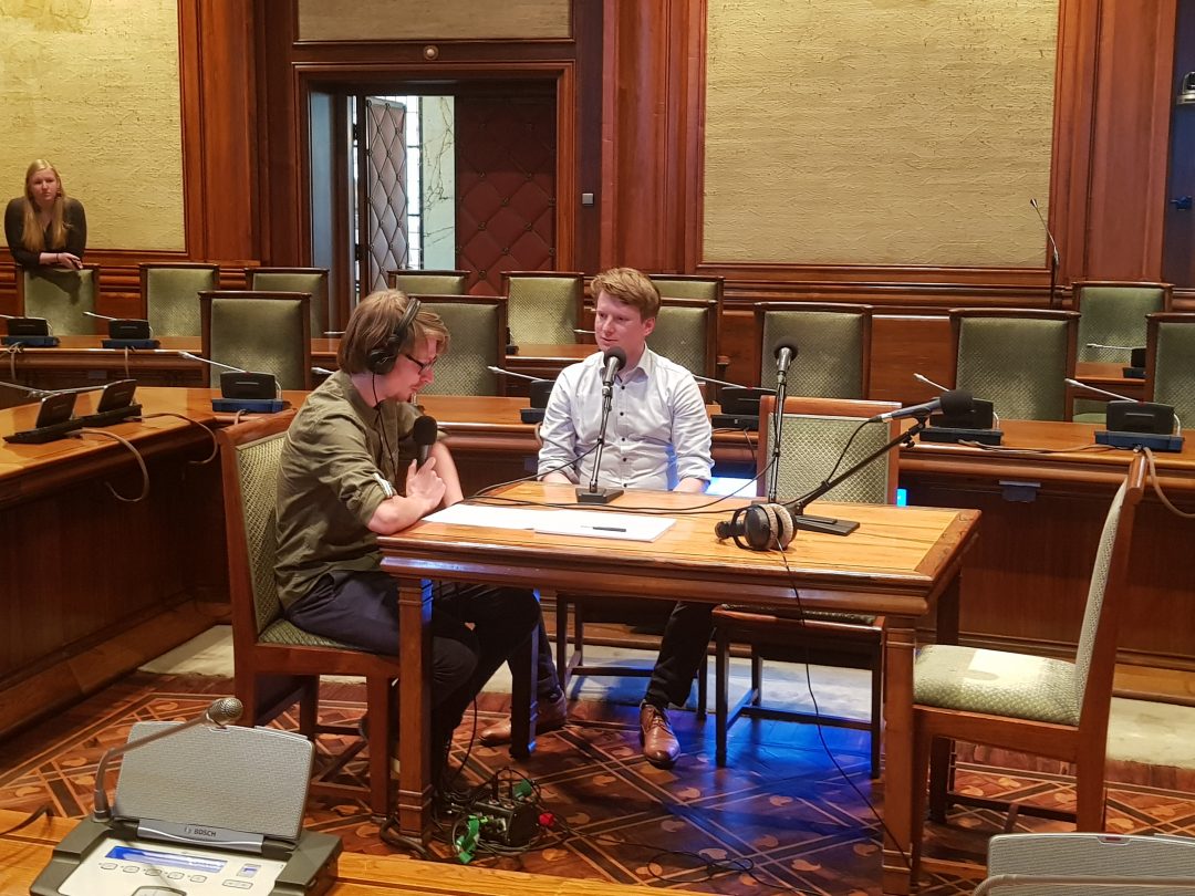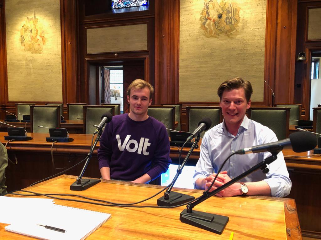 Thijs Langeveld van VOLT en D66-raadslid uit Leiden Sander van Diepen in Politiek071 vanuit het Stadhuis van Leiden