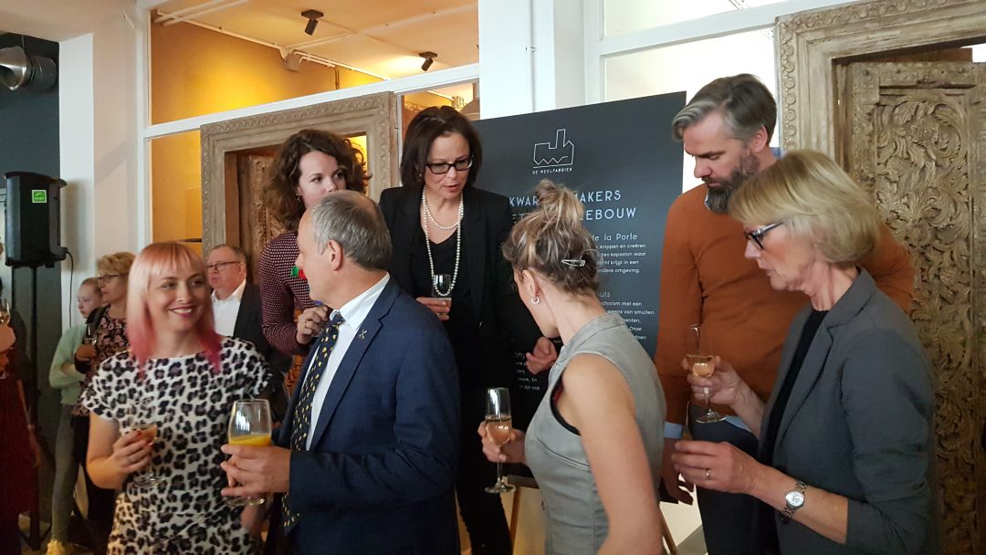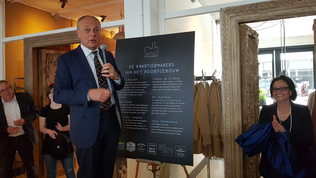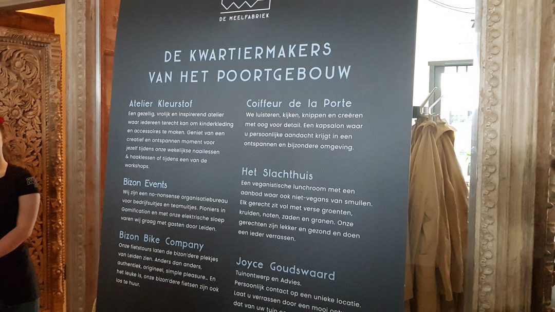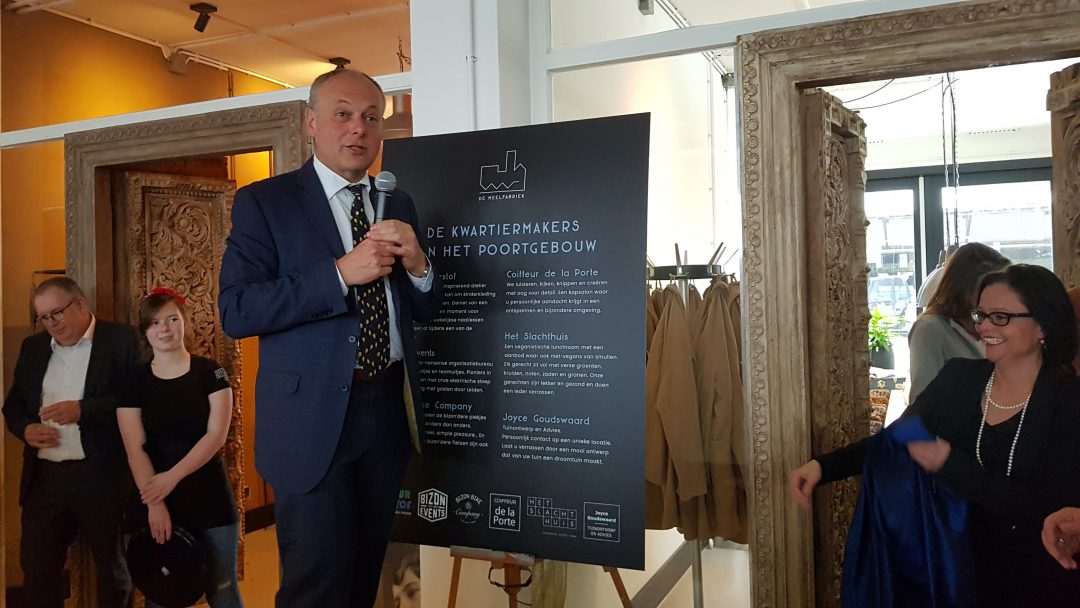 Burgemeester Lenferink heeft donderdagmiddag het Poortgebouw bij De Meelfabriek aan de Oosterkerkstraat in Leiden geopend. Daarmee heeft de Meelfabriek nu voor het eerst de deuren echt voor het publiek geopend. In het poortgebouw delen zes bedrijven één gemeenschappelijke ruimte. Lenferink: “Als je binnenstapt dan voel je het al. Het bruist hier. Dit is iets nieuws en voelt tegelijk vertrouwd. Dit toont de toekomst van Leiden”.