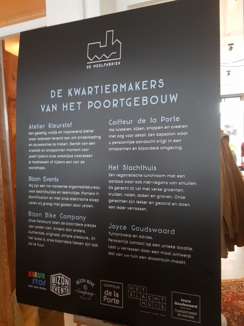 De vijf ondernemers die voor enkele jaren het avontuur aangaan op de gedeelde werkvloer zijn Atelier Kleurstof, Bizon Events en Bizon Bikes, Coiffeur de la Porte, Joyce Goudszwaard tuinontwerp en advies en veganistisch lunchroom Het Slachthuis.