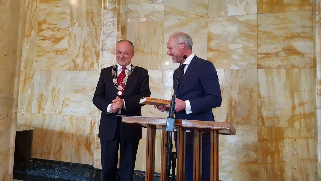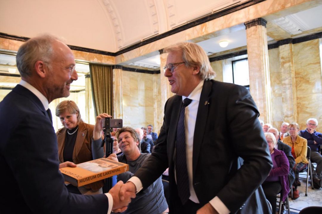 Wie jarig is trakteert en dat geldt ook voor de Vereniging Belangstellenden in Museum de Lakenhal (VBL) die gisteren het eeuwfeest vierde met een bijeenkomst in de Burgerzaal van het Leidse stadhuis. Voorzitter Haro Schultz van Haegen overhandigde de eerste exemplaren van het Museumboek waar twee jaar aan is gewerkt aan burgemeester Lenferink, commissaris van de Koning Jaap Smit, museumdirecteur Meta Knol en cultuurwethouder Yvonne van Delft. Het boek beschrijft 145 jaar Lakenhal in Leiden.