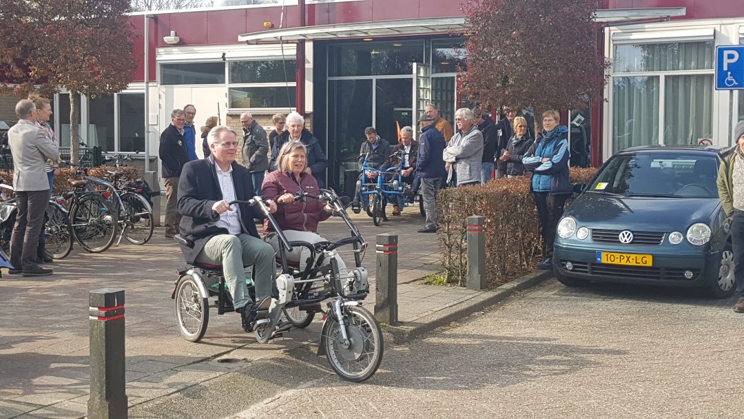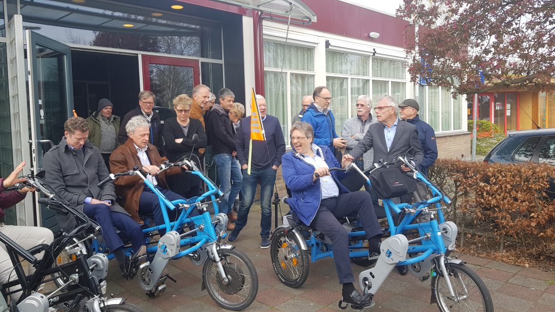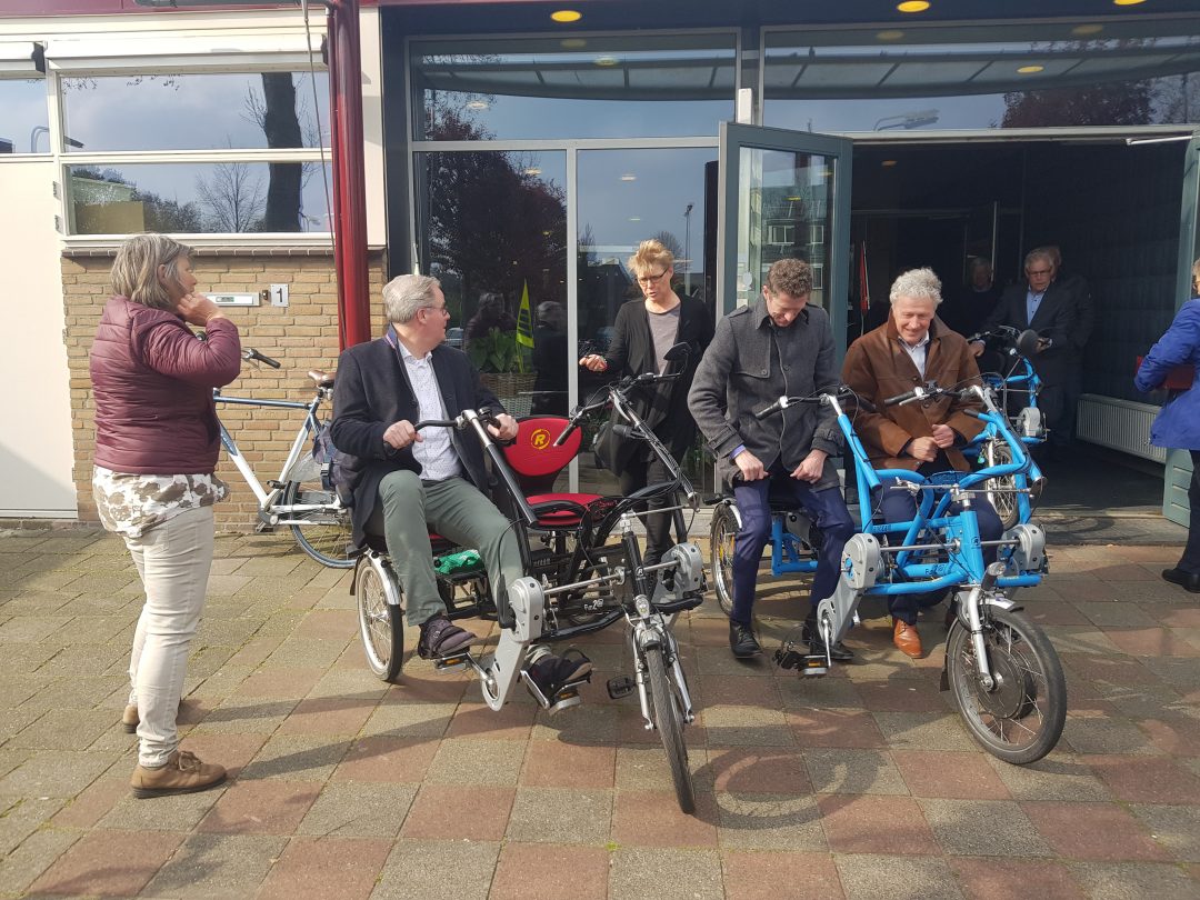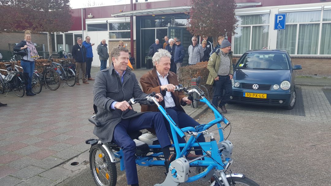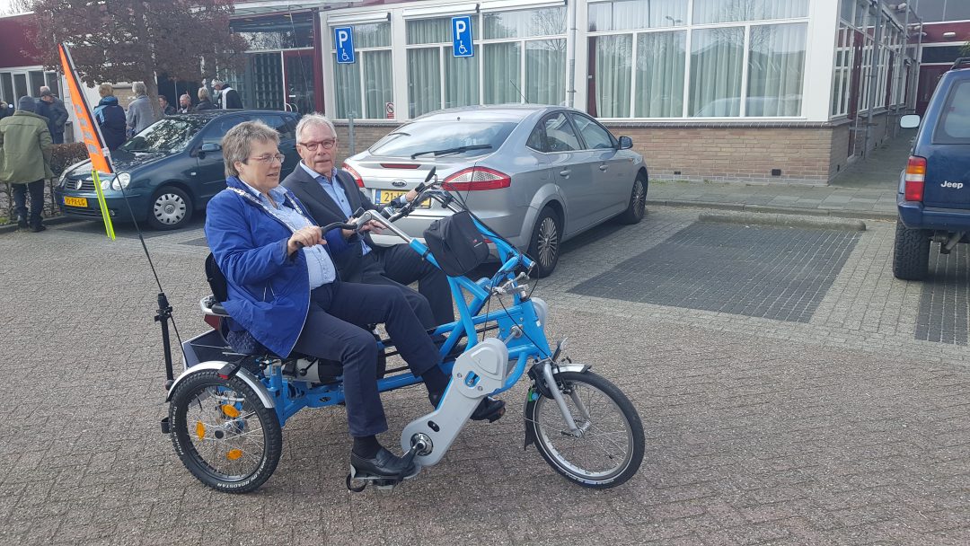 Eigenlijk reden de Fietsmaatjes Zoeterwoude al een tijdje met twee elektrische duofietsen rond, maar vanmorgen werd het tweede exemplaar ook nog officieel in gebruik genomen. Dat gebeurde tijdens een bijeenkomst in De Eendenkooi in Zoeterwoude-Rijndijk waar het voltallige college van burgemeester en wethouders plaatsnam in een duofiets voor een rondje over het parkeerterrein.
