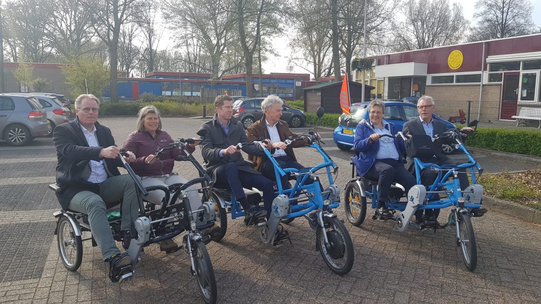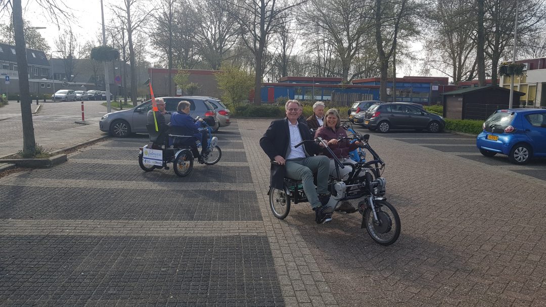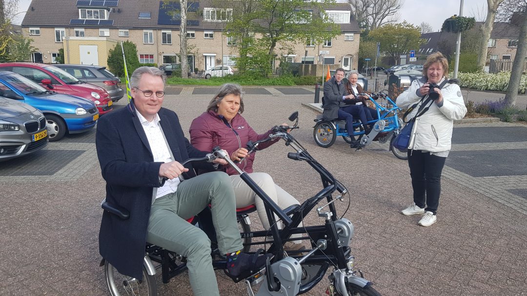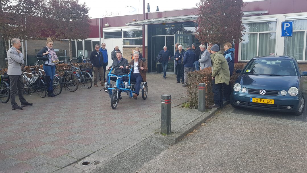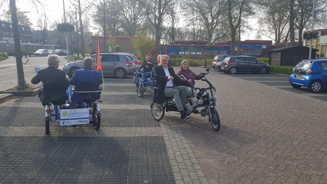 Eigenlijk reden de Fietsmaatjes Zoeterwoude al een tijdje met twee elektrische duofietsen rond, maar vanmorgen werd het tweede exemplaar ook nog officieel in gebruik genomen. Dat gebeurde tijdens een bijeenkomst in De Eendenkooi in Zoeterwoude-Rijndijk waar het voltallige college van burgemeester en wethouders plaatsnam in een duofiets voor een rondje over het parkeerterrein.