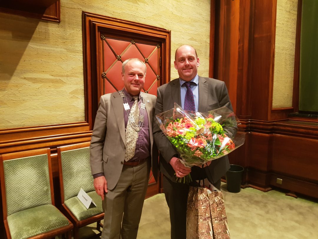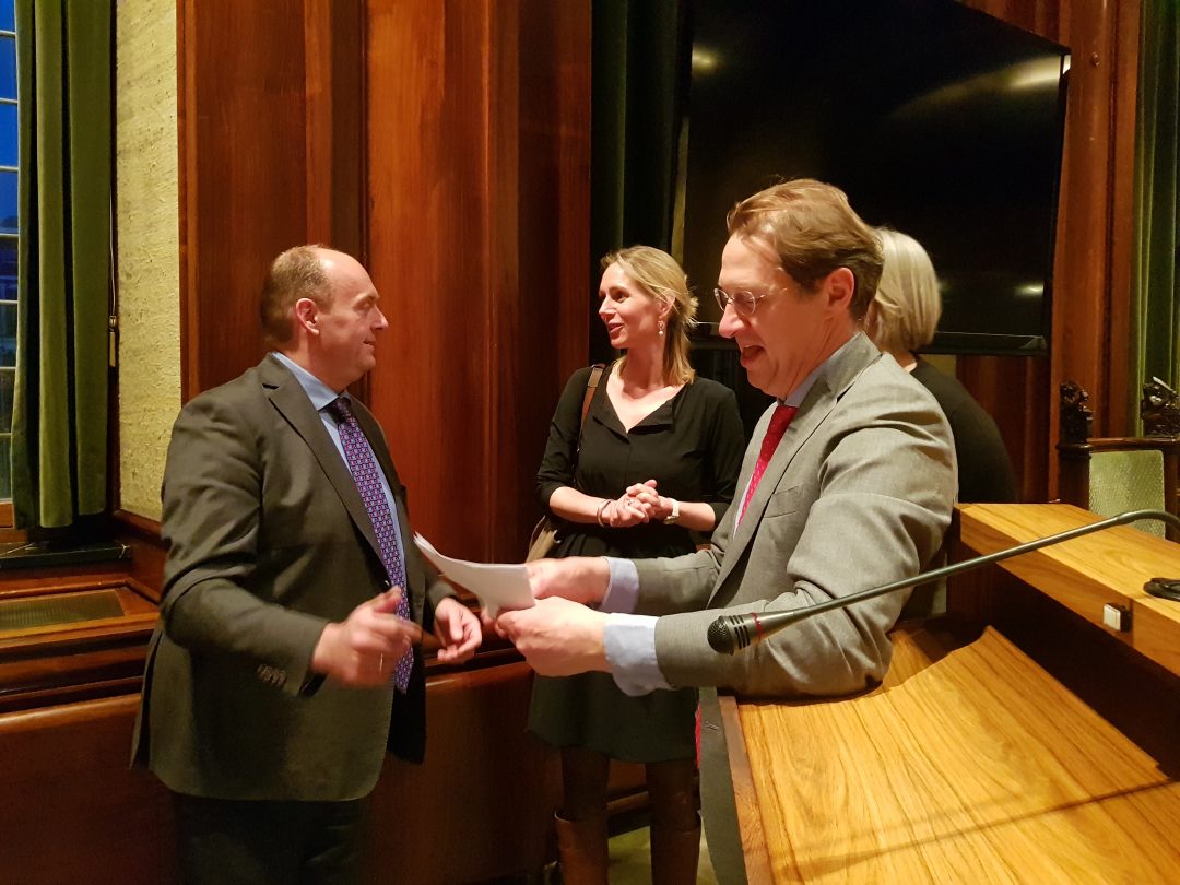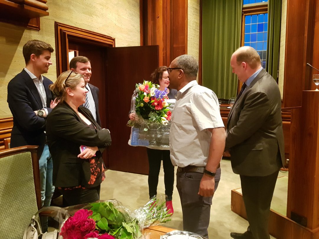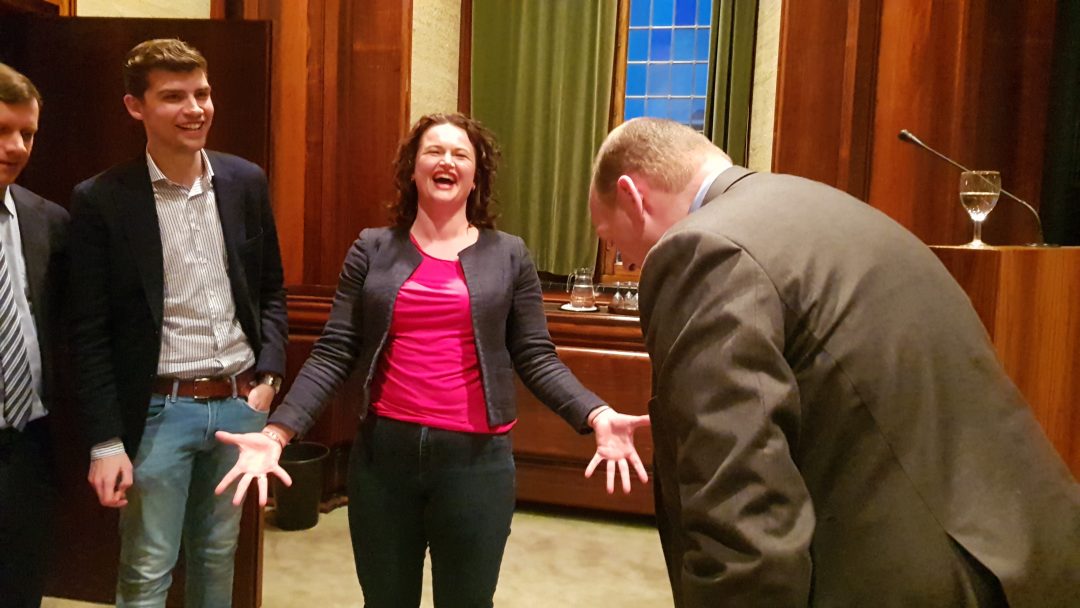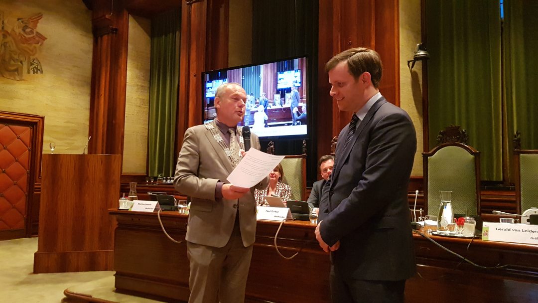 GroenLinks Leiden fractievoorzitter Ashley North sprak als gastverslaggever met de afscheid nemende Frederik Zevenbergen.