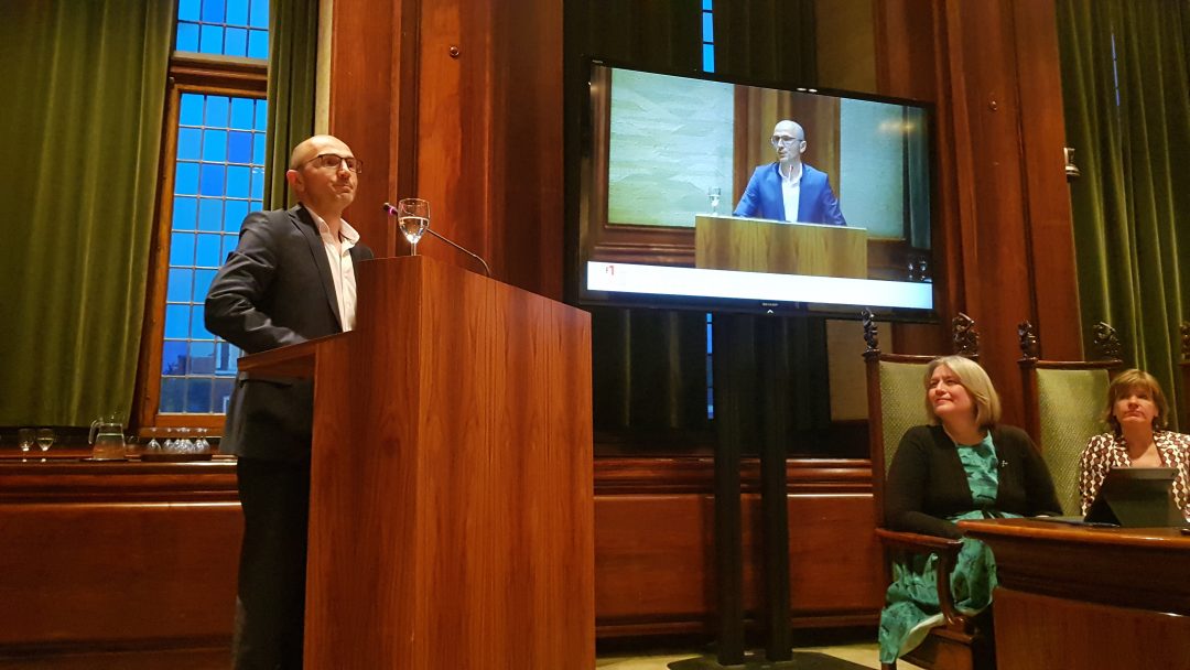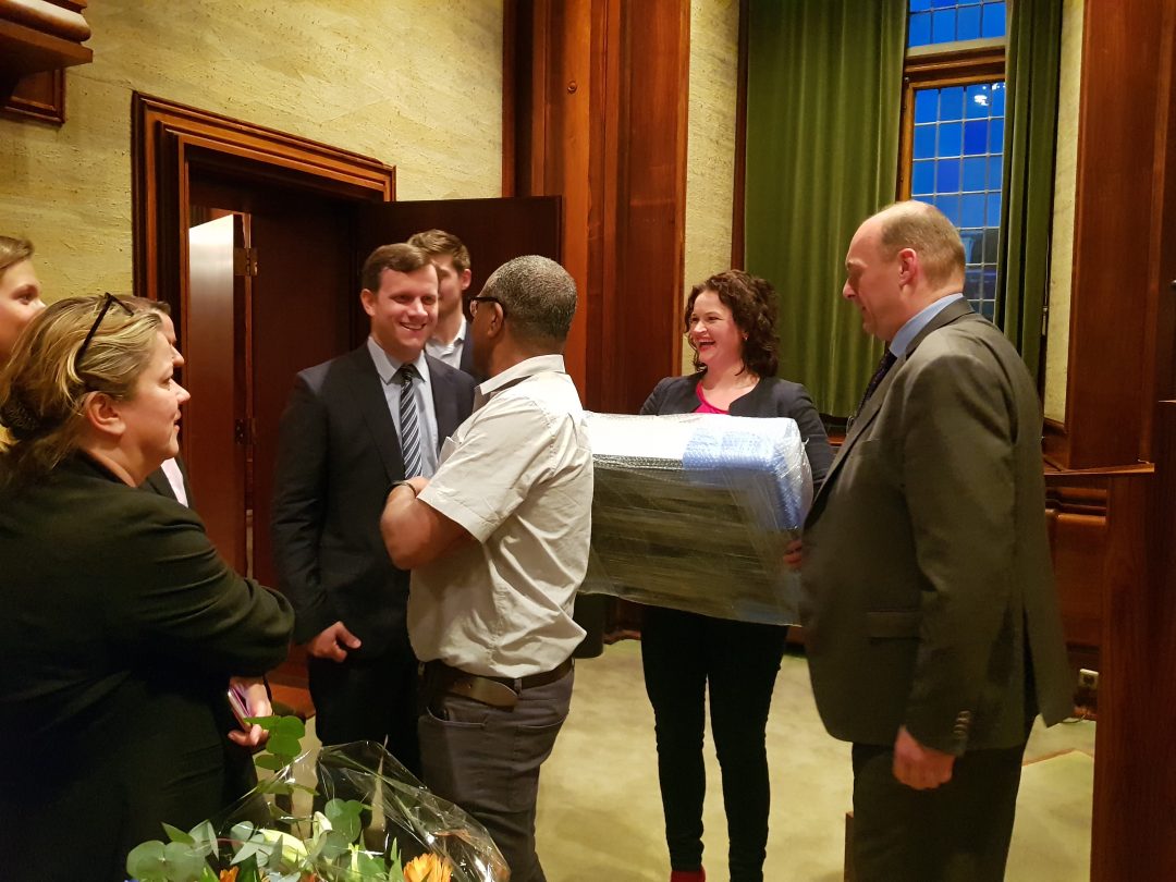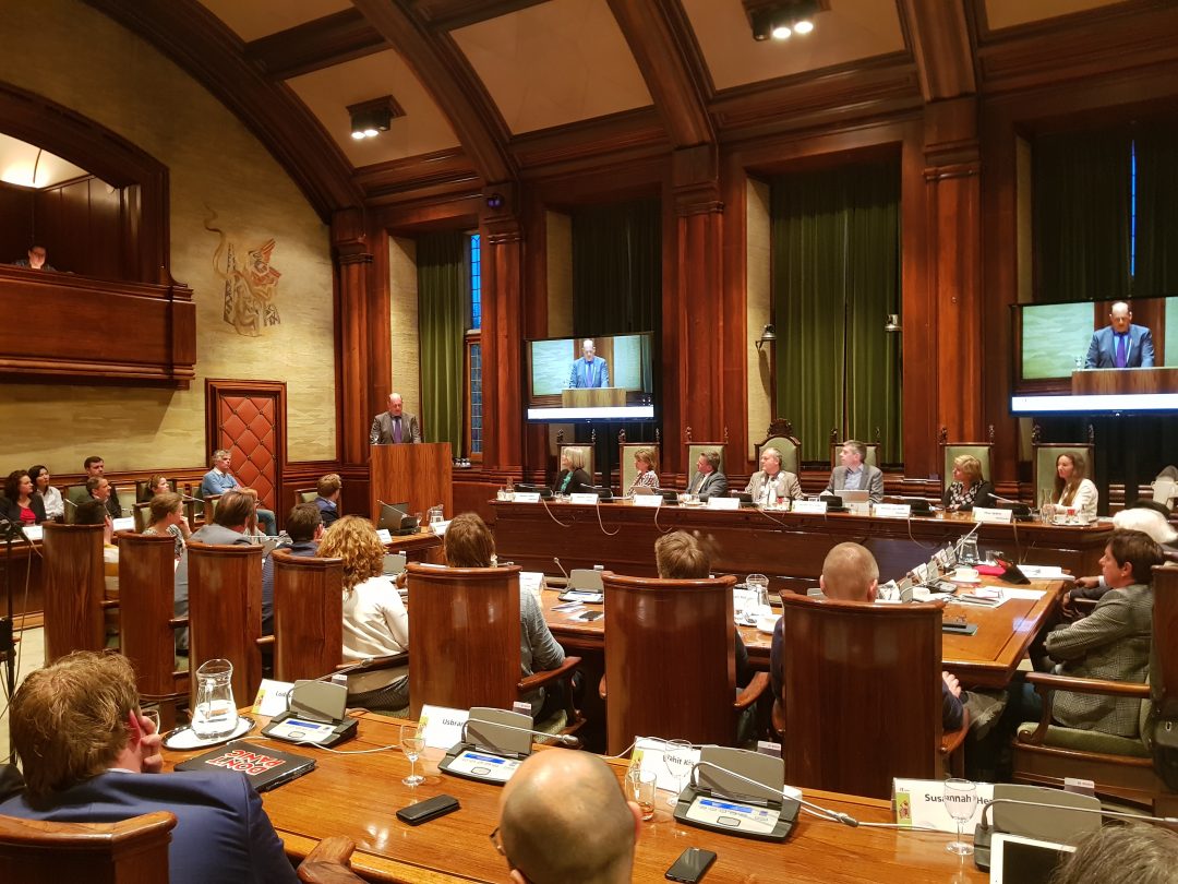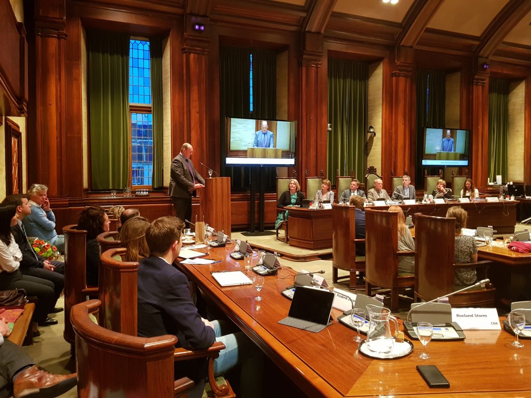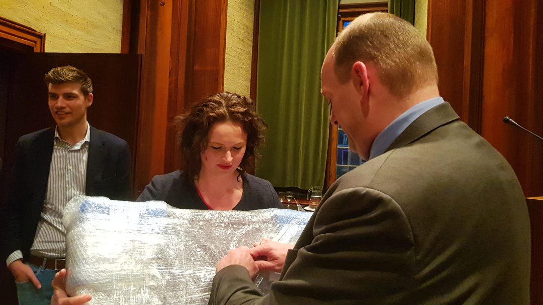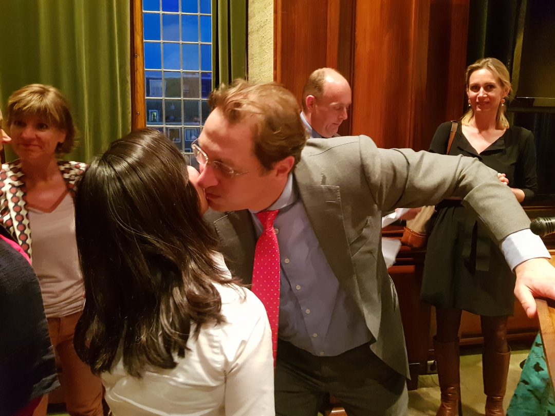 GroenLinks Leiden fractievoorzitter Ashley North sprak als gastverslaggever met de afscheid nemende Frederik Zevenbergen.