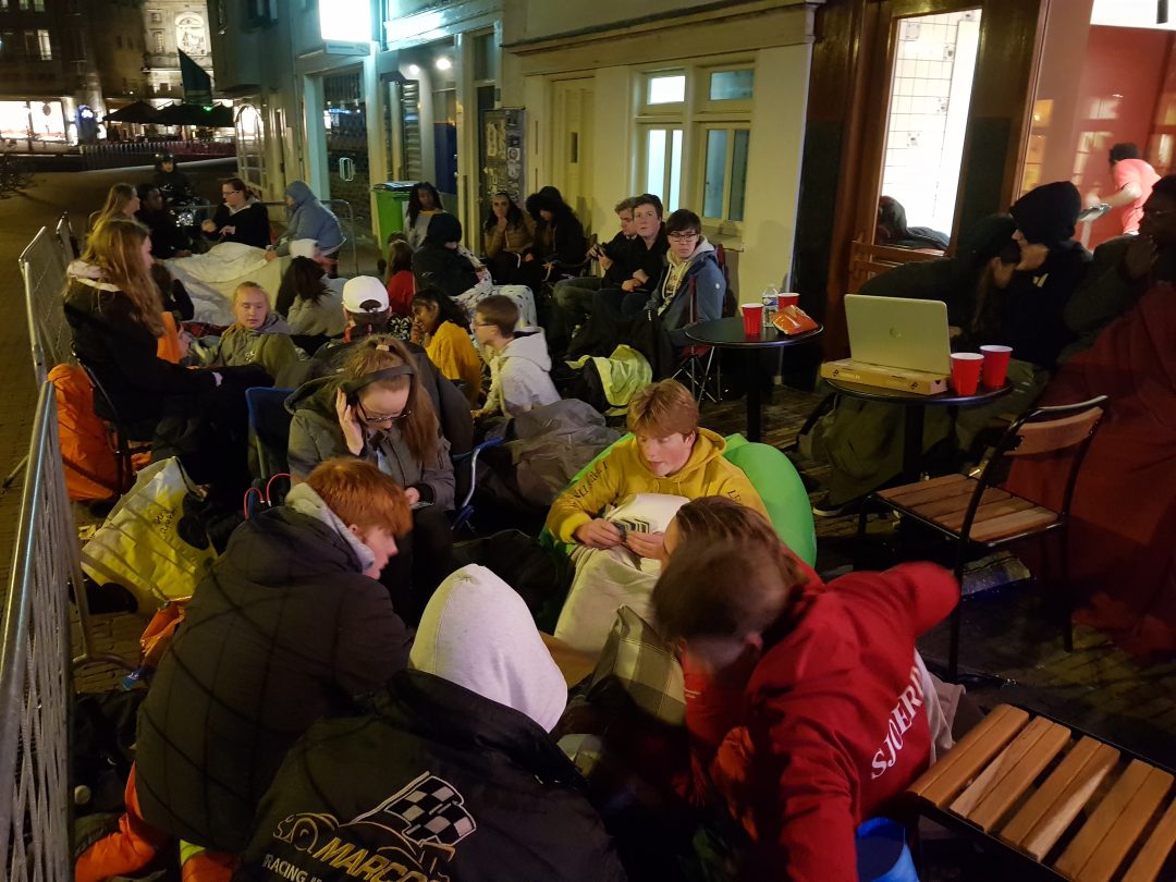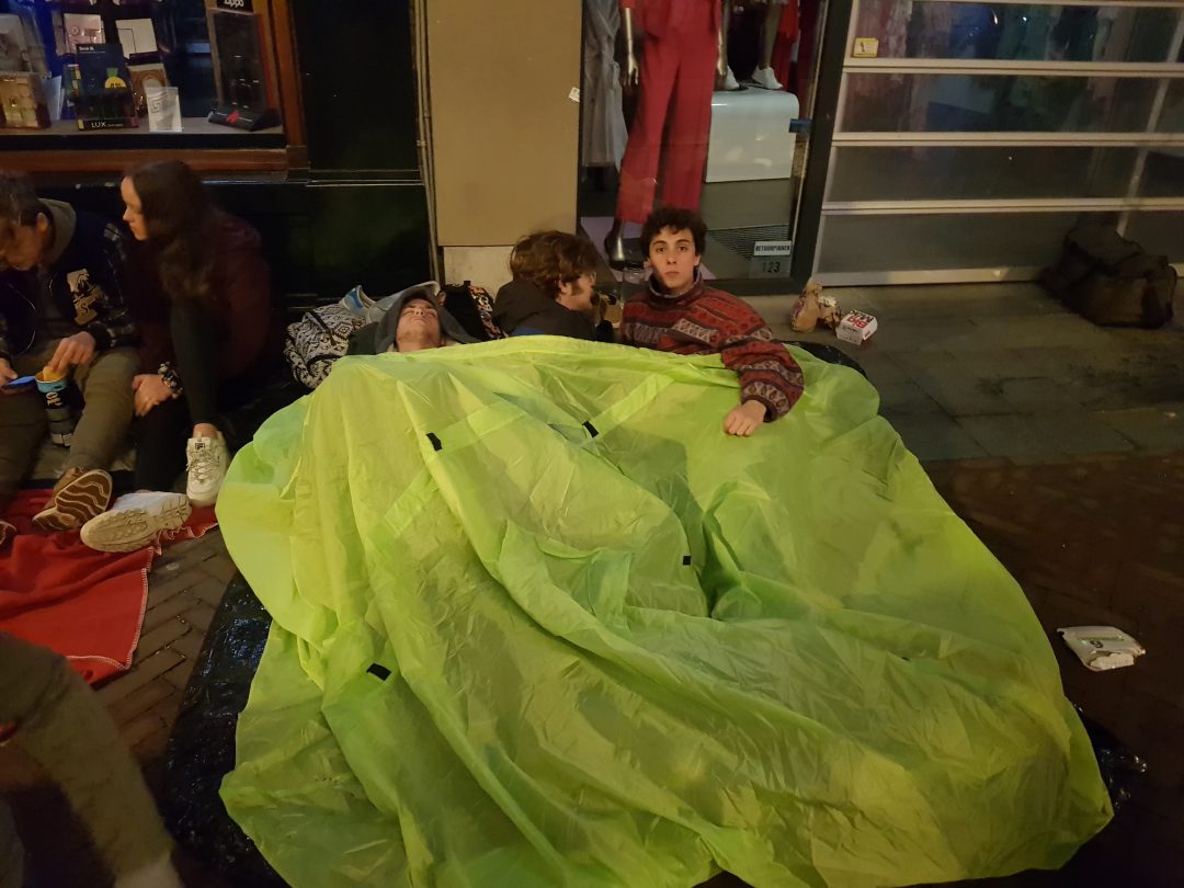 Niet iedereen is blij met de mensenmassa in de straat. Op twee hoog gaat een raam open. Een anonieme arm kiepert een emmer koud water naar beneden. Een voltreffer. De persoon in kwestie wil slapen en baalt van de herrie. Meegebrachte radio’s gaan uit, mensen manen elkaar tot stilte. Voor twee van hen komt dat te laat. Ze zijn doorweekt en twijfelen of ze nog zeven uur blijven. Zo lang duurt het nog voordat de poorten van het paradijs opengaan.