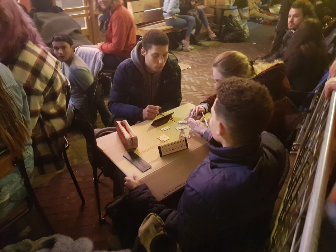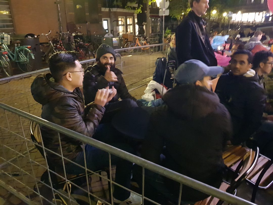 “Volgens mij waren wij hier als eerste”, zegt een jongen vanachter de hekken die tijdelijk om de nieuwe donutshop zijn gezet. Ingehuurde bewakers lopen er langs en roepen de volgnummers om te controleren of iedereen er nog wel is. “Vijfenveertig? Niemand vijfenveertig?” vraagt de bewaker. “Misschien moet je het in het Engels proberen”, suggereert iemand. Er zijn inderdaad veel anderstaligen onder de donutliefhebbers.