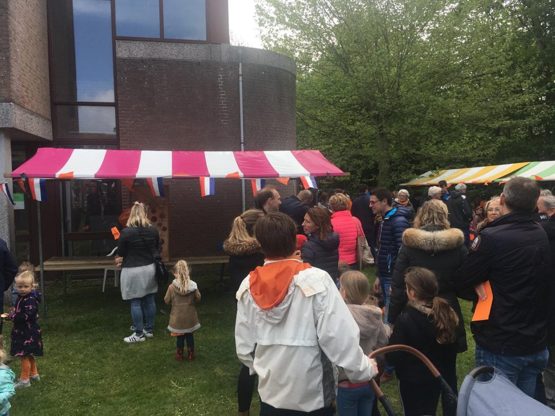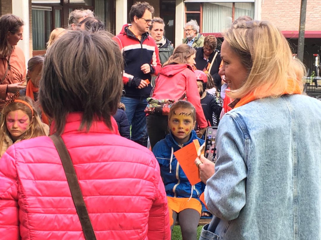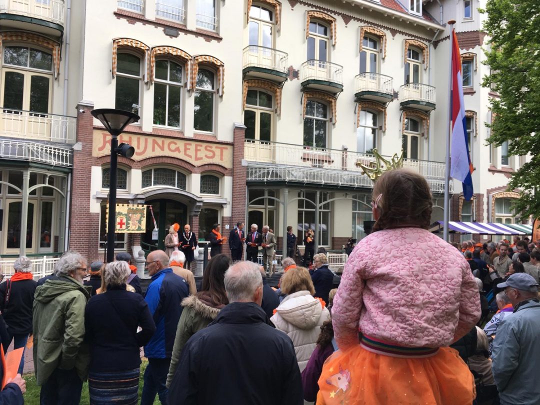 Veel mensen kozen ervoor om naar het gemeentehuis te komen en mee te zingen tijdens de aubade. Jong en oud verzamelden zich getooid in het oranje onder de groene bomen. Wie de liederen niet uit het hoofd kon meezingen, kon spieken in de liedteksten die door de Oranjeverenging werden uitgedeeld.