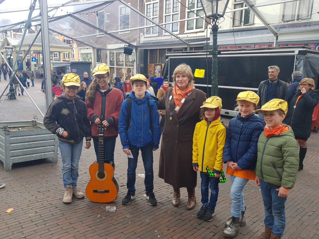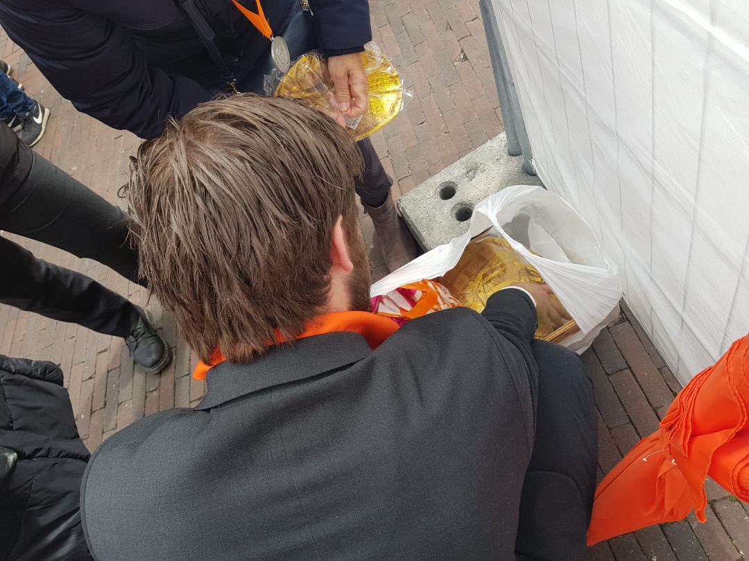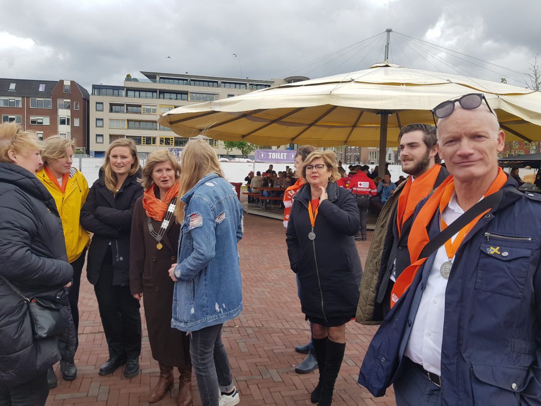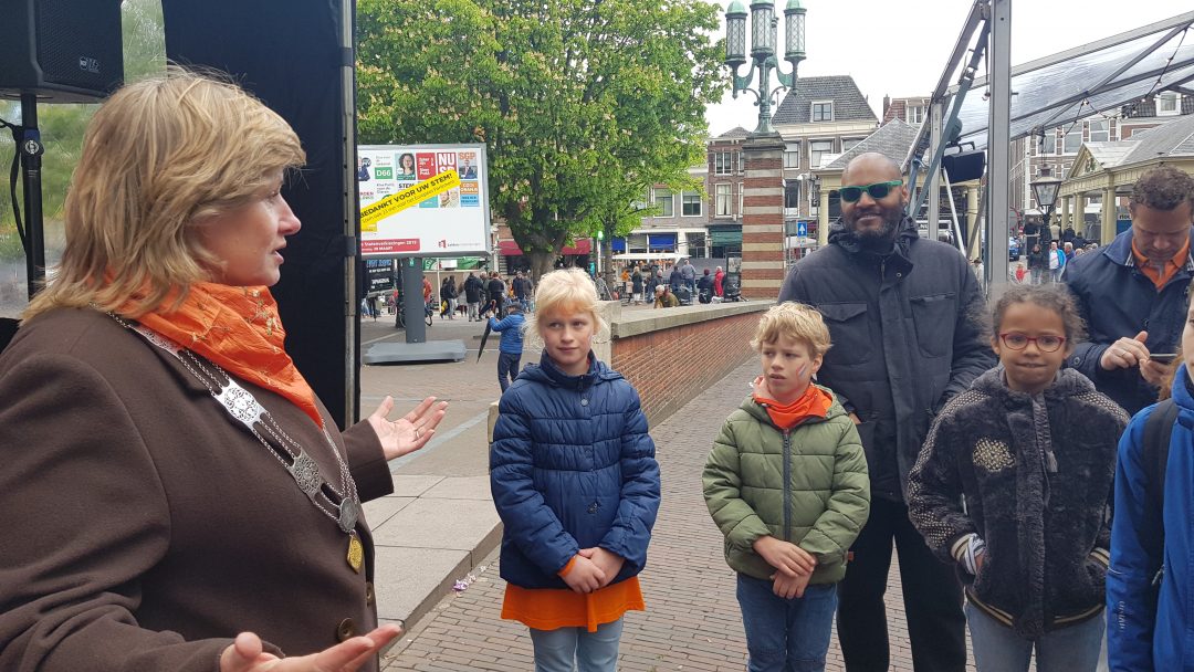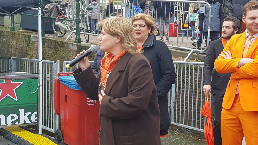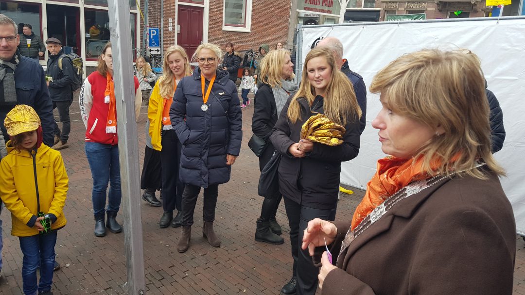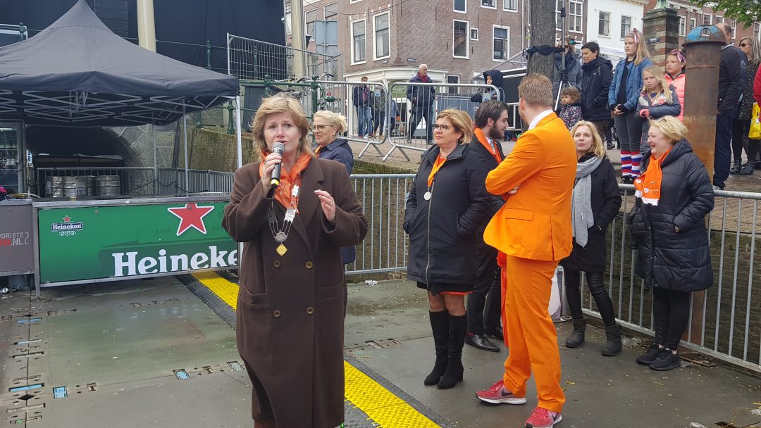 De traditionele rondgang langs de verschillende activiteiten door het bestuur van de Oranjevereniging en bestuursleden van de grote studentenverenigingen stond dit jaar niet onder leiding van burgemeester Lenferink. Die las ziek op bed. Zijn taken werden zaterdag waargenomen door locoburgemeester Yvonne van Delft die zichtbaar plezier beleefde aan het oranje rondje door de stad.