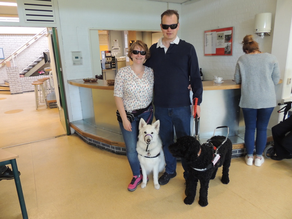 Van Egmond en Waalboer zijn allebei blind en hebben allebei hun hond bij zich, zoals ook een paar andere bezoekers. De honden begroeten elkaar nog enthousiaster dan hun eigenaren. “Het blijven wel honden natuurlijk. Ze zijn blij elkaar te zien.” Voor zowel Waalboer als Van Egmond betekent hun hond heel veel. Van Egmond: “Ik heb een witte herder en ze heet Dixie, dat betekent ‘onafhankelijk”. Dat heeft ze mij gebracht.” Haar partner Waalboer heeft een zwarte Labradoodle die luister naar de naam Ona. “Vroeger kende ik alleen de route van mijn werk naar huis, nu reis ik met Ona het hele land door. De sky is de limit.”