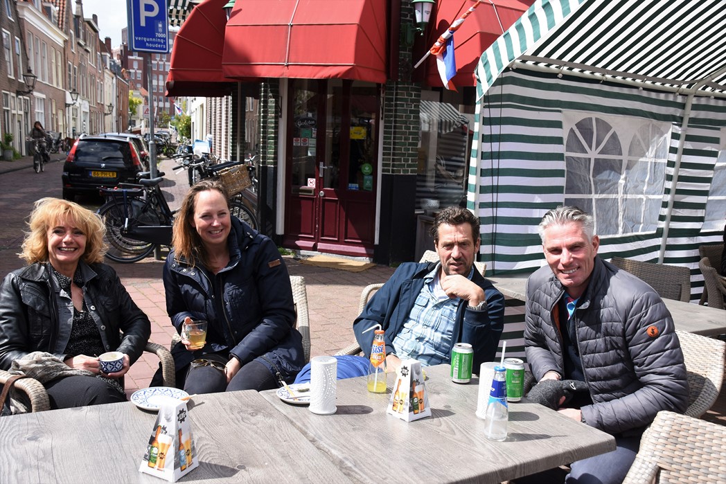 Verslaggeefster Gerry van Bakel in gesprek met José Mesman, Aniek Honsbeek en Hans van Ommeren van Leiden Road Runners Club.