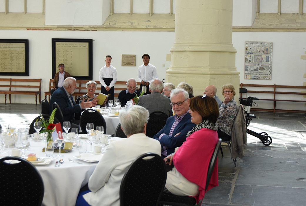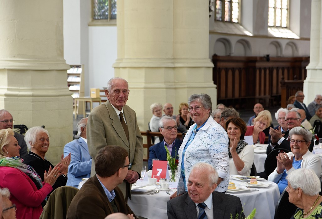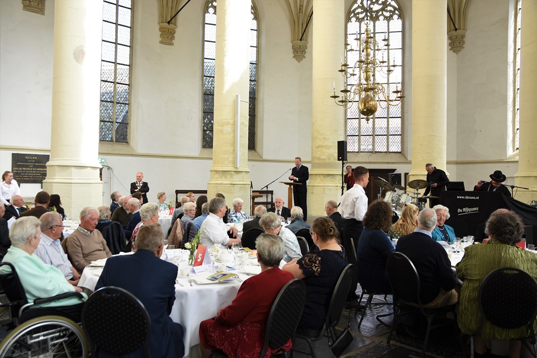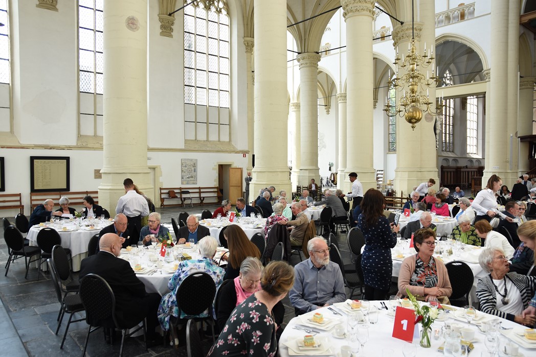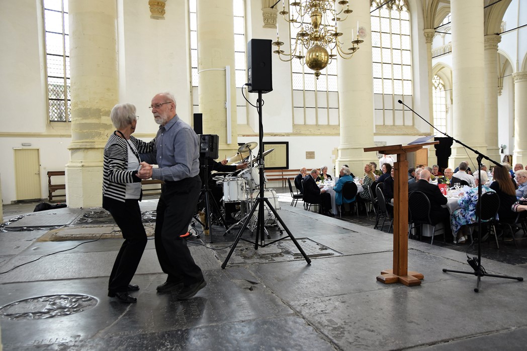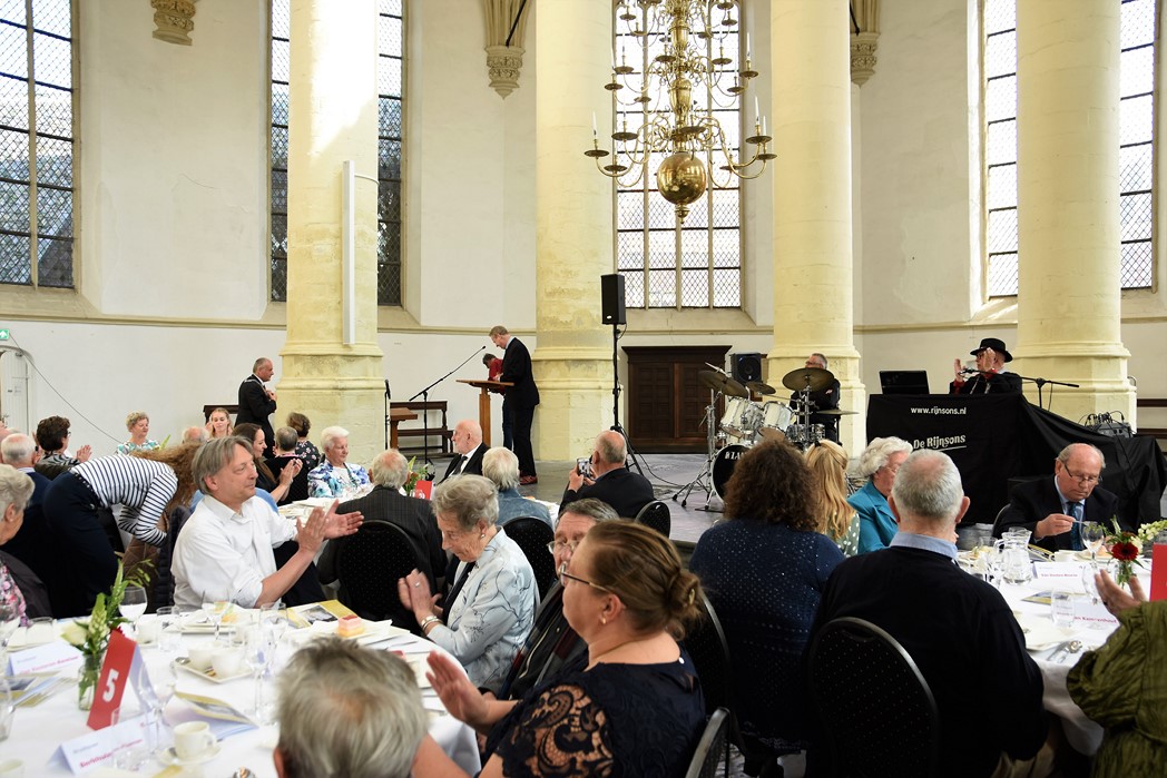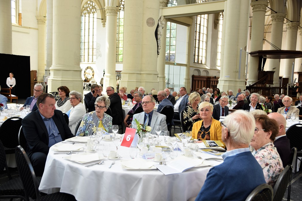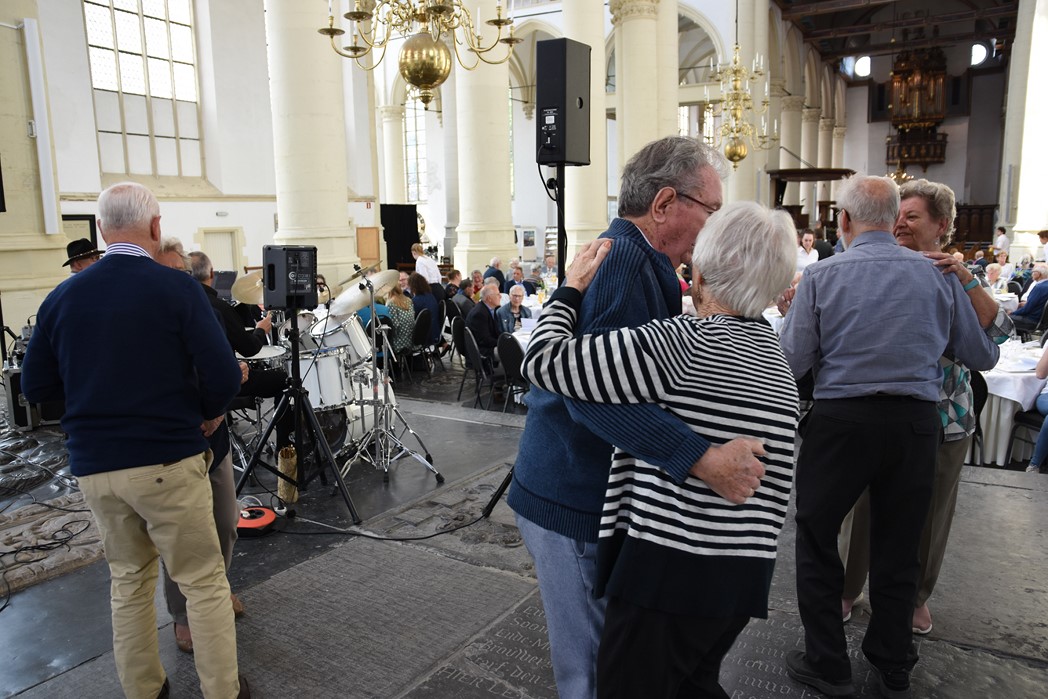 Maandagmiddag was in de Hooglandsekerk de jaarlijkse bruidsparenmiddag. Leidse bruidsparen die 60-, 65- of 70 jaar getrouwd zijn waren uitgenodigd voor een gezellige lunch.Burgemeester Henri Lenferink prees de echtparen voor hun doorzettingsvermogen. Er waren 51 bruidsparen naar de lunch gekomen waarvan zelfs 1 echtpaar dat 70 jaar getrouwd is. Normaal mag je eens in de 5 jaar komen, maar als u 70 of meer jaren getrouwd bent dan bent u elk jaar welkom vertelde de burgemeester. Na de toespraak en het zingen van het Leids Volkslied, brachten de Rijnsons de stemming er direct goed in en al snel zongen de bruidsparen alle nummers mee terwijl de eerste paren zich op de dansvloer waagden.