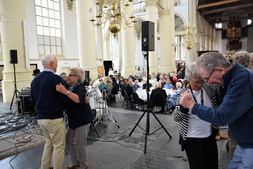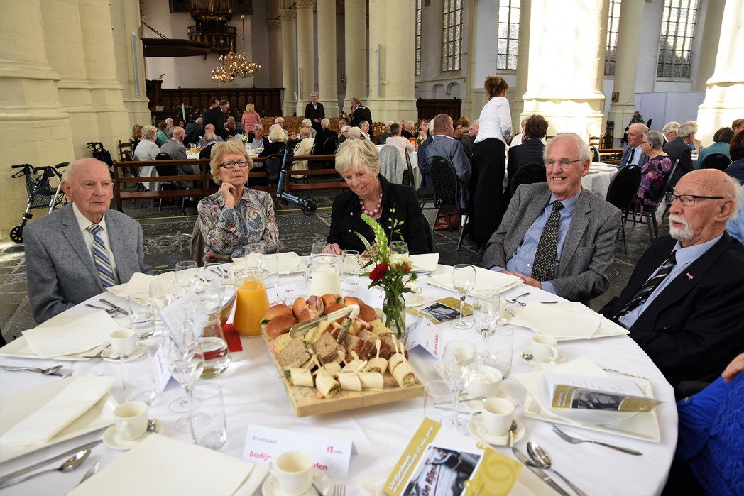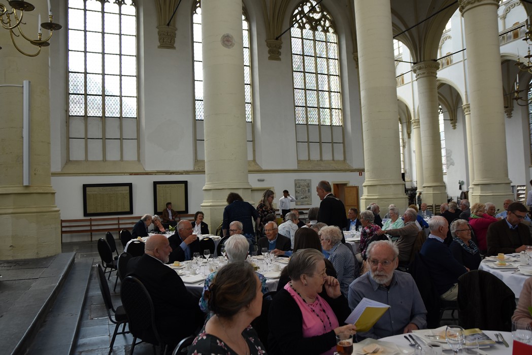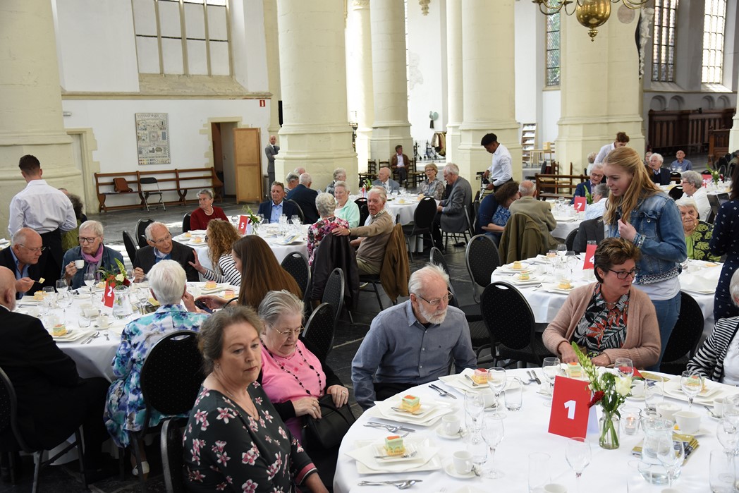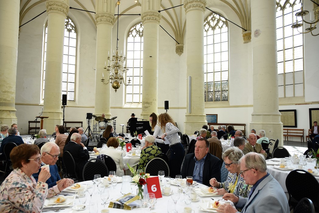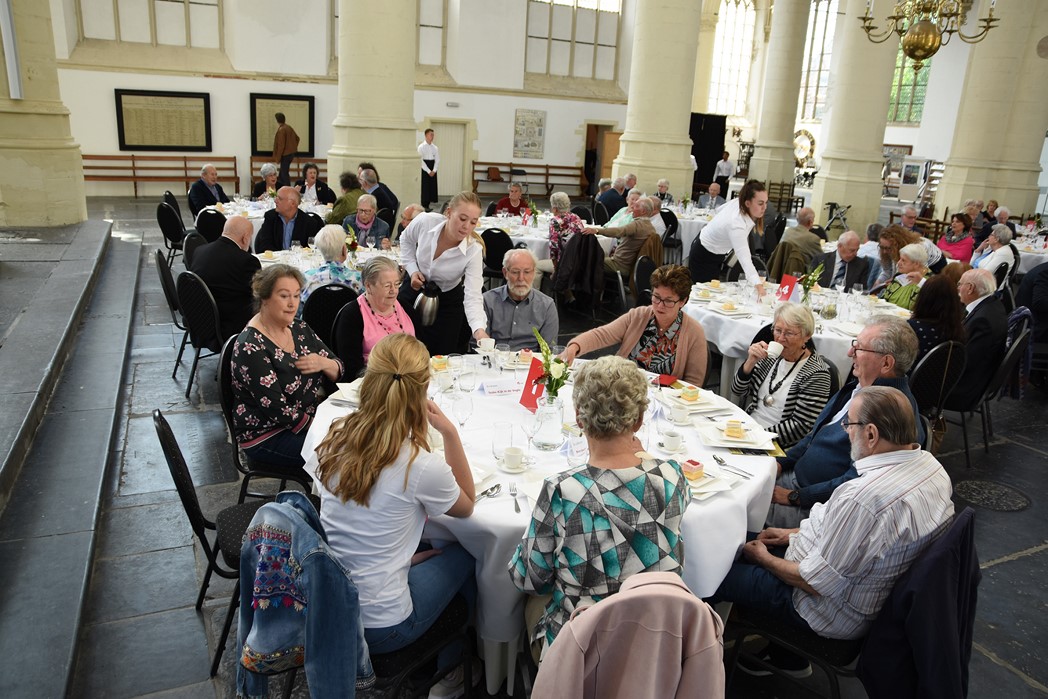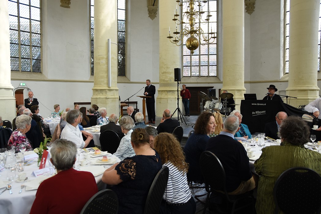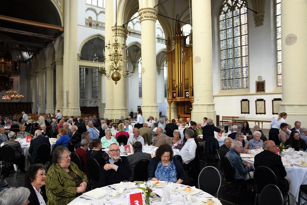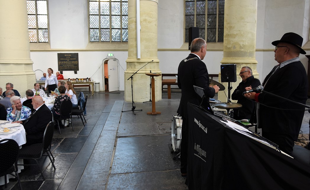 Maandagmiddag was in de Hooglandsekerk de jaarlijkse bruidsparenmiddag. Leidse bruidsparen die 60-, 65- of 70 jaar getrouwd zijn waren uitgenodigd voor een gezellige lunch.Burgemeester Henri Lenferink prees de echtparen voor hun doorzettingsvermogen. Er waren 51 bruidsparen naar de lunch gekomen waarvan zelfs 1 echtpaar dat 70 jaar getrouwd is. Normaal mag je eens in de 5 jaar komen, maar als u 70 of meer jaren getrouwd bent dan bent u elk jaar welkom vertelde de burgemeester. Na de toespraak en het zingen van het Leids Volkslied, brachten de Rijnsons de stemming er direct goed in en al snel zongen de bruidsparen alle nummers mee terwijl de eerste paren zich op de dansvloer waagden.