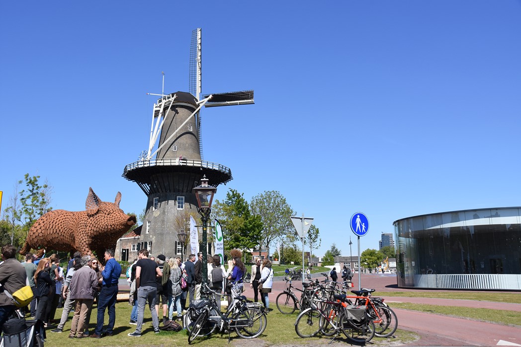 Met het lostrekken van een groen lint onthulde Thieme het enorme varken. In de stralende zon. En dat is meer dan de meeste varkens in de vee-industrie ooit zullen zien. Ook de vreugdesprong die het varken op de Lammermarkt lijkt te maken is er voor de minder fortuinlijke soortgenoten in de veehouderij niet bij. Niet alleen omdat ze er geen reden toe hebben, ook is het fysiek vaak helemaal niet mogelijk. Doorgaans liggen ze in dichte stallen, in kooien of, bij zeugen, tussen stalen balken. “Ze kunnen dan letterlijk hun kont niet keren,” weet de Leidse fractievoorzitter Martine van Schaik van de Partij voor de Dieren. Ze gaat de komende tijd gebruik maken van het kunstwerk om aandacht te vragen voor dierenwelzijn. “Belangrijk, want op 23 mei zijn de verkiezingen voor het Europese Parlement.”