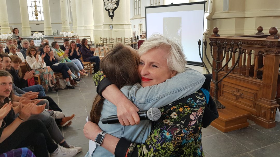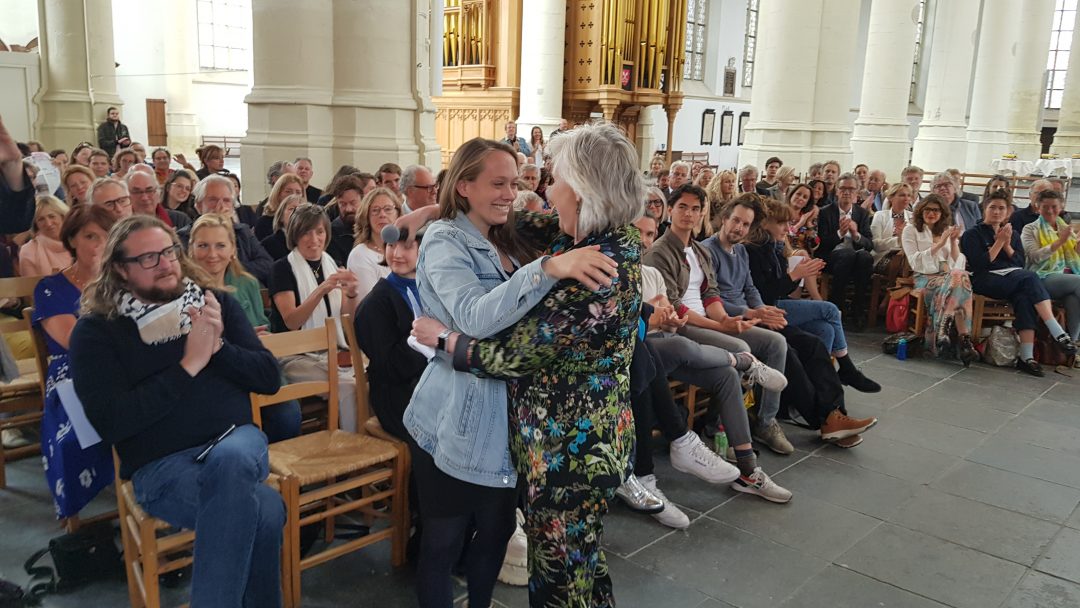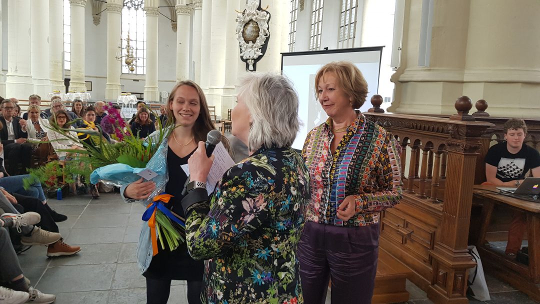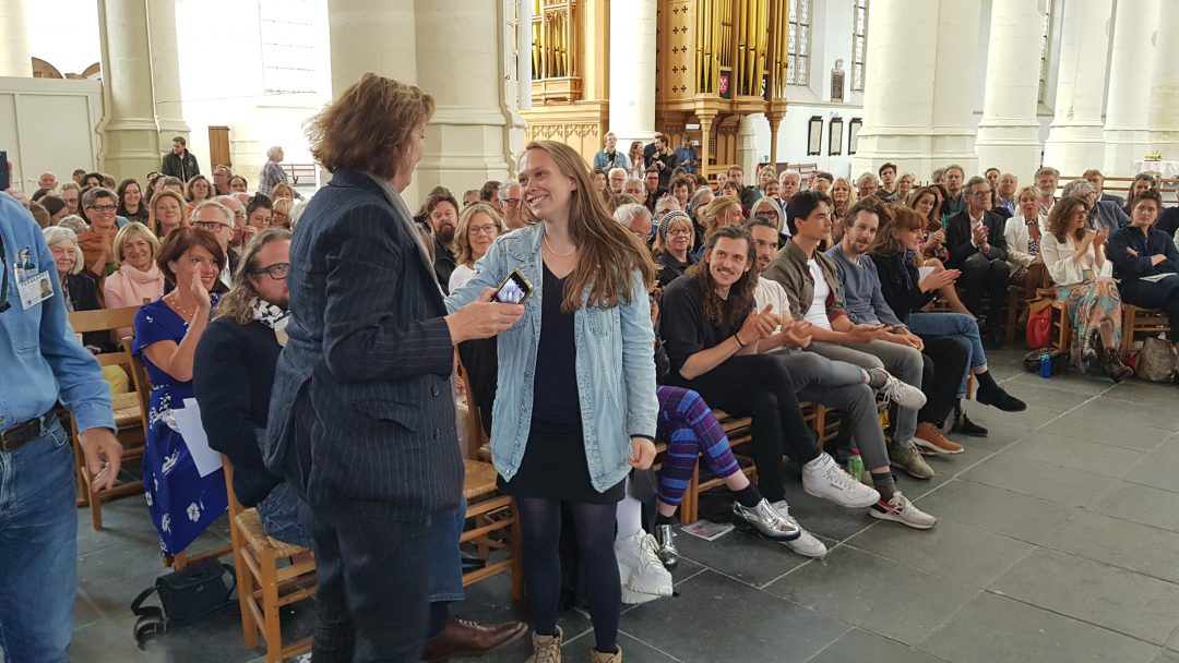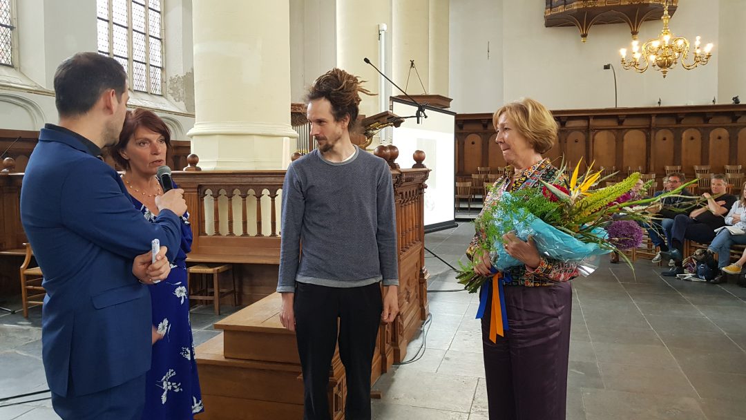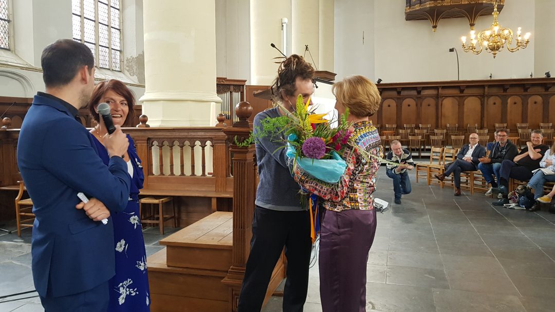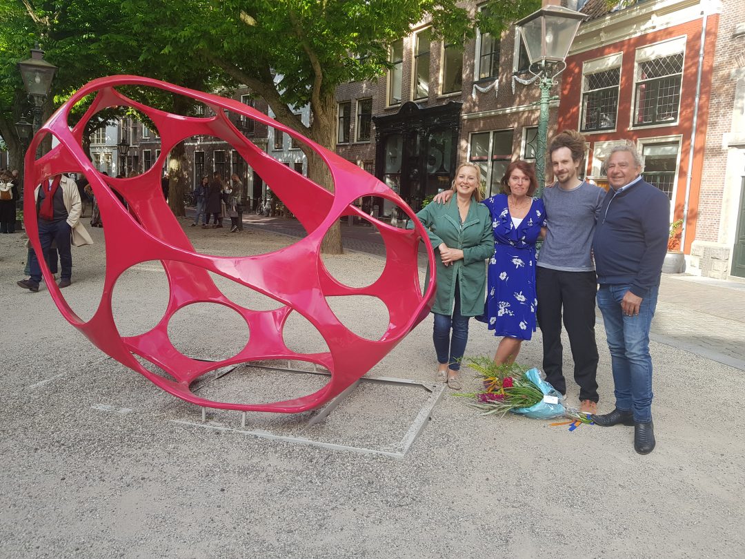 Verslaggeefster Gerry van Bakel in gesprek met Henriette van der Linden, voorzitter Beelden in Leiden, winnares Milena Naef en Josua Wechsler wiens beeld Blossom later op het Schuttersveld wordt geplaatst.