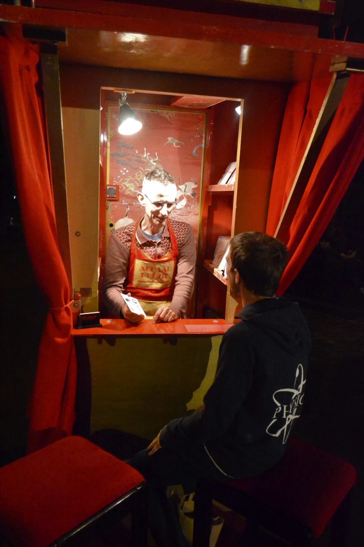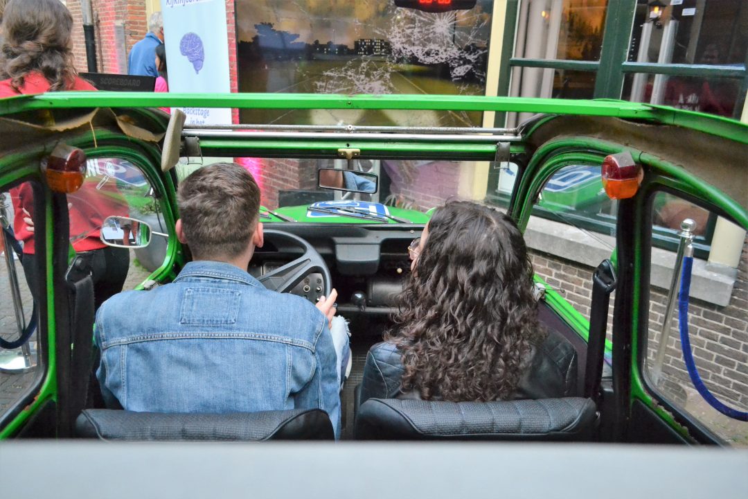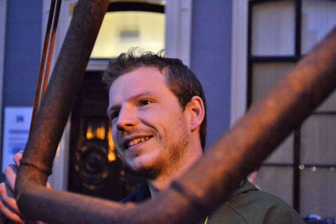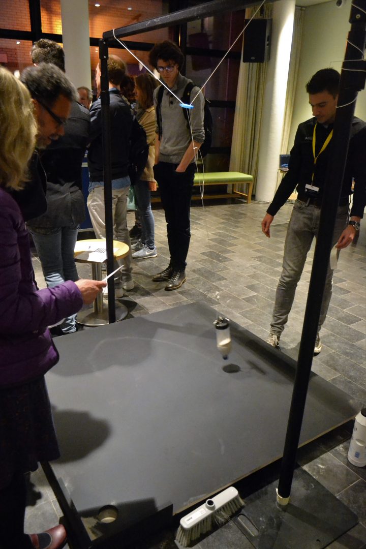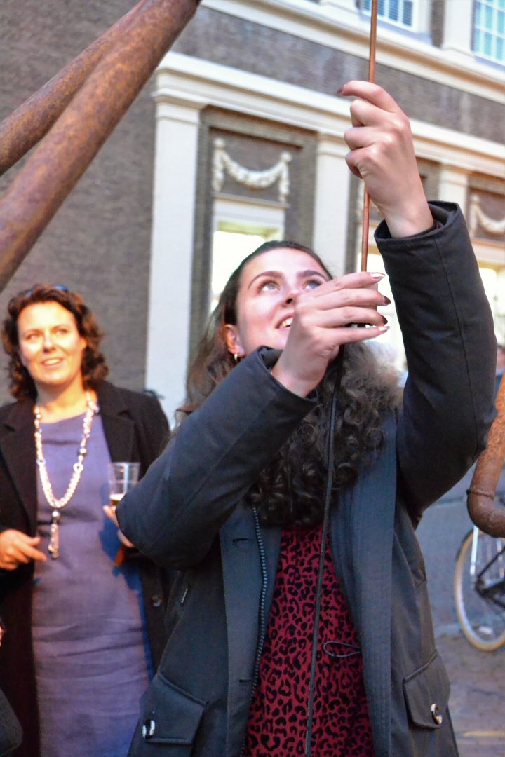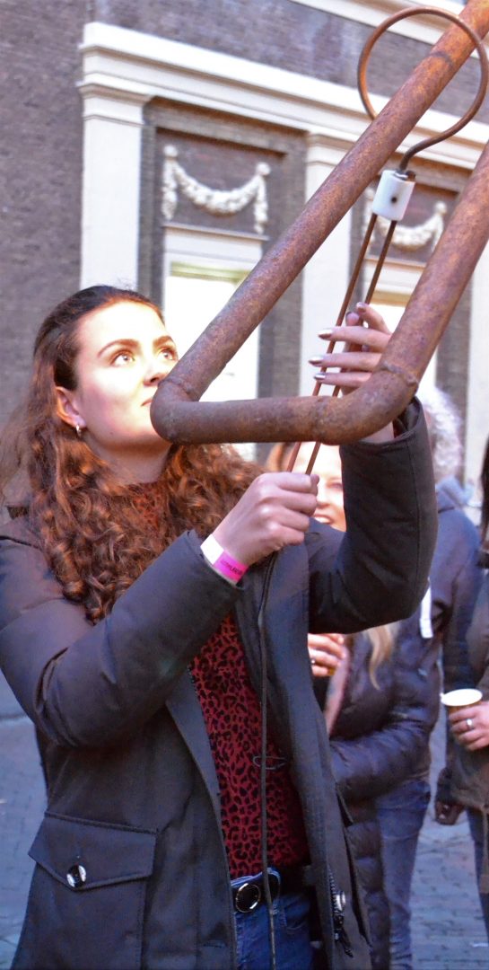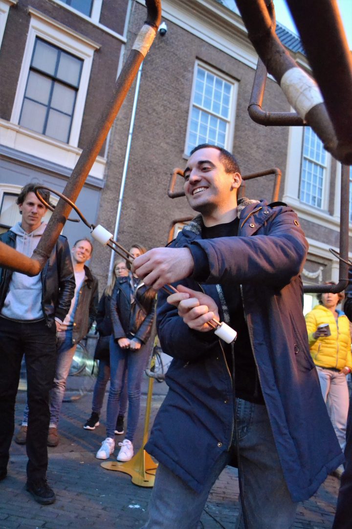 Maar je hoefde niet eens per sé aan de Museumnacht mee te doen om iets te doen. Voor het Rijksmuseum voor Oudheden stond het Uitvindersgilde. Een groep van acht kunstenaars die diverse apparaten bouwen waarmee bijvoorbeeld behendigheid kan worden getest. Het is een levensgrote versie van de aloude bibberspiraal. Met dien verstande, dat hier niet alleen een geluidssignaal aangaf dat je het metaal aanraakte, maar ook een elektrische schok “Nee, geen schrikdraad. Het is ongeveer het niveau van zo’n elektrische vliegenmepper”. O, en “het is eigenlijk nog nooit iemand gelukt het eind te halen”.
