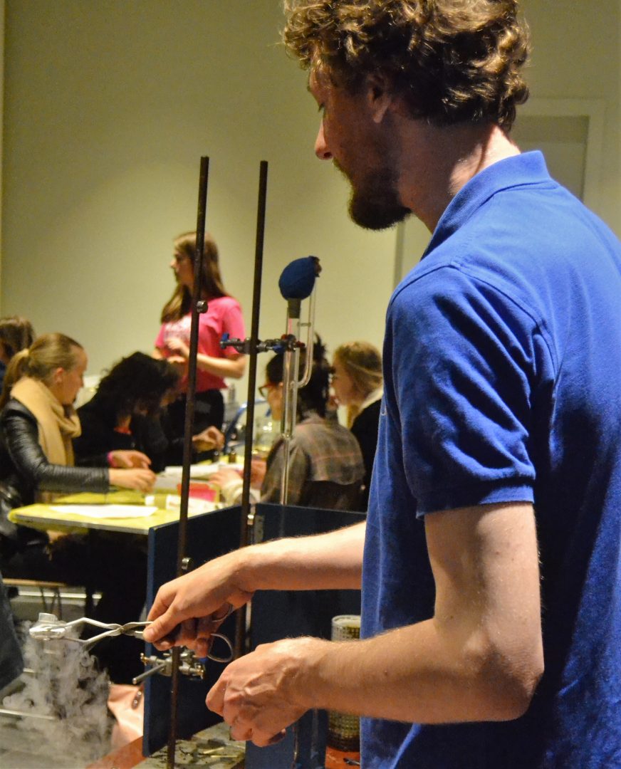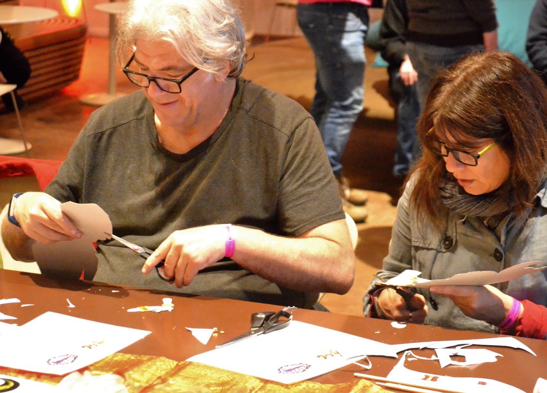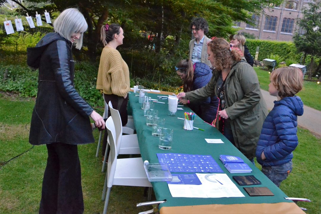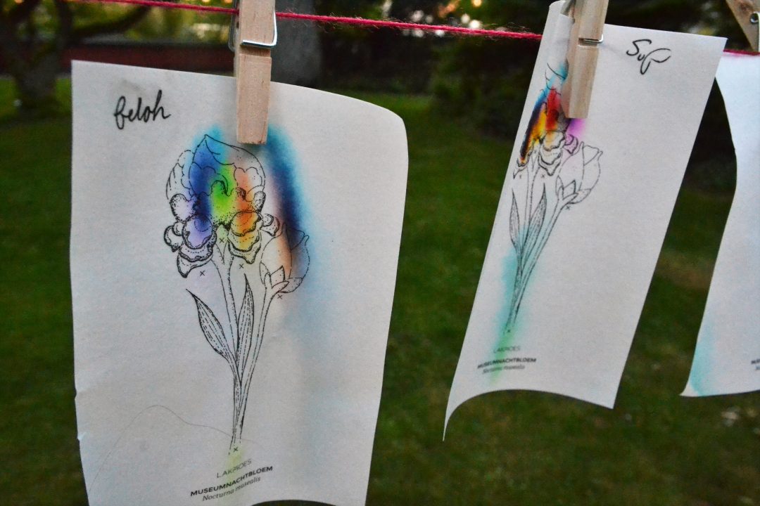 De Museumnacht was en is ook een nacht waarin veel te dóen is. Natuurlijk passief consumeren, was ook mogelijk. Maar daarnaast waren er vele vormen van dóen. In de Hortus was de Museumnachtbloem te vinden, een creatie van Studio Lakmoes. Zij zijn één van de weinig bedrijven in Nederland die zijn gespecialiseerd in ‘visualisatie van complexe kennis’. De Museumnachtbloem is een voorbeeld van chromatografie, de kennis dat verschillende stoffen ook verschillende gewichten hebben en dus niet allemaal op dezelfde snelheid en met hetzelfde resultaat bewegen. Door op vloeipapier of een koffiefilter een stip te zetten met een (níet-watervaste!!) viltstift, dat papier in een bodempje water te zetten, trekken de afzonderlijke pigmenten in de kleur omhoog. De lichtste het verst naar boven; ze scheiden van elkaar. Een ogenschijnlijk simpel trucje; maar het principe wordt ook gebruikt bij DNA-bepaling.