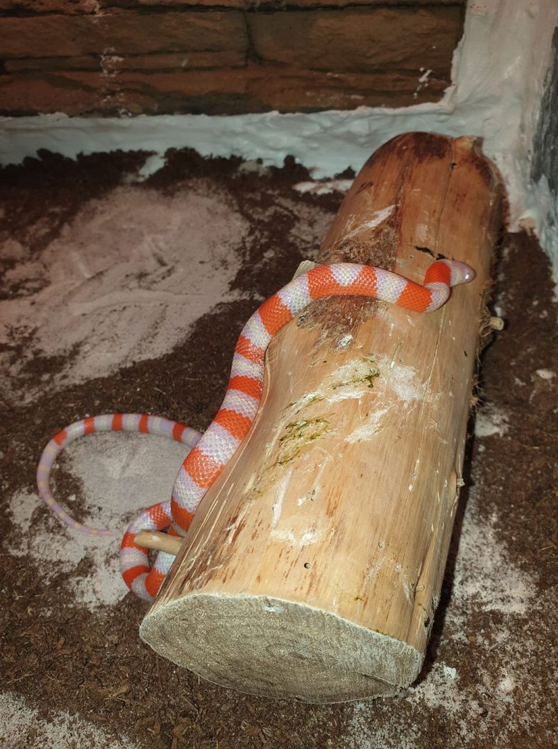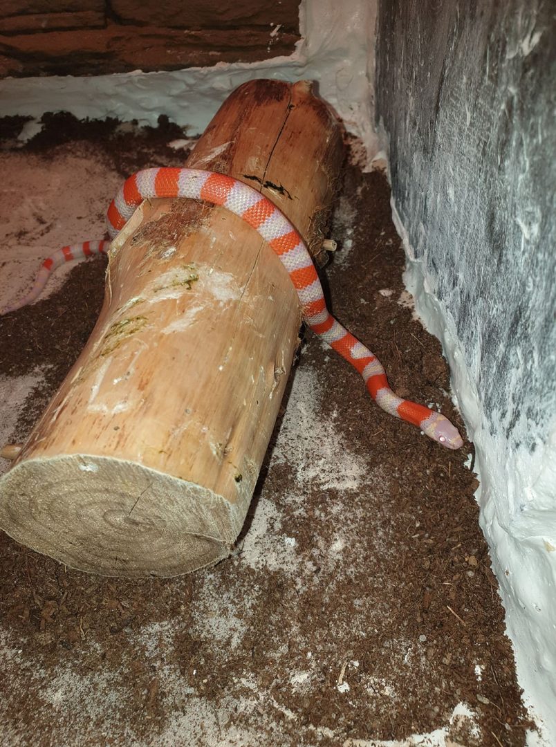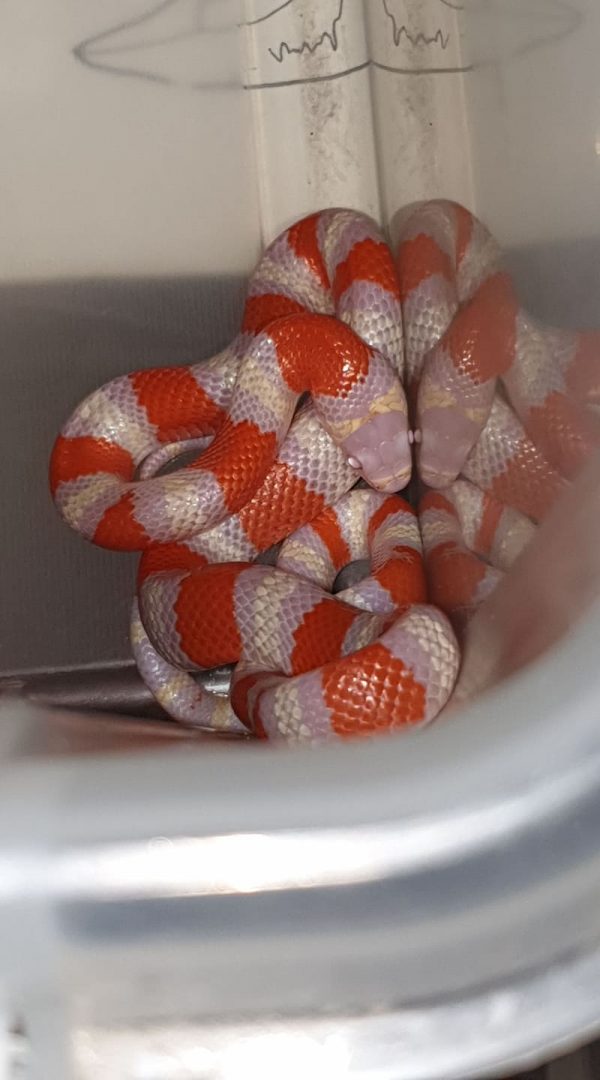 Een bijzondere vondst vanmiddag voor de Dierenambulance Leiden. De dienst werd ingeschakeld omdat in het Stevenshofpark een oranjerood-gestreepte slang was aangetroffen. Ondanks die felle kleuren gaat het hier niet om een giftige slang, maar om een ongevaarlijke melkslang. Wel kunnen ze bijten en scheiden ze een stinkende stof af als verdediging.