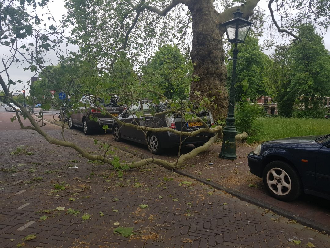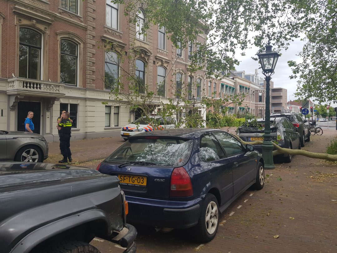 Een flinke boomtak heeft vanmiddag voor nogal wat schade gezorgd aan de Plantage. De tak viel bovenop een daar geparkeerd staande auto en ging onder andere dwars door de achterruit heen.