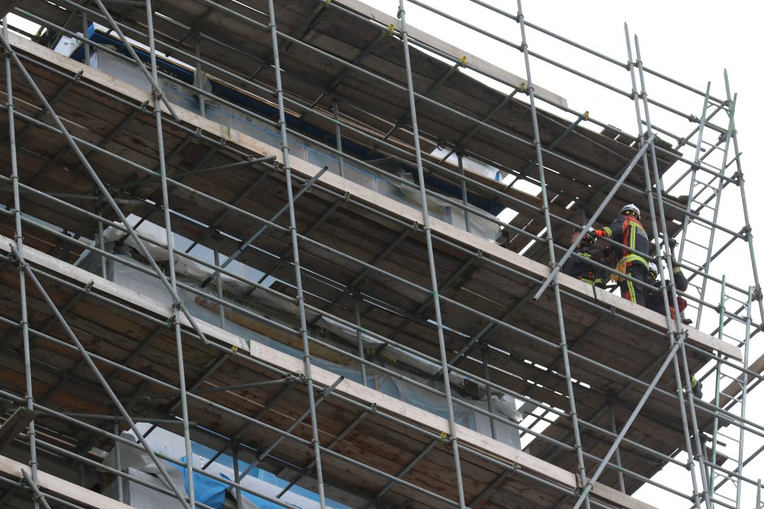 Medewerkers van de afdeling Service & Veiligheid van de NS hebben het plein rondom de in aanbouw zijnde kantoor- en woontorens afgezet. De brandweer stuurde verschillende manschappen naar boven om te zien wat er vastgezet kon worden om erger te voorkomen.