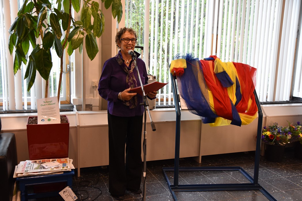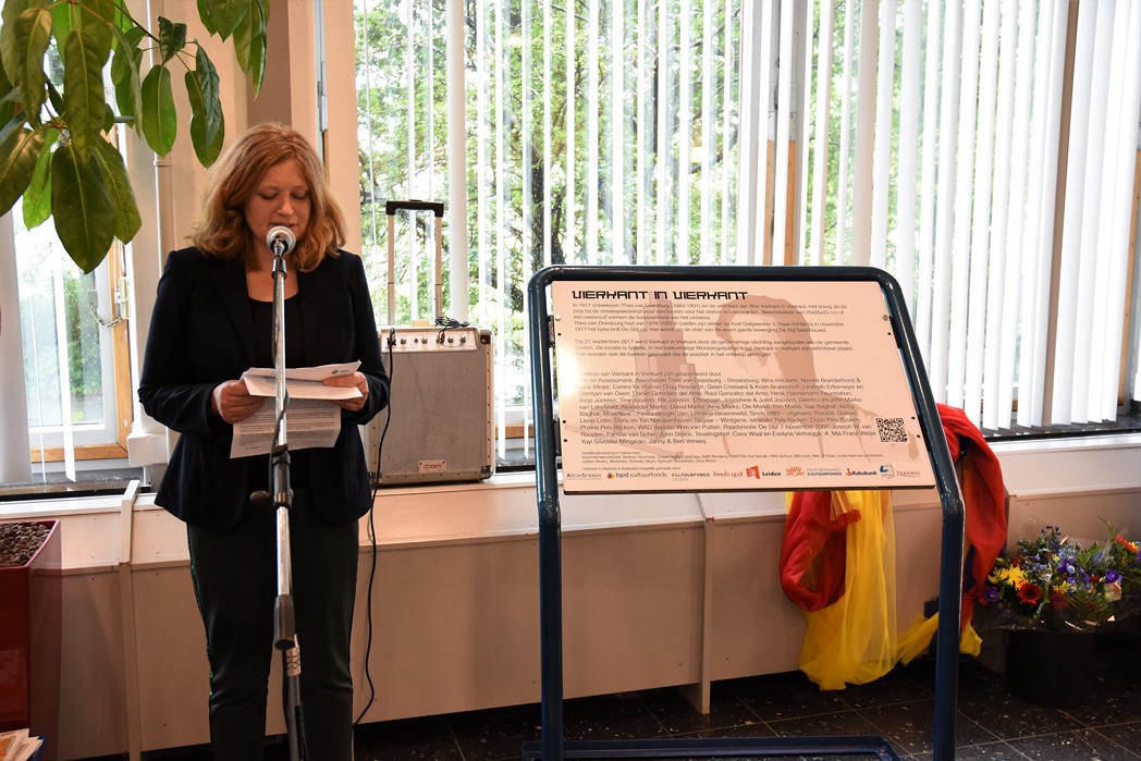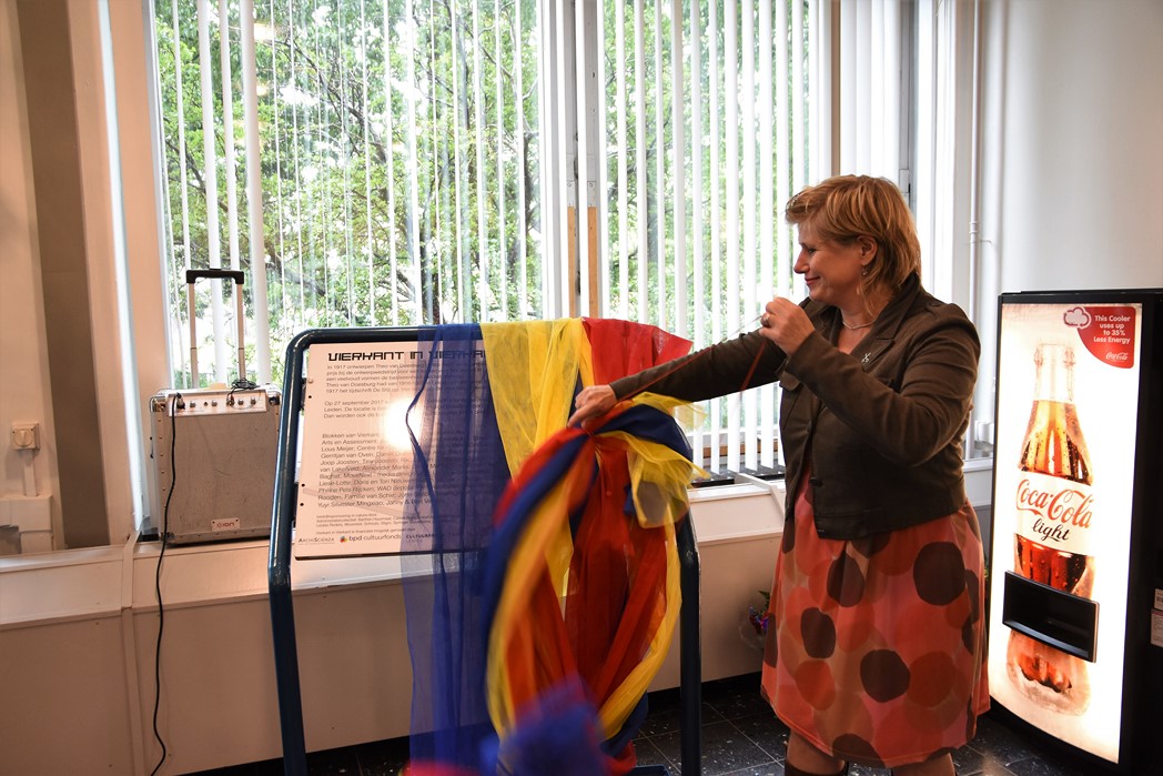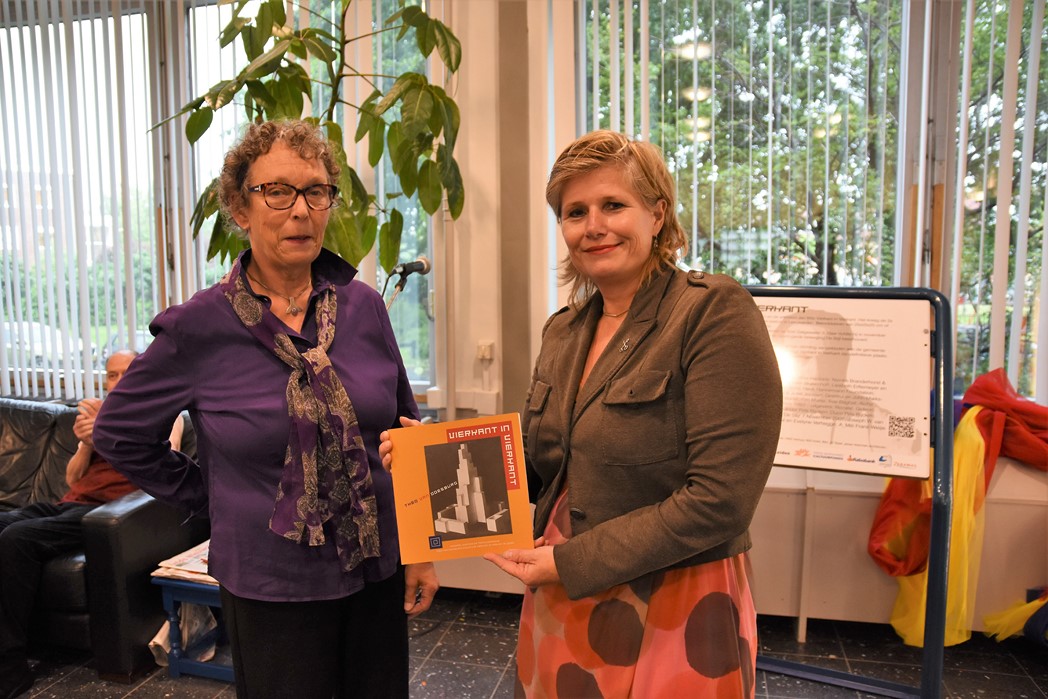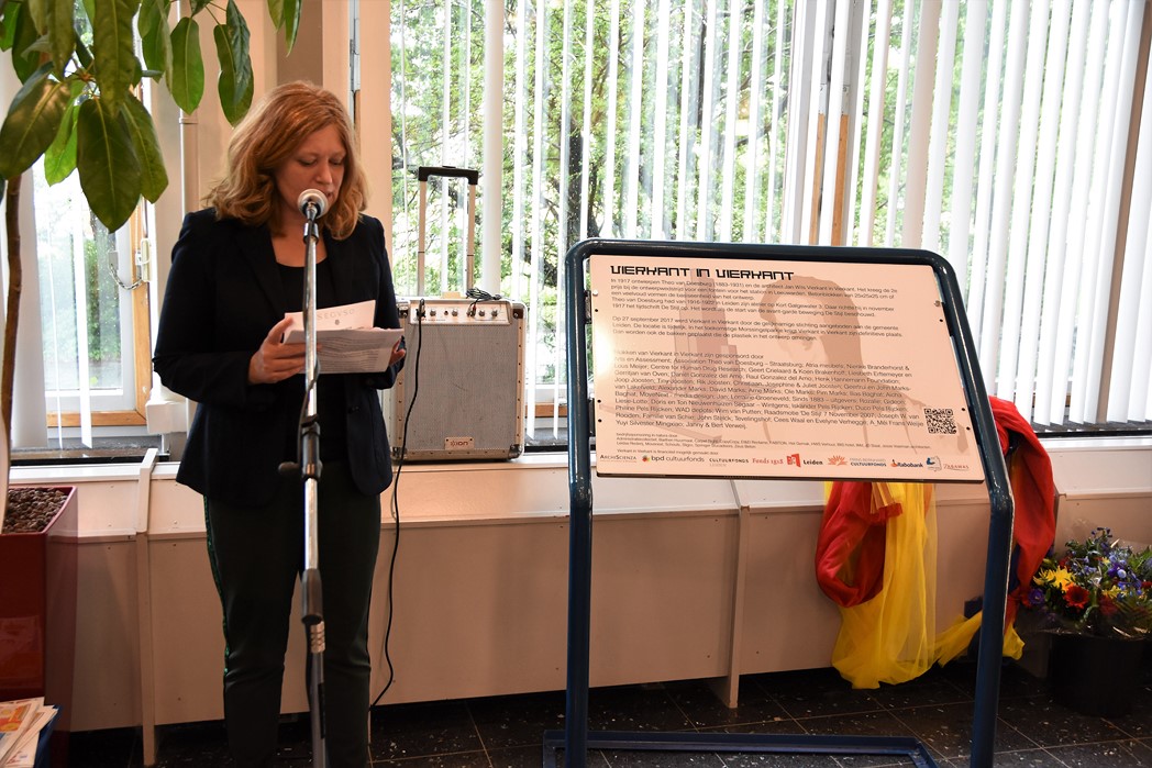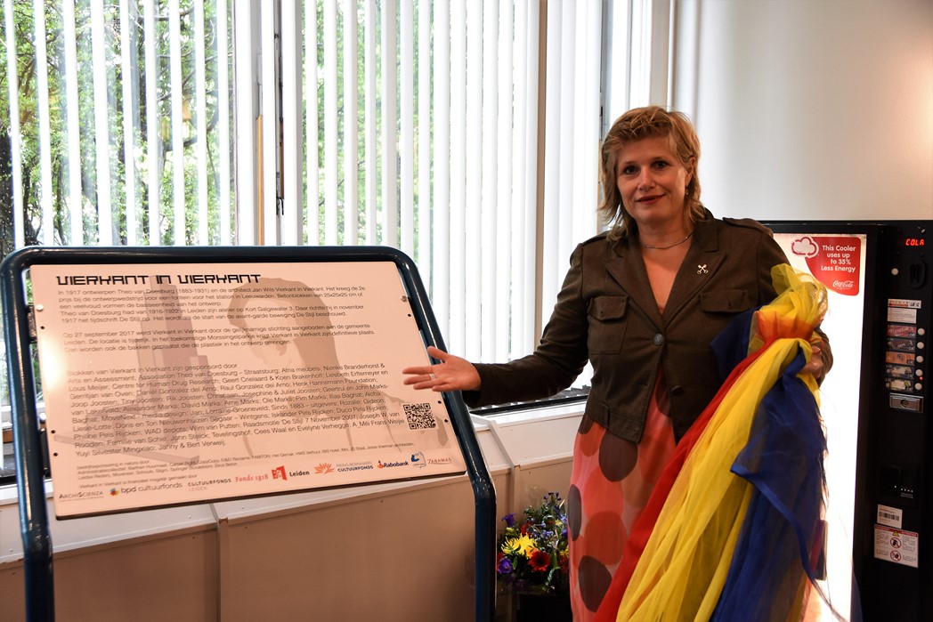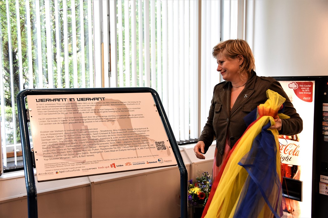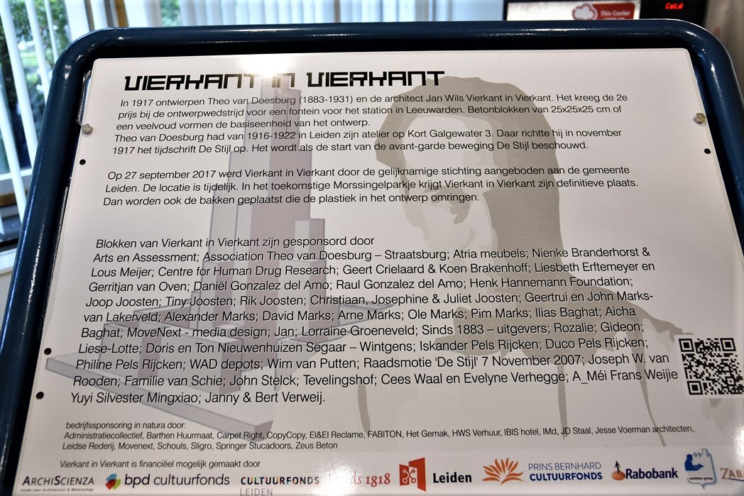 Wethouder Yvonne van Delft nam woensdagmiddag het eerste exemplaar van het boekje Vierkant in Vierkant in ontvangst. Eigenlijk zou de wethouder ook een informatiebord bij het sculptuur op de hoek van de Schipholweg en Morssingel helpen plaatsen. Door de hevige regenval werd de presentatie gehouden in Stationsplein 107 en wordt het informatiebord later deze week bij het sculptuur geplaatst.