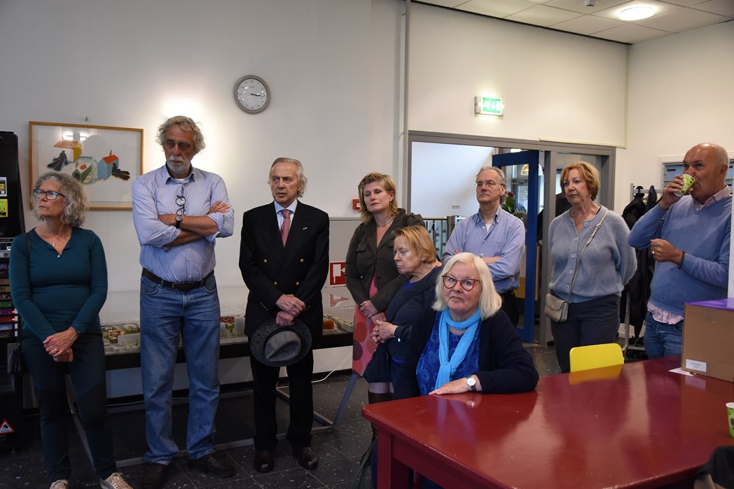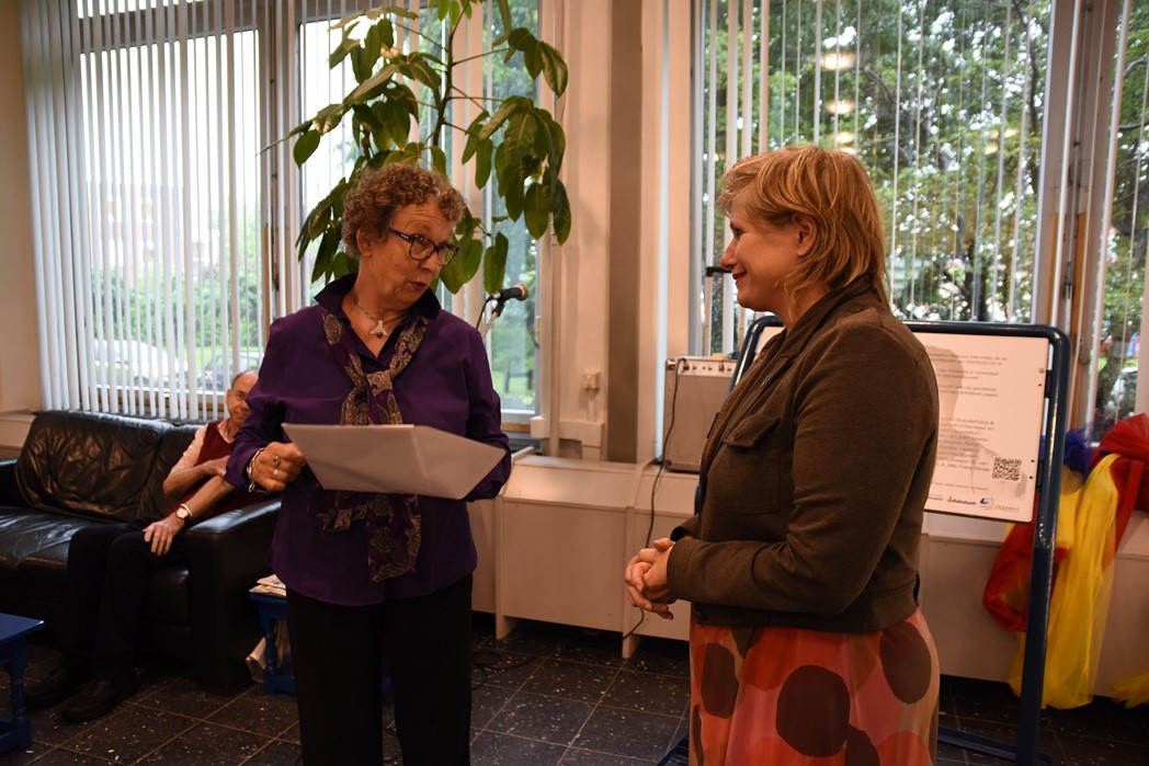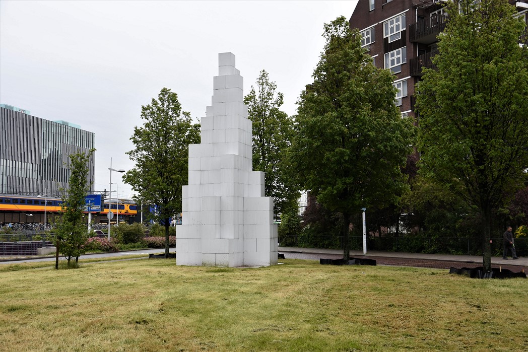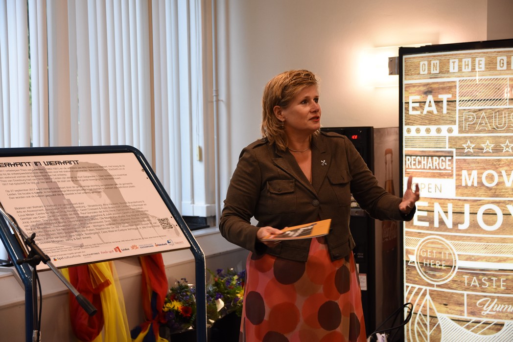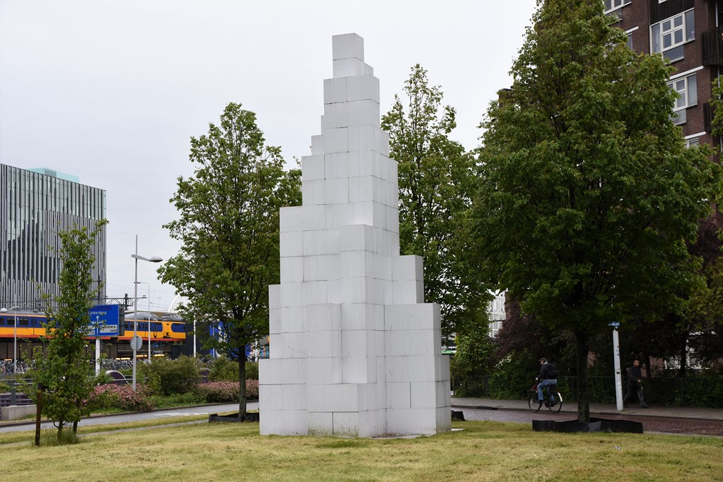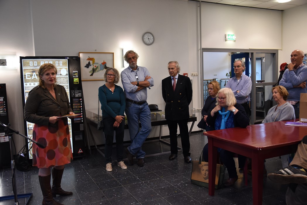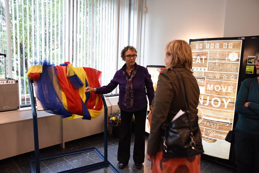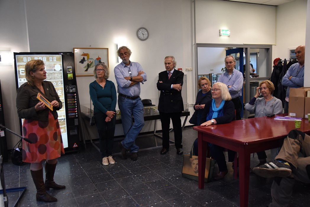 Wethouder Yvonne van Delft nam woensdagmiddag het eerste exemplaar van het boekje Vierkant in Vierkant in ontvangst. Eigenlijk zou de wethouder ook een informatiebord bij het sculptuur op de hoek van de Schipholweg en Morssingel helpen plaatsen. Door de hevige regenval werd de presentatie gehouden in Stationsplein 107 en wordt het informatiebord later deze week bij het sculptuur geplaatst.