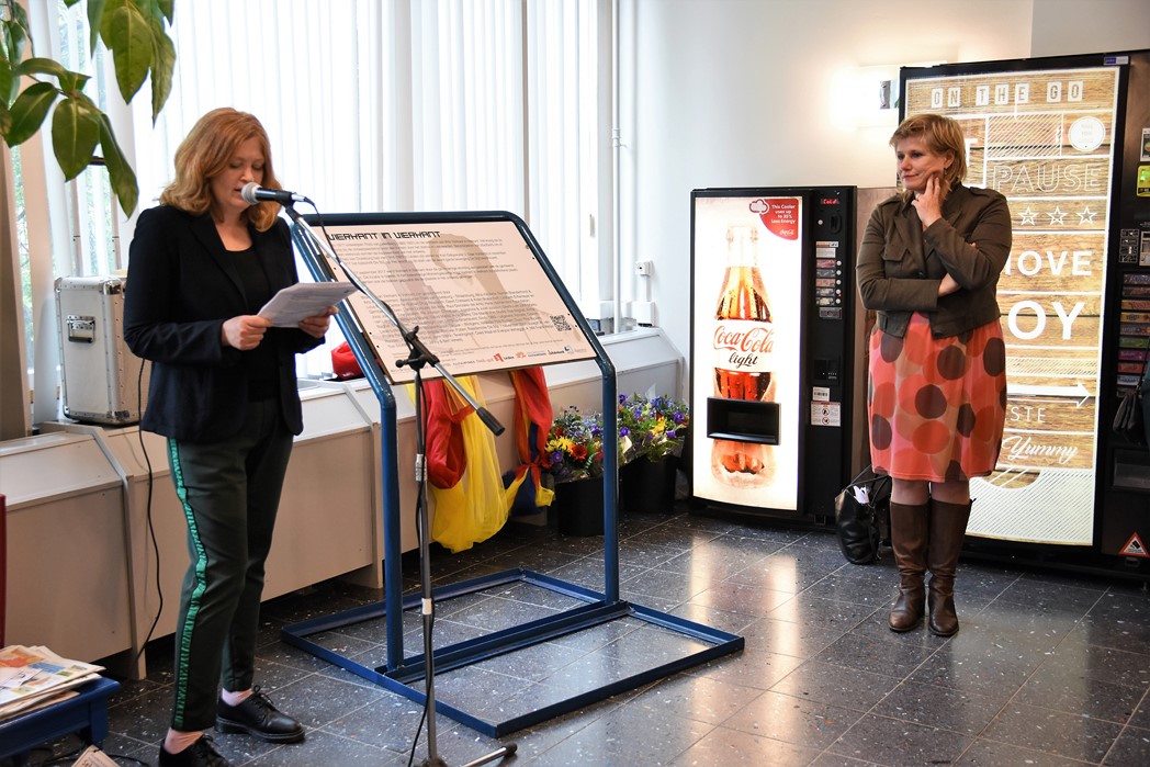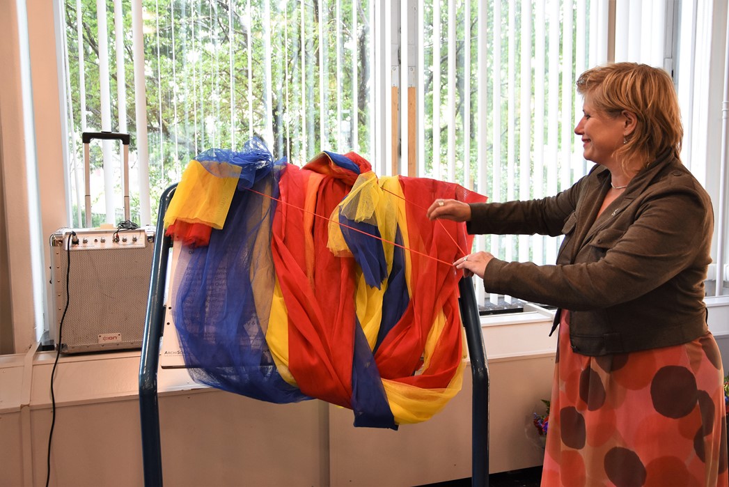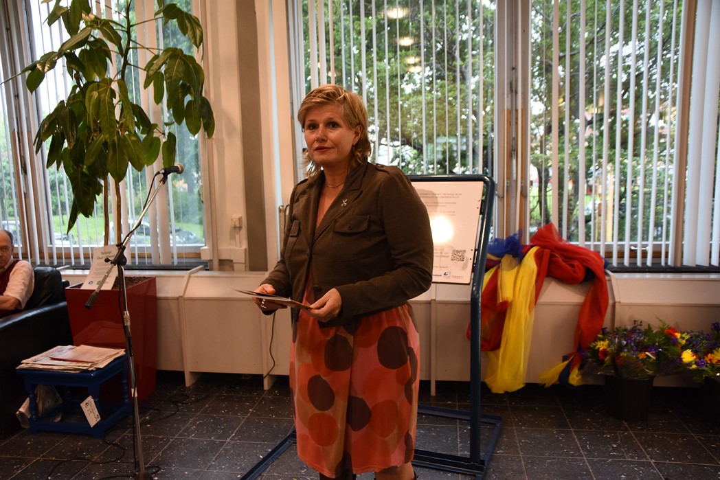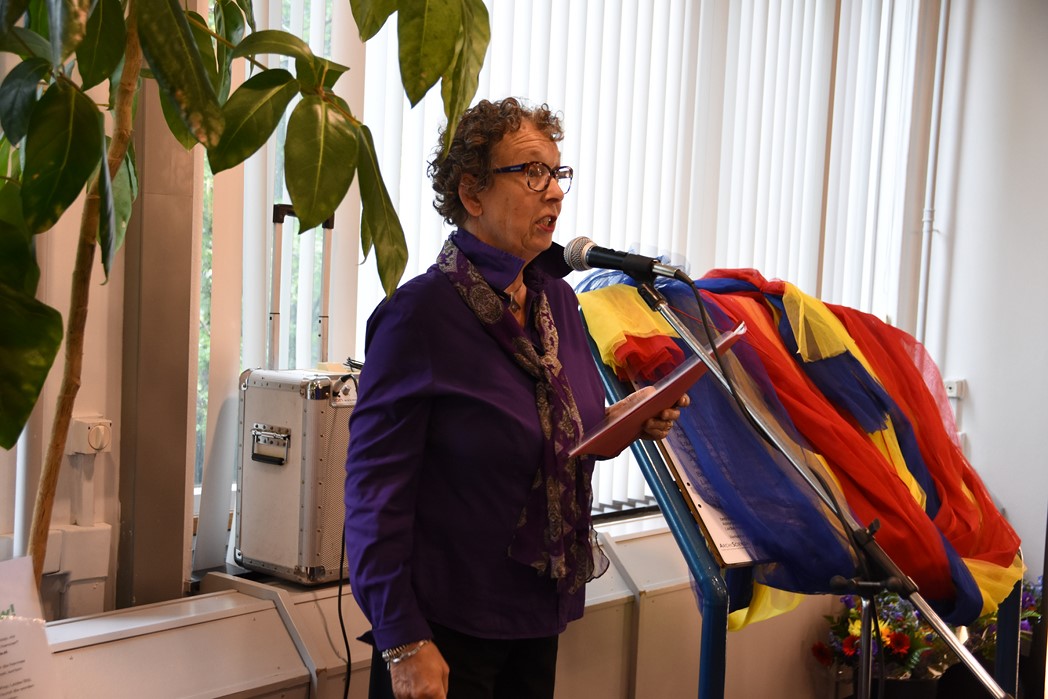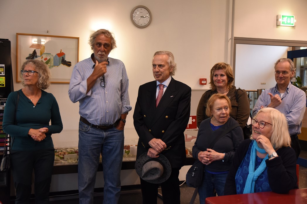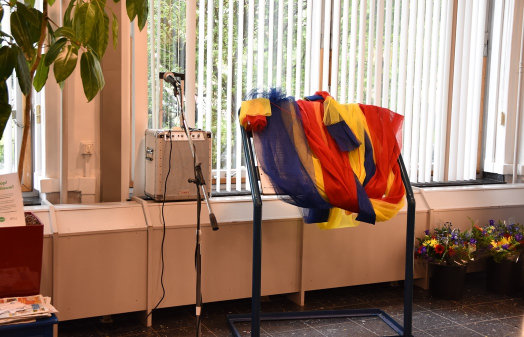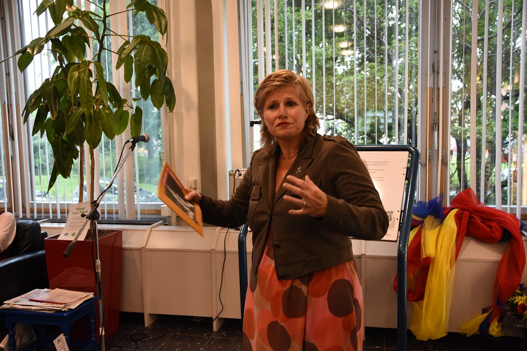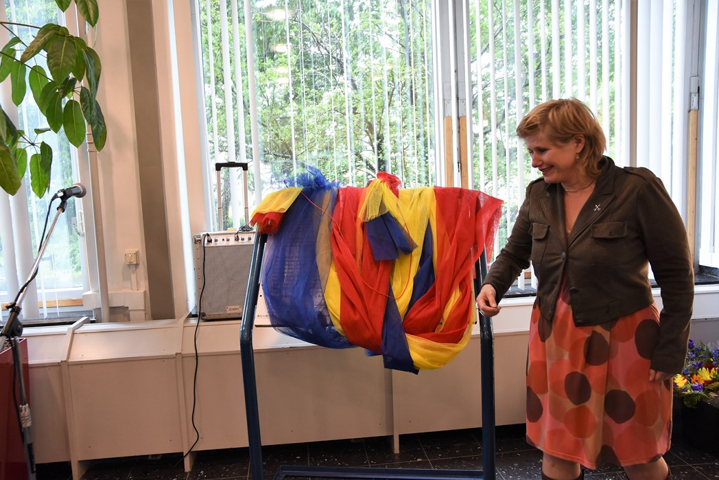 Wethouder Yvonne van Delft nam woensdagmiddag het eerste exemplaar van het boekje Vierkant in Vierkant in ontvangst. Eigenlijk zou de wethouder ook een informatiebord bij het sculptuur op de hoek van de Schipholweg en Morssingel helpen plaatsen. Door de hevige regenval werd de presentatie gehouden in Stationsplein 107 en wordt het informatiebord later deze week bij het sculptuur geplaatst.