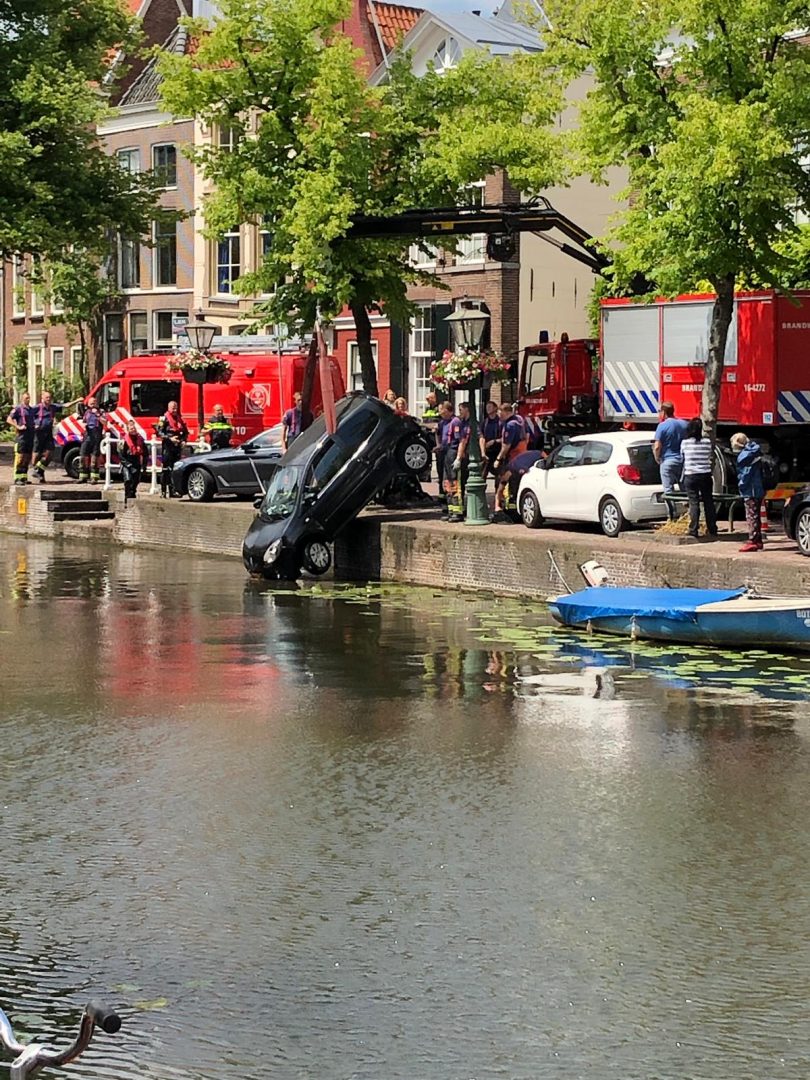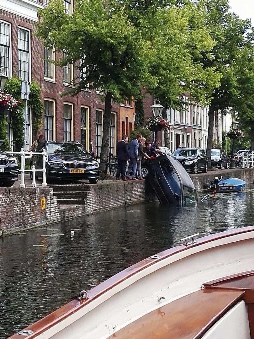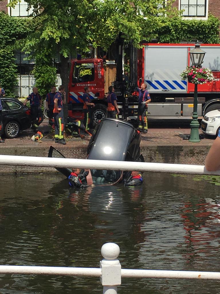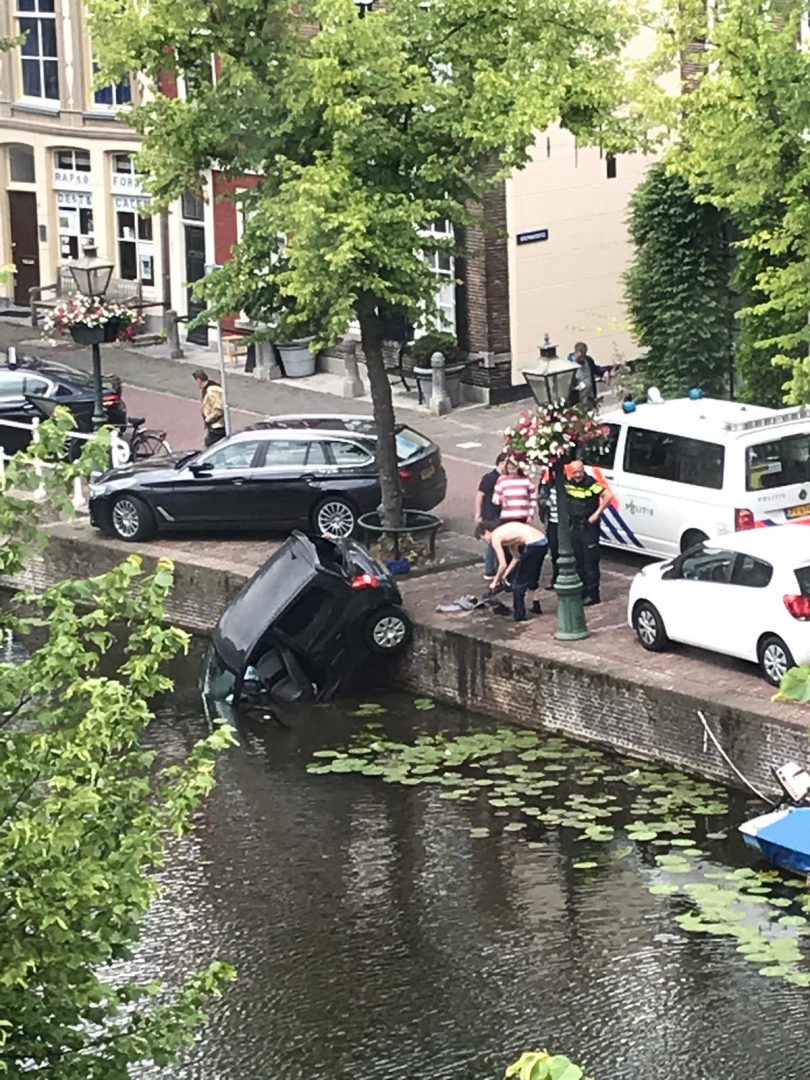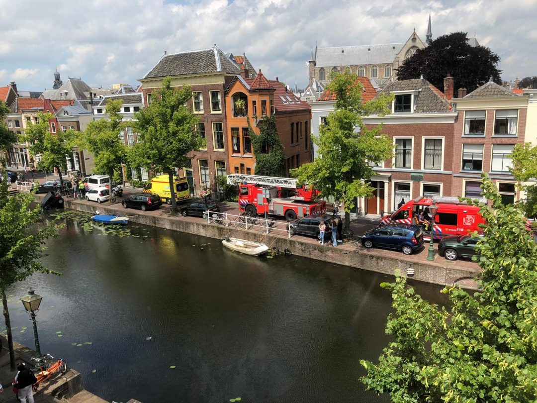 Een onfortuinlijke automobiliste is zojuist met auto en al in het water van het Rapenburg terecht gekomen. De vrouw werd door een getuige, Dirk, uit het water geholpen. De dappere redder stond zijn sokken nog uit te wringen toen ambulance, brandweer en politie aankwamen. De ambulance bleek niet nodig te zijn. De politie wel. Agenten zetten de weg af zodat de brandweer de auto uit het water kon takelen.
