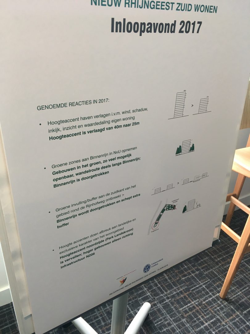 In het Hilton hotel werden omwonenden van Nieuw Rhijngeest-Zuid donderdagavond geïnformeerd over het resultaat van de nieuwe onderhandelingen tussen de twee partijen. Het meest opvallend daarbij is de toename van het aantal woningen ten opzichte van 2017: van 400 woningen toen, naar een combinatie van 500 woningen en 300 studentenwoningen nu. “Aan de ene kant om te voldoen aan de woningvraag in de regio en aan de andere kant vinden wij het belangrijk dat er studentenwoningen komen”, aldus Ferdy Poppelier namens het Vastgoedbedrijf van de universiteit, waarvoor de realisatie van studentenwoningen een belangrijke eis is.