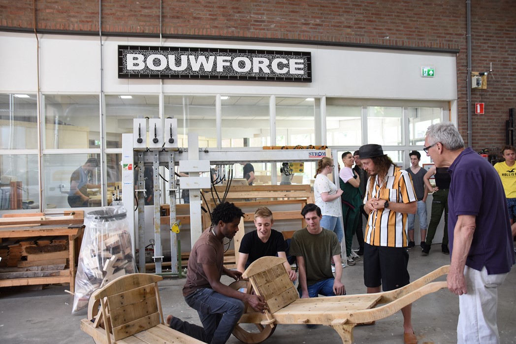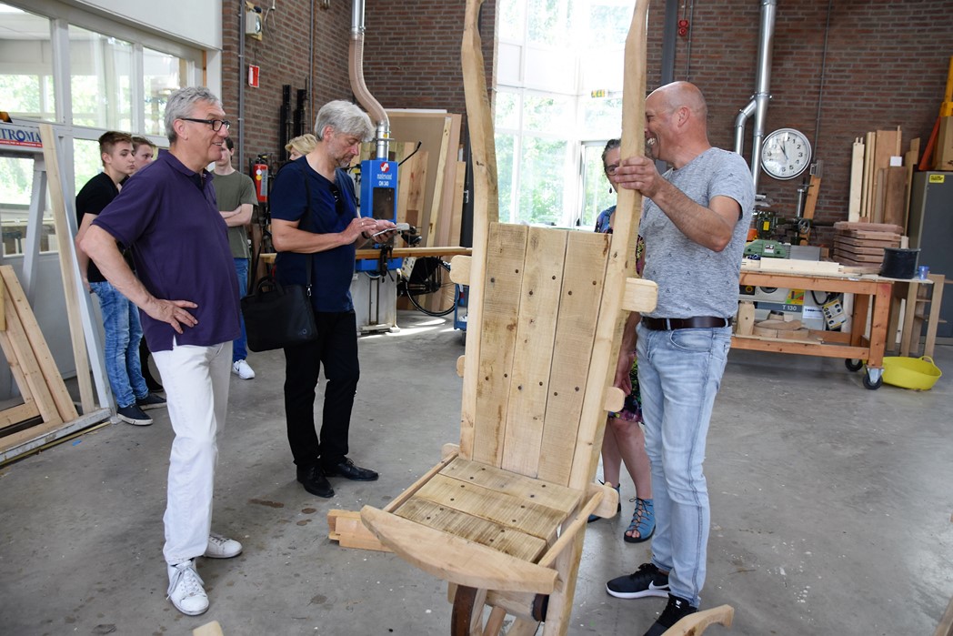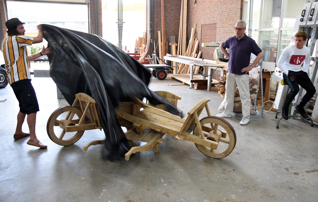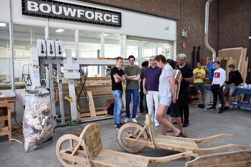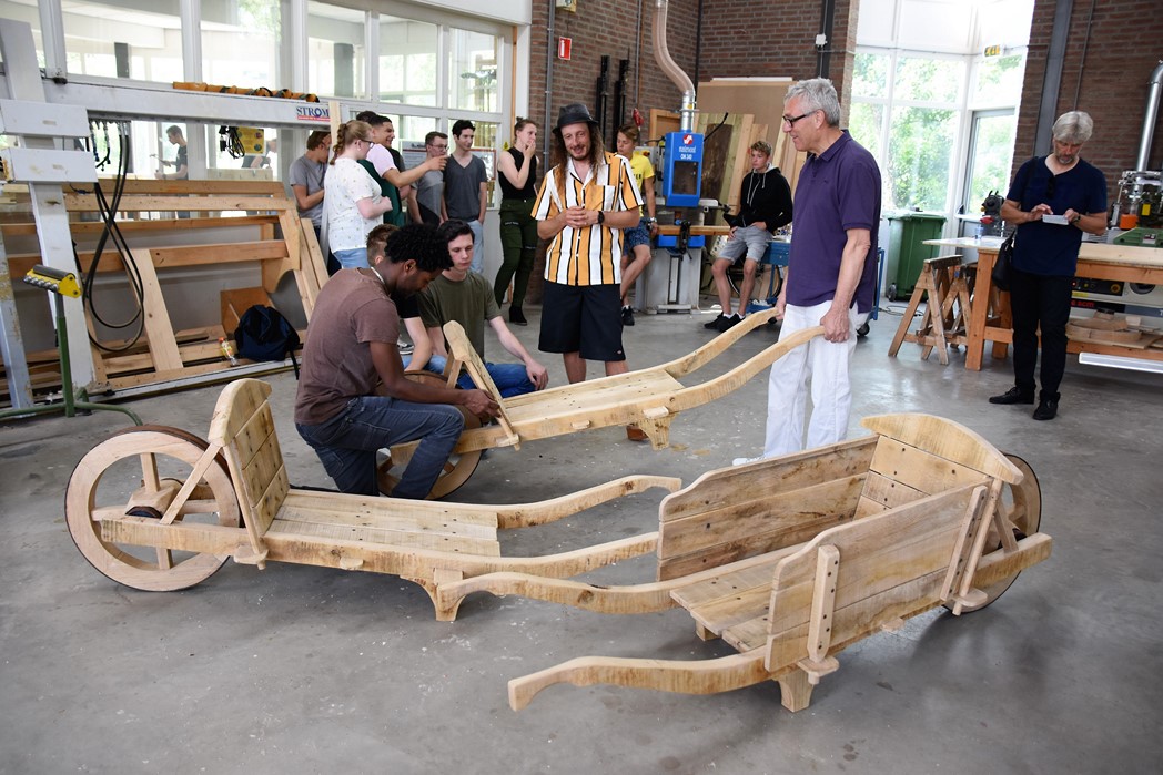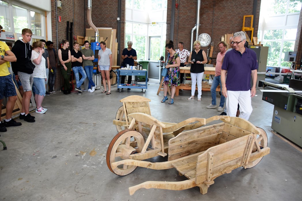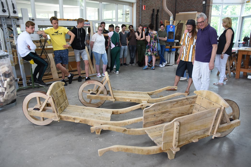 De studenten Kees-Jan, Maaike en Dylan werkten allemaal mee aan het project. “De wielen waren de grootste uitdaging,” zegt Kees-Jan. Maaike zit pas sinds november op mboRijnland en aanvankelijk was het niet de bedoeling dat ze mee zou doen. “IK had wat tijd over en toen werd ik gevraagd. Het was leuk werk, maar het vraagt heel veel inzet om het er echt mooi uit te laten zien. Dat gaat niet vanzelf.” Dylan werkt graag met hout. Hij is nu eerstejaars, net als Maaike en Kees-Jan. Over een jaar hoopt hij klaar te zijn. “Er zijn niet veel mensen die voor houtbewerking kiezen. Ik wil straks als timmerman eerst voor een baas werken en daarna een eigen bedrijf.”
