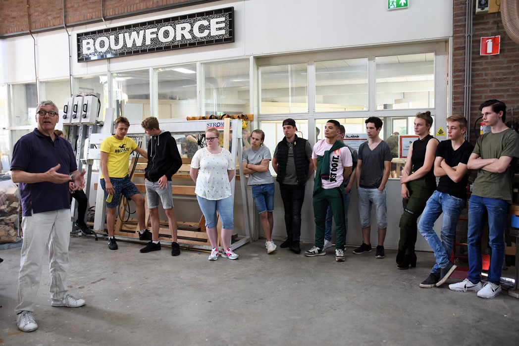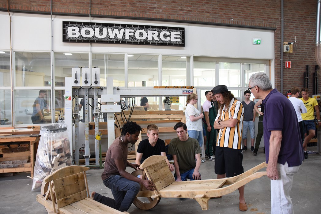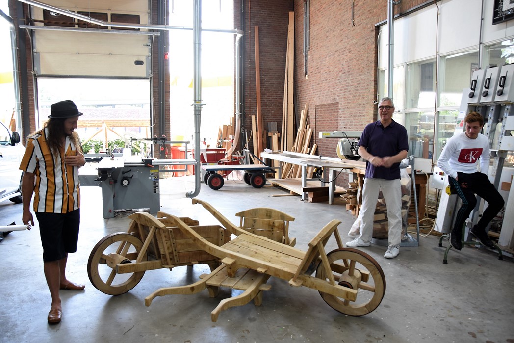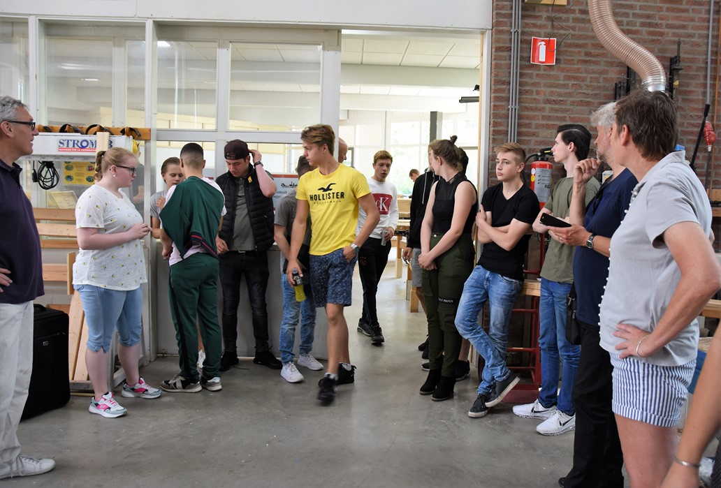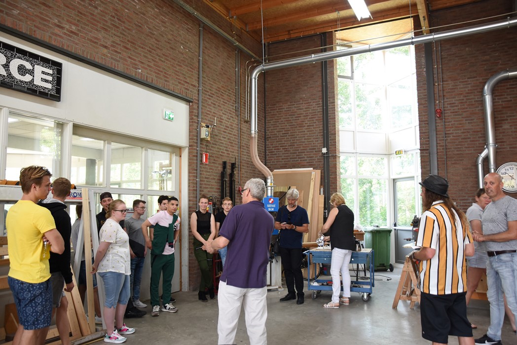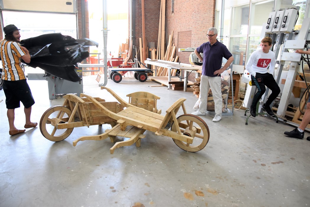 De studenten Kees-Jan, Maaike en Dylan werkten allemaal mee aan het project. “De wielen waren de grootste uitdaging,” zegt Kees-Jan. Maaike zit pas sinds november op mboRijnland en aanvankelijk was het niet de bedoeling dat ze mee zou doen. “IK had wat tijd over en toen werd ik gevraagd. Het was leuk werk, maar het vraagt heel veel inzet om het er echt mooi uit te laten zien. Dat gaat niet vanzelf.” Dylan werkt graag met hout. Hij is nu eerstejaars, net als Maaike en Kees-Jan. Over een jaar hoopt hij klaar te zijn. “Er zijn niet veel mensen die voor houtbewerking kiezen. Ik wil straks als timmerman eerst voor een baas werken en daarna een eigen bedrijf.”