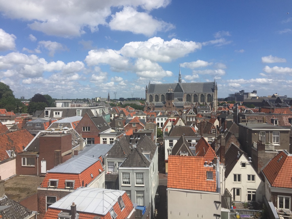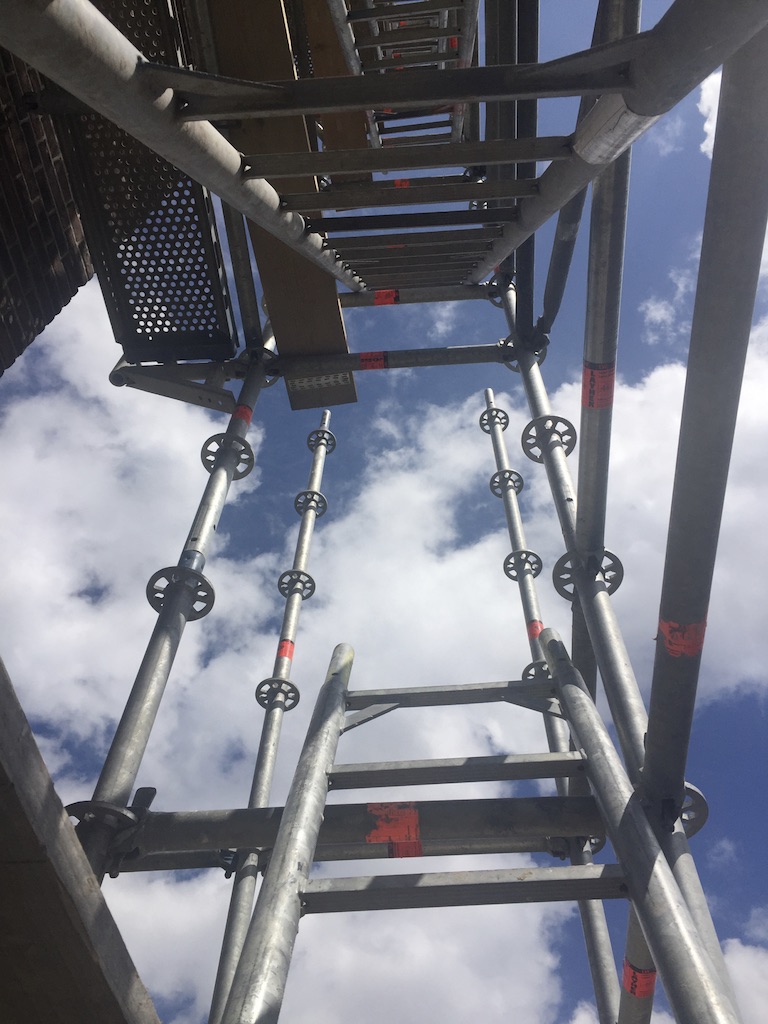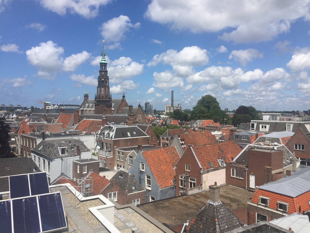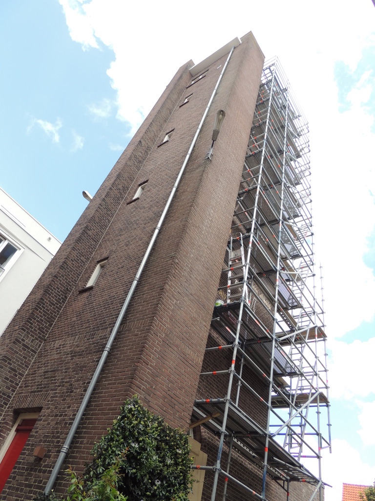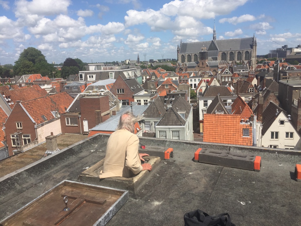 De totstandkoming van de muurschildering op de Brandmeestertoren heeft zo zijn eigen uitdagingen. Om bij de plek te komen waar Bruins zit te schilderen moet je eerste de toren in en helemaal naar boven klimmen. Het laatste trapje is een ijzeren ladder waarmee je door een luik op het platte dak terecht komt. “Goed uitkijken,” waarschuwt Walenkamp, “er staat geen hek omheen. En soms vallen de naburige meeuwen je aan die denken dat je hun nest en jongen bedreigt.” Daarna is het zeven laddertjes naar beneden in de steiger. Genoeg om je aan beet te pakken, maar het is toch wat wiebelig en de ronde ijzeren sporten van de ladders bieden niet veel houvast. Het uitzicht op de toren is wel fenomenaal. En de muurschildering is bijna klaar. De officiële onthulling staat gepland voor het najaar, denkt Walenkamp. Daar zijn de twee mannen van TEGEN-BEELD niet zo mee bezig.