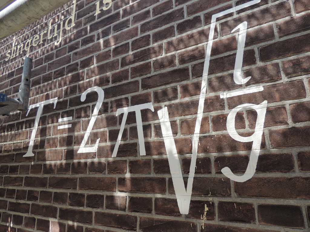Een paar jaar geleden werden ze benaderd door de natuurkundigen Sense Jan der Molen en Ivo van Vulpen die graag natuurkundige formules wilden toevoegen aan het stadsbeeld. “Wat geeft het dat niet iedereen die formules begrijpt,” zegt Jan Willem Bruins die de kwasten hanteert, “er staan ook gedichten op de muur in het Russisch of Arabisch. Ik begrijp die formules ook niet.” Dat weerhoudt hem er niet van om zonder al teveel hulpmiddelen – een waterpas is wel belangrijk want als de regel schuin afloopt zie je dat altijd – de letters op de muur schildert. Uit de losse pols. “Dat gaat het beste.”