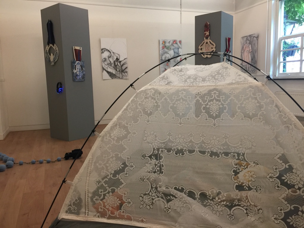 Gecombineerd met een tent zonder in- of uitgang die komt uit een kunstproject met wooncentrum Robijnhof waar ouderen, studenten en statushouders anderhalf jaar samen woonden in een oud verzorgingshuis van Libertas Leiden dat gesloopt gaat worden. De tent is gemaakt van een soort oude vitrage, binnenin liggen allerhande geweren en pistolen maar gemaakt van zachte stoffen. Verder hangt er aan de muur een reuzegrote rozenkrans, de van nepbont gemaakte pistolen markeren hier de onze vaders en de hanger is in de vorm van een handgranaat.