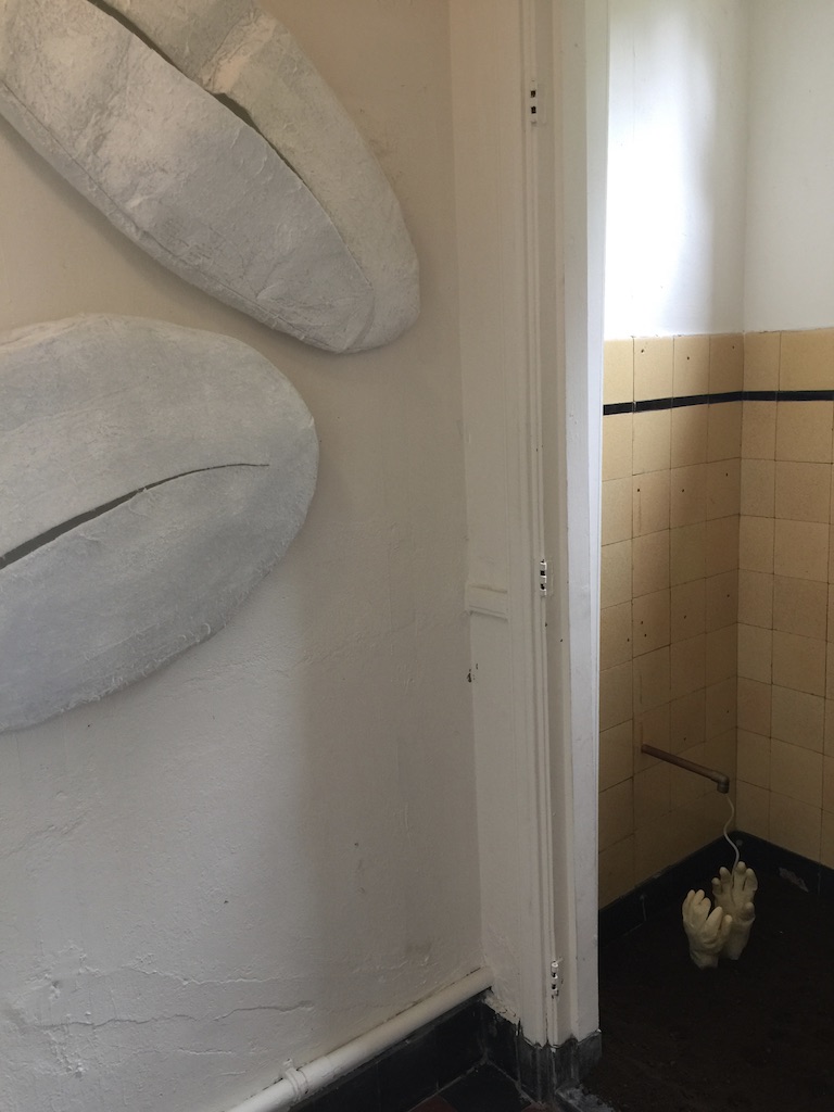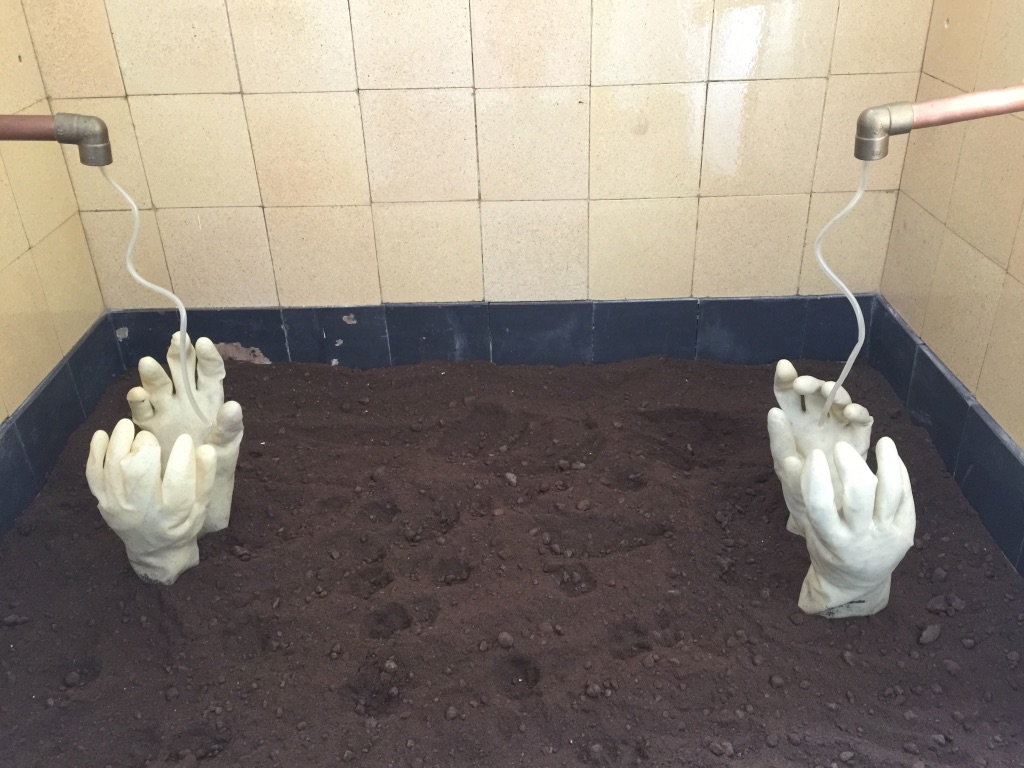 Boven gaat de tentoonstelling verder met op de tussenetage aandacht voor de koffiecultuur. Nederlanders drinken veel koffie zonder vak stil te staan bij hoe die koffie gemaakt wordt. Op de grond steken twee paar wanhopige handen uit de koffieprut. Je hoort het water doorlopen. Aan de muur hangen grote koffiebonen die ook wel iets weghebben van monden.