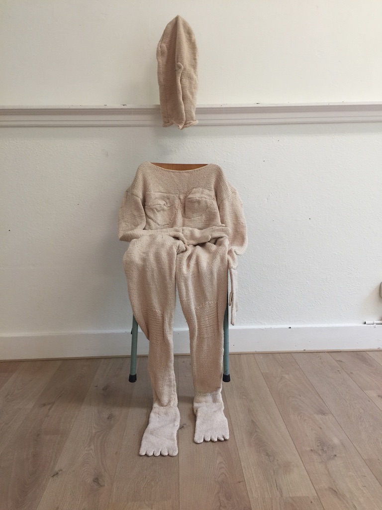 In het mini-bioscoopje speelt een film waarmee Smit afstudeerde aan de kunstacademie. Ze had een tweede huid voor zichzelf gebreid en je ziet hoe ze die langzaam afpelt. “Dat breiwerk was nog een hele klus. Ik ben wel drie keer opnieuw begonnen.”