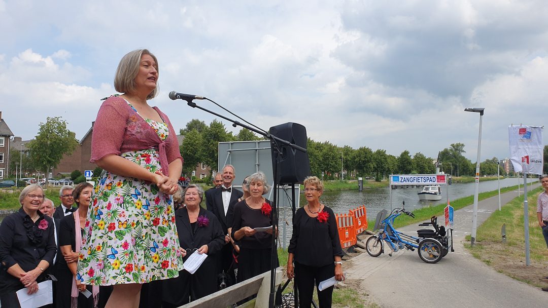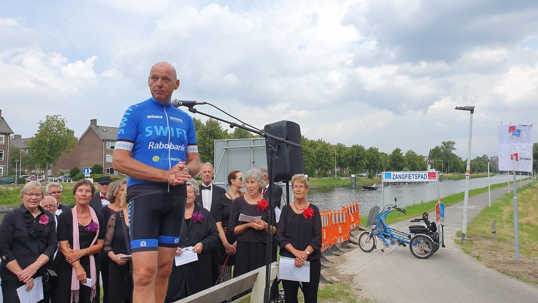 De Leidse Ren- en Toervereniging Swift en de Christelijke Oratoriumvereniging Ex Animo bestaan dit jaar allebei een eeuw. De jubilerende clubs zochten elkaar op en bedachten een gezamenlijke jubileumactiviteit. En wat krijg je als je zingen combineert met fietsen? Juist; een zangfietspad. Gisteren werd het onder grote belangstelling officieel geopend door wethouder Martine Leewis.