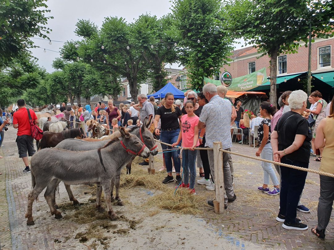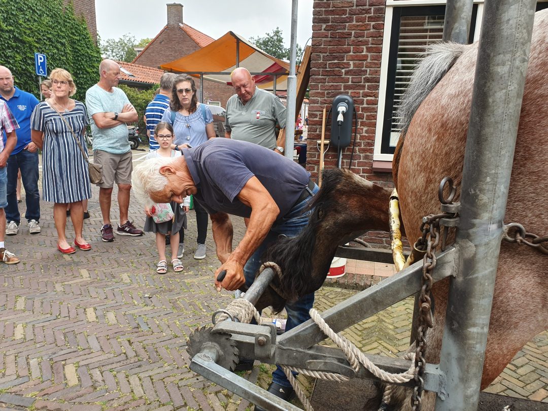 Ook vaste prik tijdens de paardendagen: Koekslaan. Wie als eerste de koek in de lengte doormidden slaat, die wint. Meedoen kost vijftig cent, de opbrengst gaat naar het goede doel. Het aantal aangevoerde paarden bleef dit jaar sterk achter bij andere jaren. Werd in 2017 nog een recordaantal van 171 in de boeken bijgeschreven, dit jaar bleef de teller steken op 65. Met name het extreem warme weer van de afgelopen dagen en de voorspelling voor vandaag speelt de paardenmarkt parten. Vanwege de tropische temperatuur moest het bestuur noodgedwongen, net als vorig jaar, de kortebaandraverij afgelasten. Of die wedstrijden later dit jaar alsnog gehouden worden, is nog niet bekend. Vorig jaar lukte heet niet om een alternatieve datum te vinden, dit jaar hoopt de organisatie dat wel voor elkaar te krijgen.