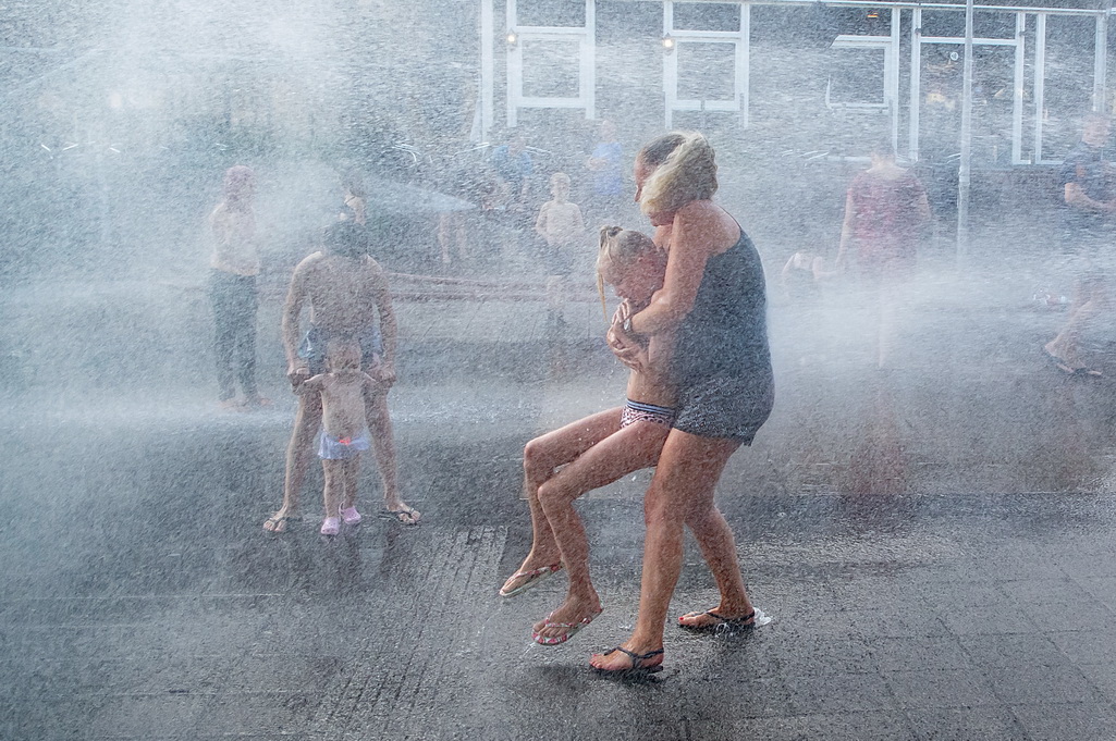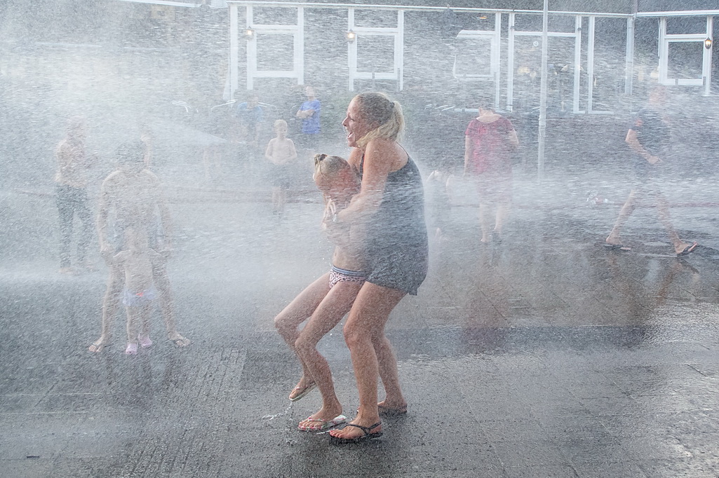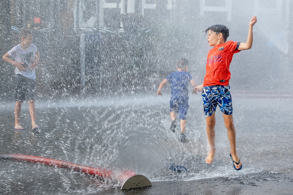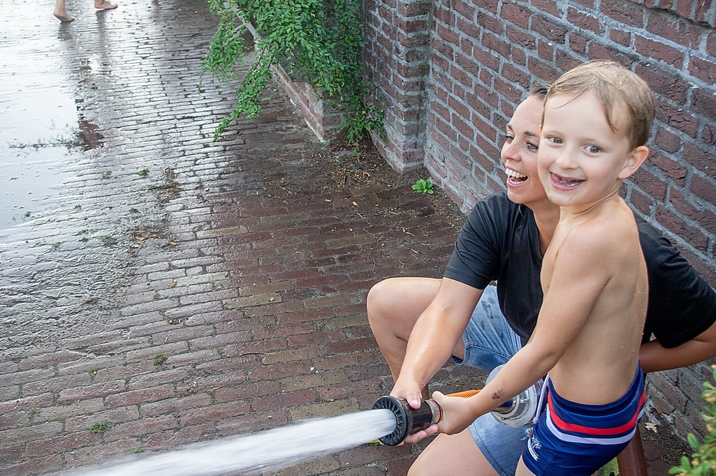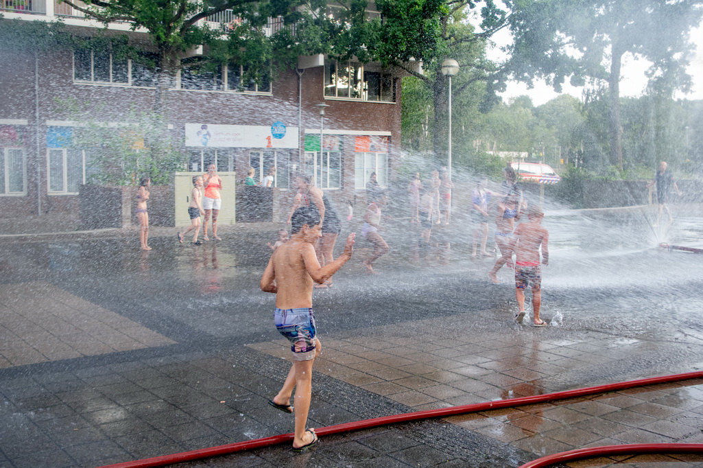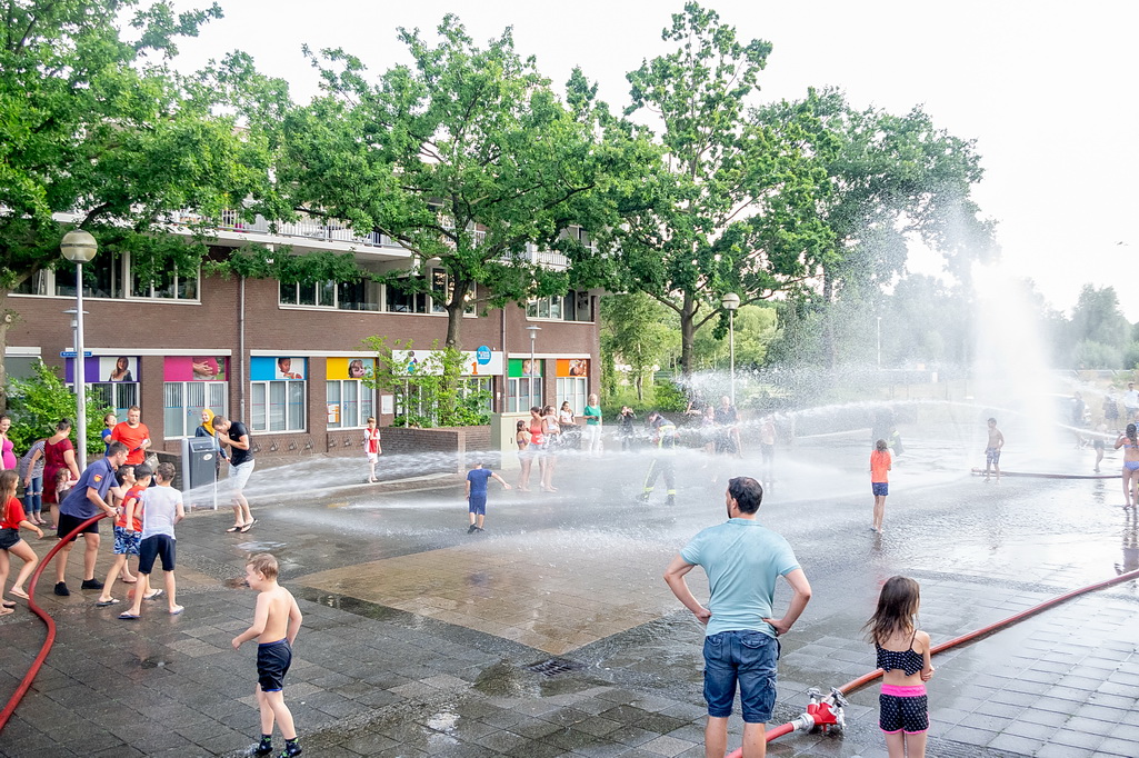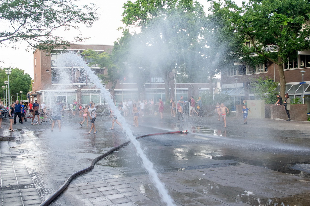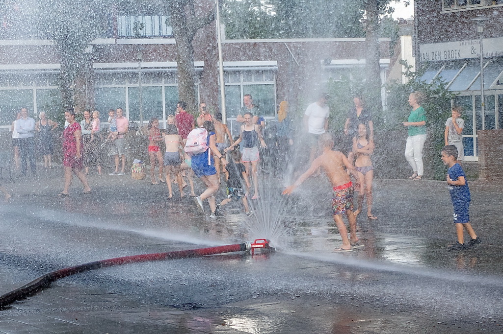 Tot 20.10 uur stond de brandweer met meerdere voertuigen op het plein en zorgde de brandweerlieden voor veel waterpret. Zowel voor kinderen als enkele volwassenen die ook een koude douche namen. Al snel stonden er zo’n honderd mensen op het plein.