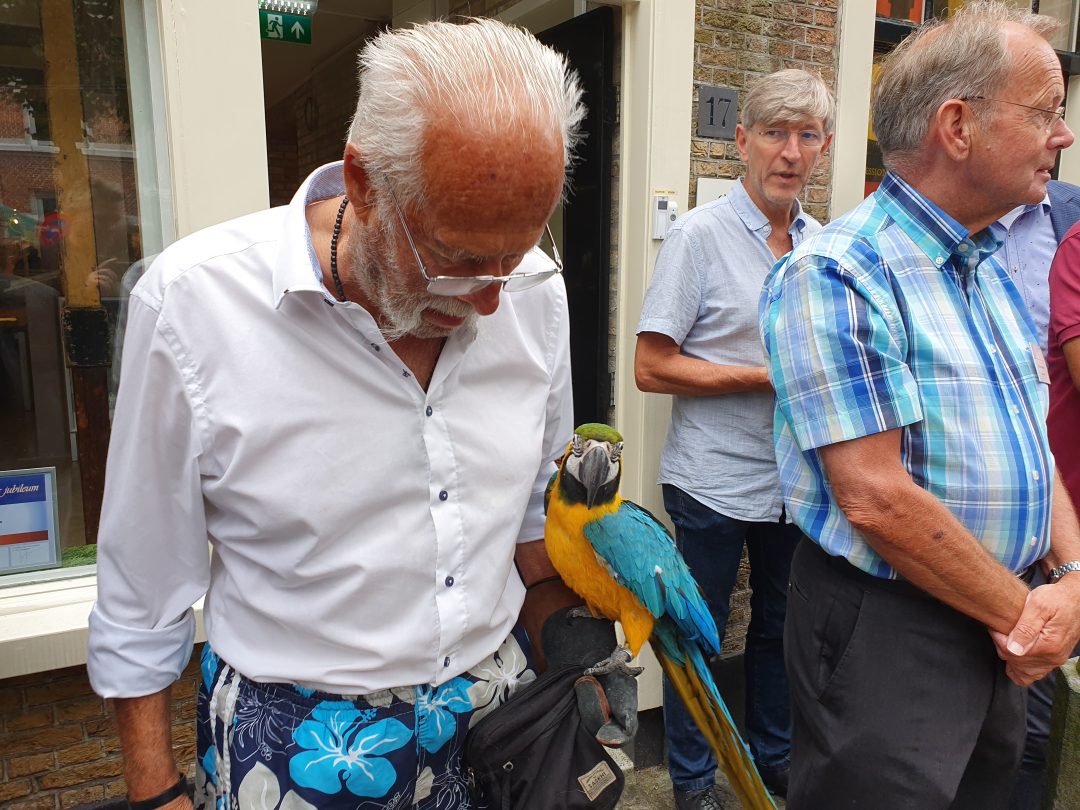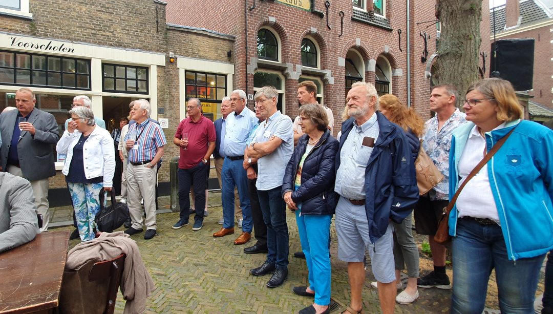 Chris de Waard in gesprek met voorzitter Cees Bijloos van de Voorschotense Paardendagen, voorzitter Leo van Vliet van de Kortebaan draverij Voorschoten en burgemeester Bouvy-Koene over de opname in de inventaris.