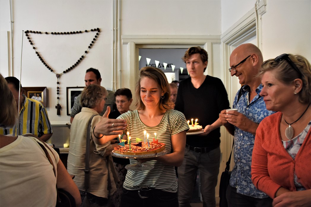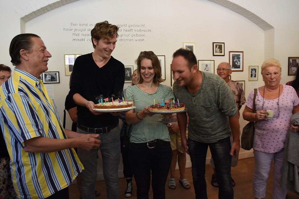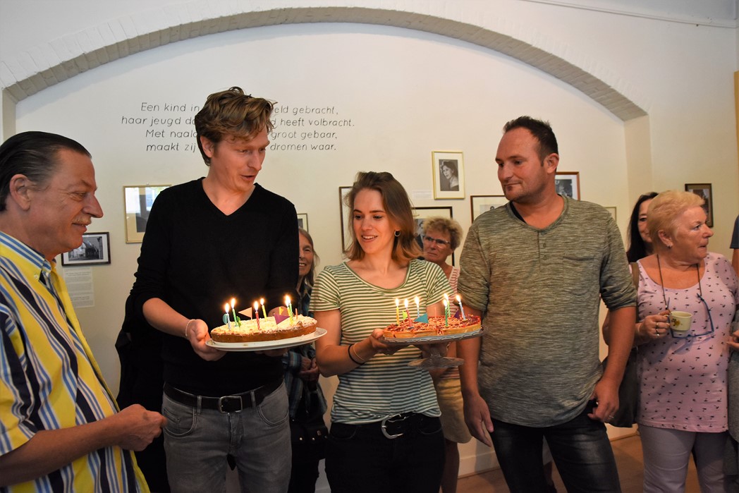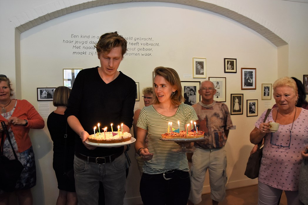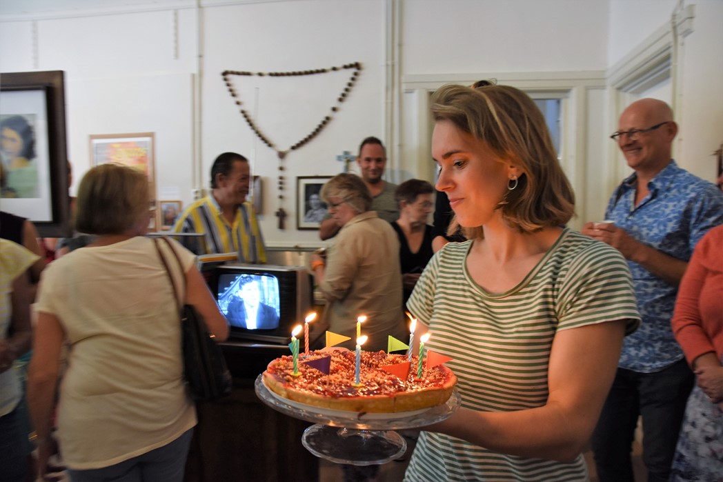Het is flink dringen in de expositiezaal direct links naast de deur in Old School als op 5 augustus de Limburgse vlaaien met brandende kaarsen worden binnengebracht. Neef Willem Bey en superfan Janco blazen de kaarsjes uit. Honderd jaar Zangeres Zonder Naam. Als Leiden uitloopt voor de jonge Rembrandt, waarom dan niet voor Mary Servaes, geboren als Rietje Bey in Leiden.