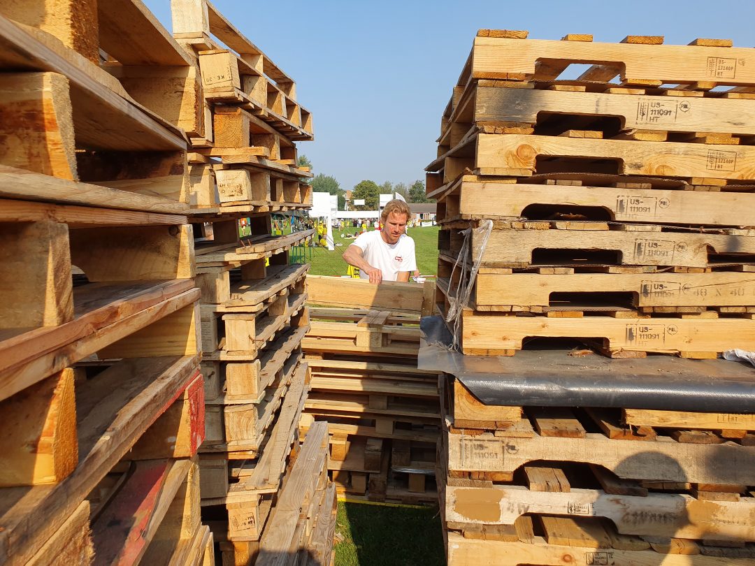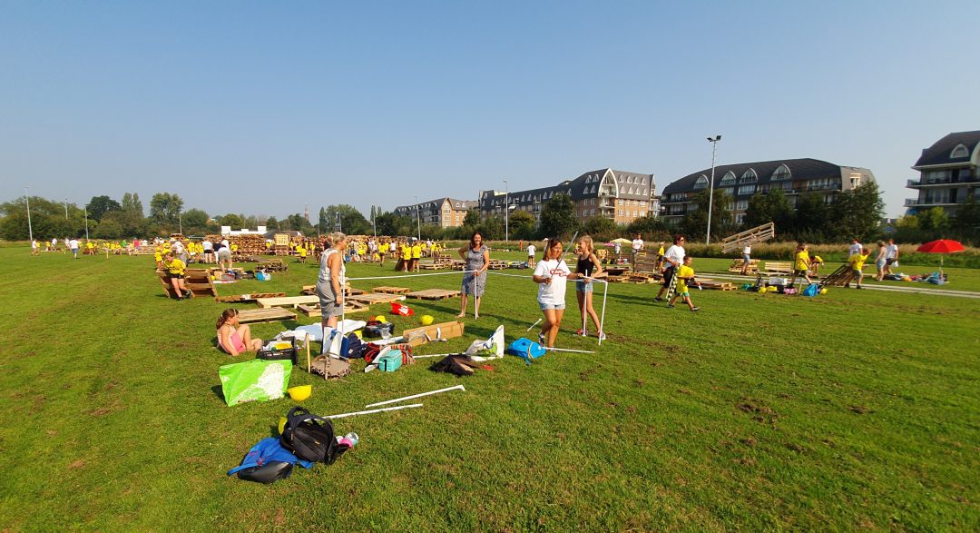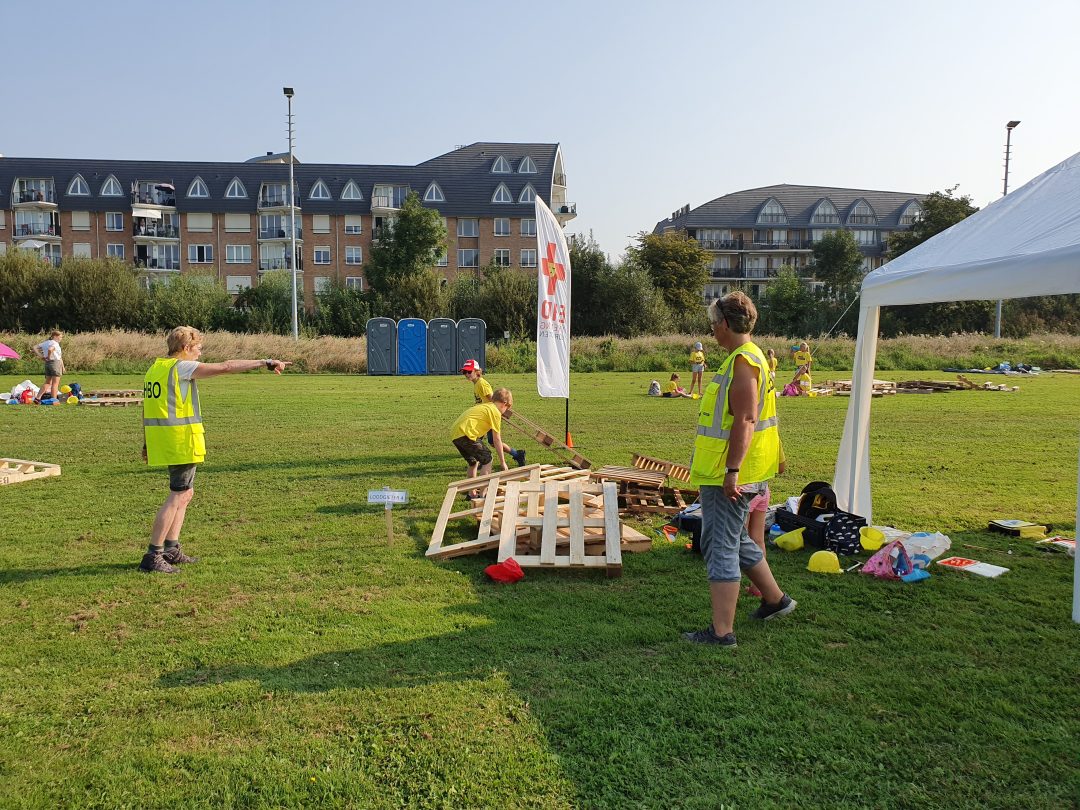 Om 10.00 uur hield vrijwilliger en sponsor Frank Moerkerk van het gelijknamige plantenparadijs aan de Leidseweg een openingspraatje, daarna werden de 320 deelnemertjes ‘losgelaten’ en kon het verzamelen van het benodigde bouwmateriaal beginnen. Dat zijn vooral houten pallets, maar uiteraard ook spijkers en gereedschap. “En dertig doosjes pleisters,” leert de ervaring uit voorgaande jaren, want waar gehakt wordt, vallen spaanders en slaat ook weleens iemand op zijn of haar duim. Maar als dat gebeurt staan de medewerkers van het Rode Kruis klaar om de pleisters te plakken.