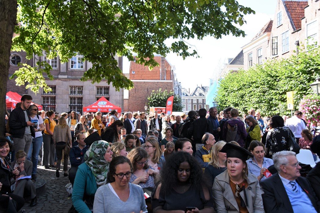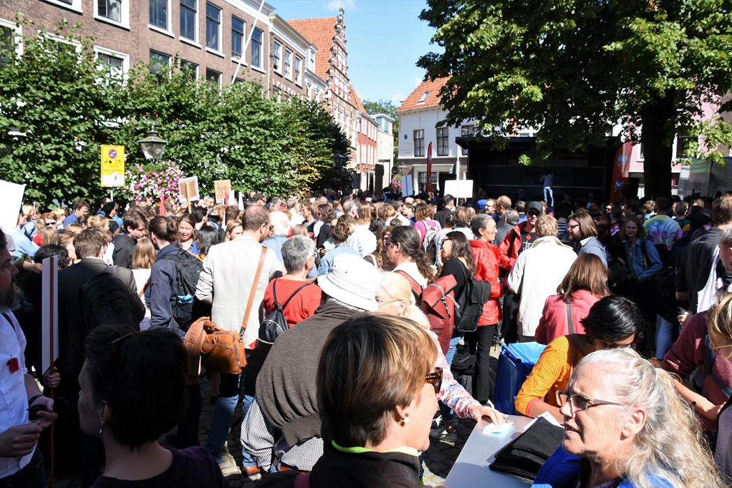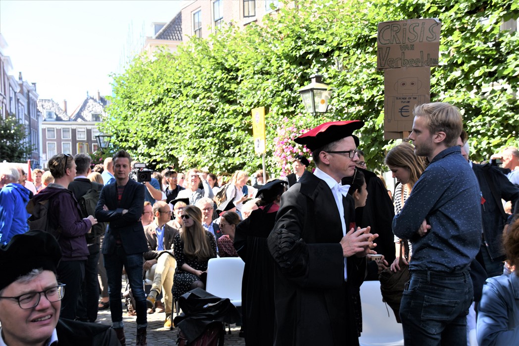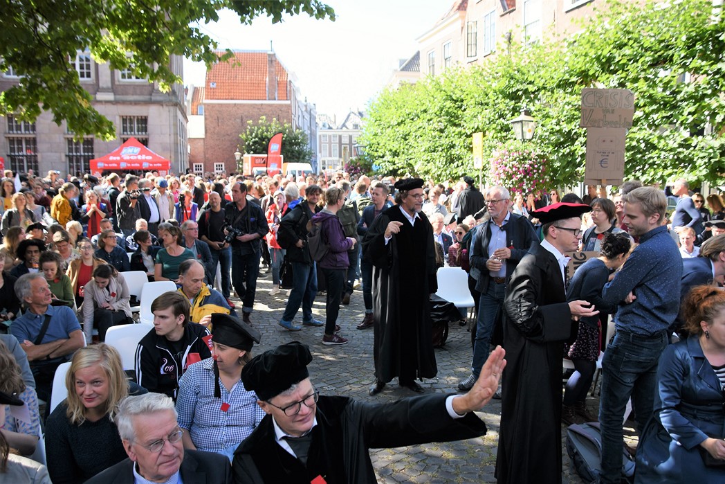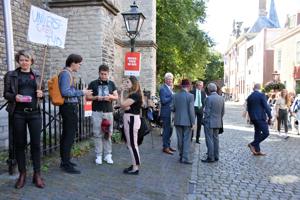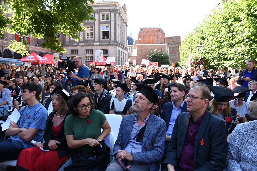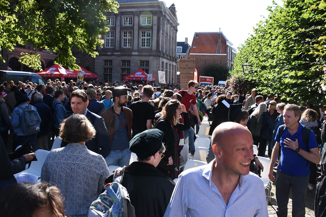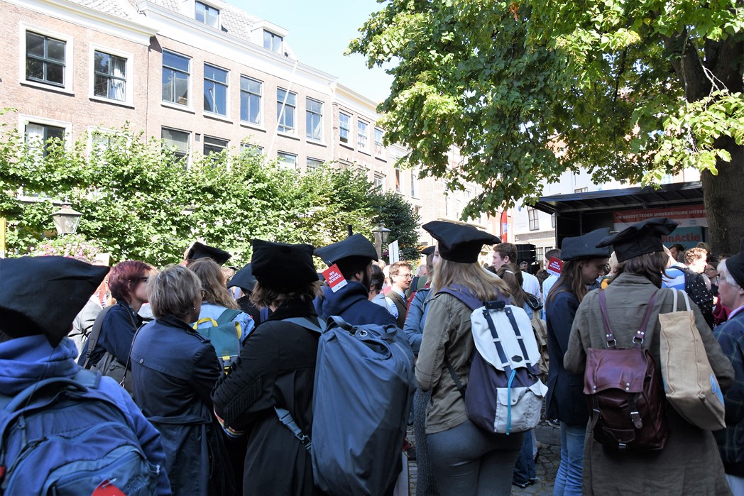 Gestaald kader is het niet. Evenmin zijn het geharnaste actievoerders, gelet op de woorden van één van de sprekers: “Ik had eigenlijk een paar toga’s verwacht op een verregend plein”. Volgens de aanwezige politieman zijn er zo’n 750 mensen op het zonovergoten Leids plein, het Gerecht. Dat is de opkomst bij de alternatieve ‘de ware’ opening van het academisch jaar. Op minder dan honderd meter van de plechtstatige officiële opening in de Leidse Pieterskerk. “Dat is veel, want dan zit je wel aan de max voor dit plein”, zegt hij er nog bij.