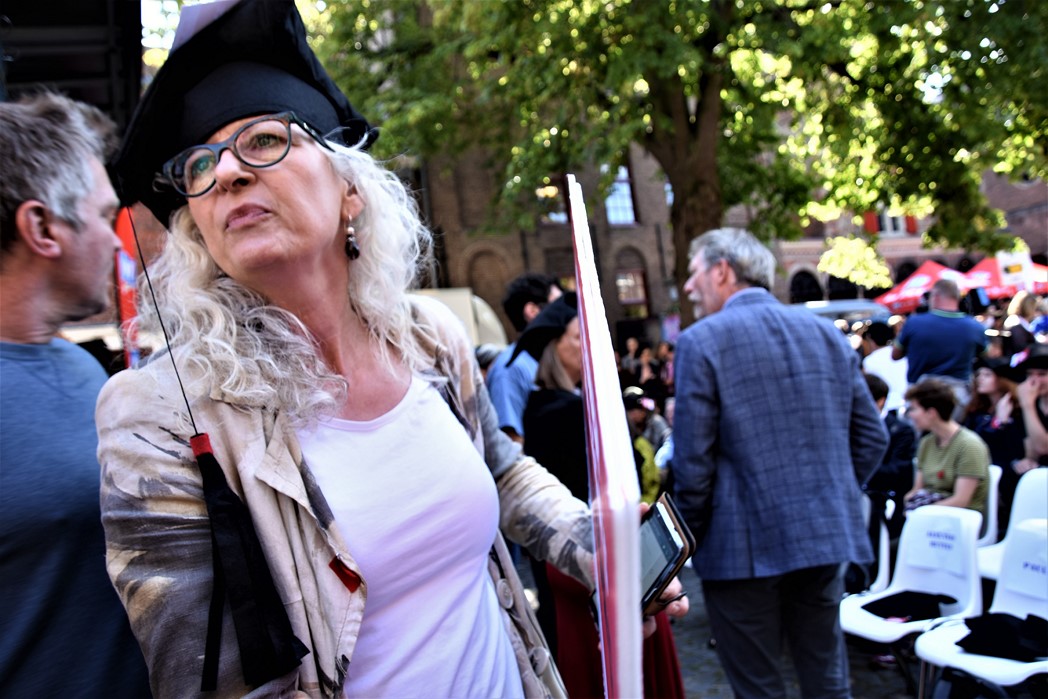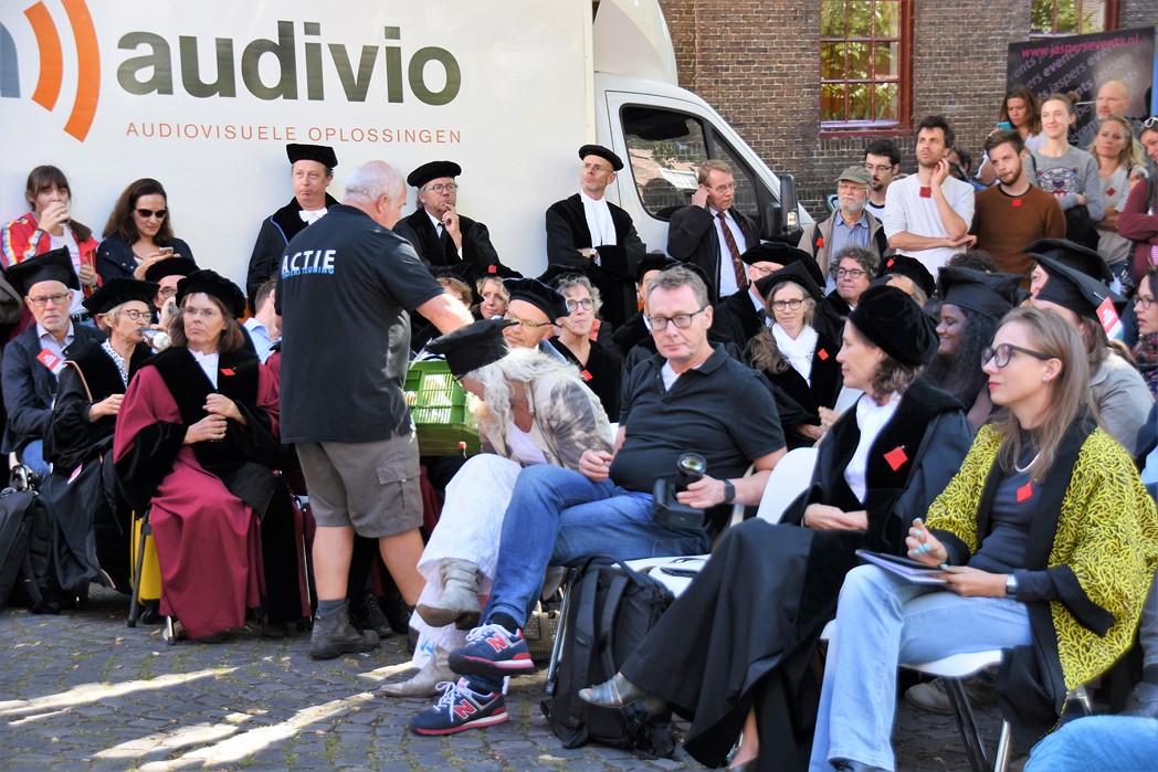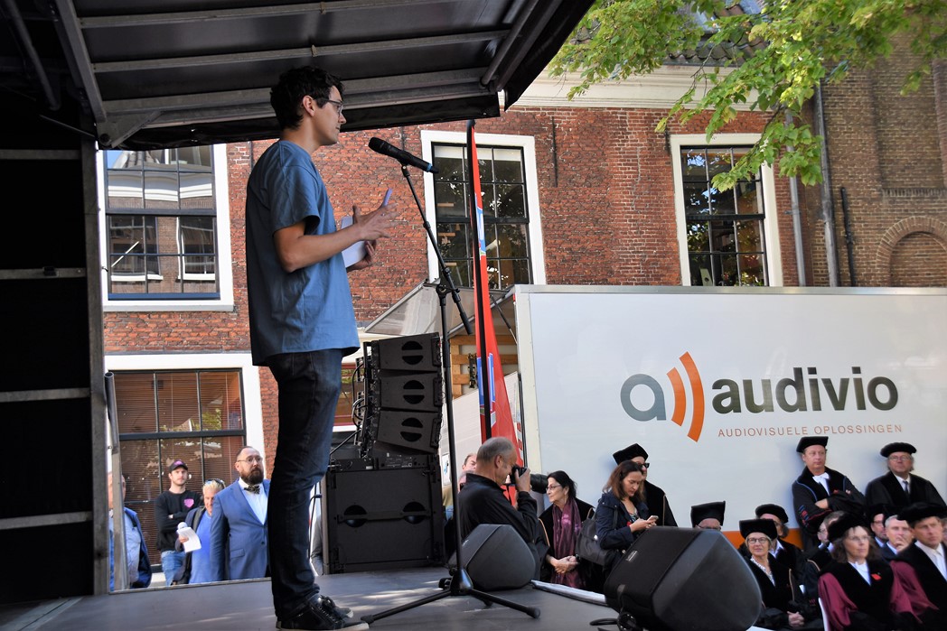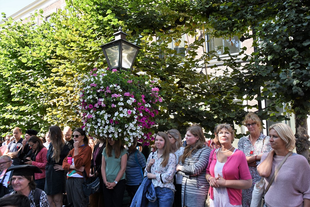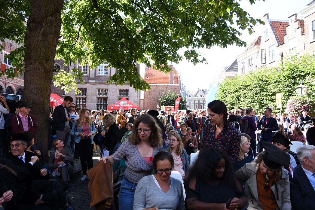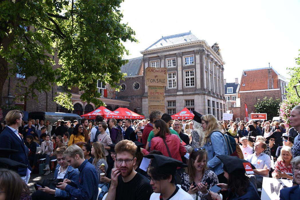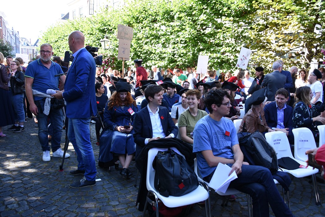 Gestaald kader is het niet. Evenmin zijn het geharnaste actievoerders, gelet op de woorden van één van de sprekers: “Ik had eigenlijk een paar toga’s verwacht op een verregend plein”. Volgens de aanwezige politieman zijn er zo’n 750 mensen op het zonovergoten Leids plein, het Gerecht. Dat is de opkomst bij de alternatieve ‘de ware’ opening van het academisch jaar. Op minder dan honderd meter van de plechtstatige officiële opening in de Leidse Pieterskerk. “Dat is veel, want dan zit je wel aan de max voor dit plein”, zegt hij er nog bij.