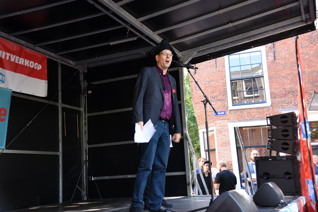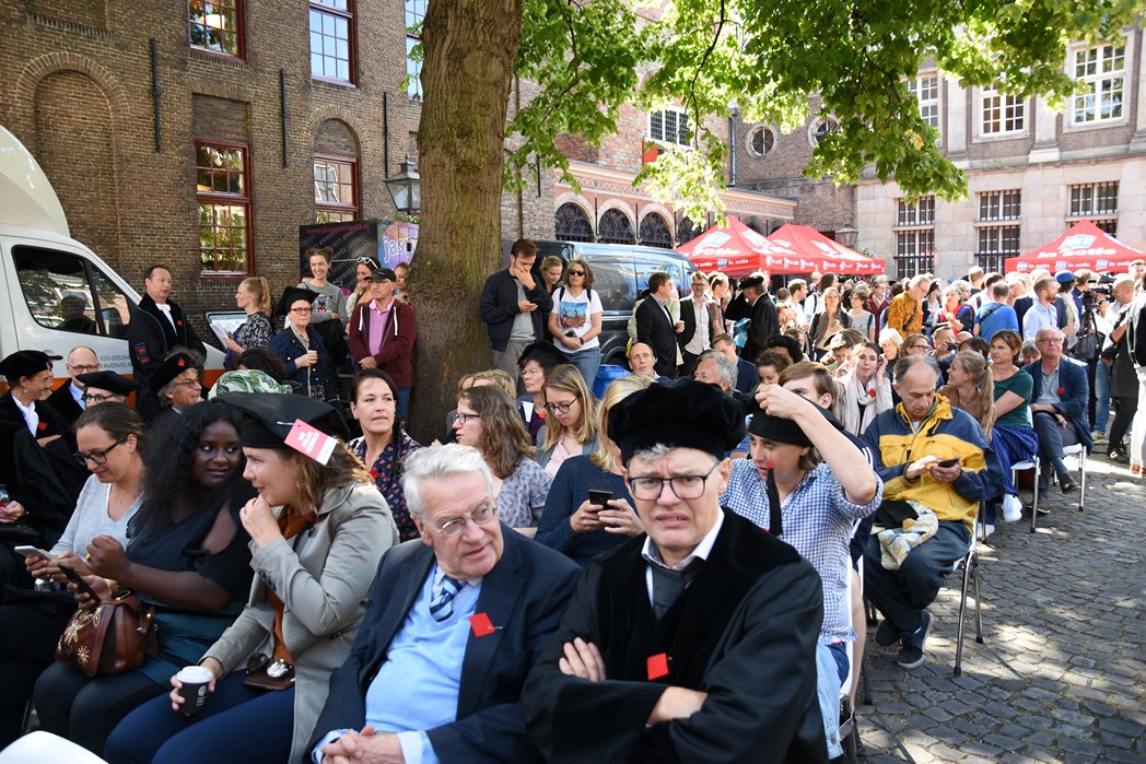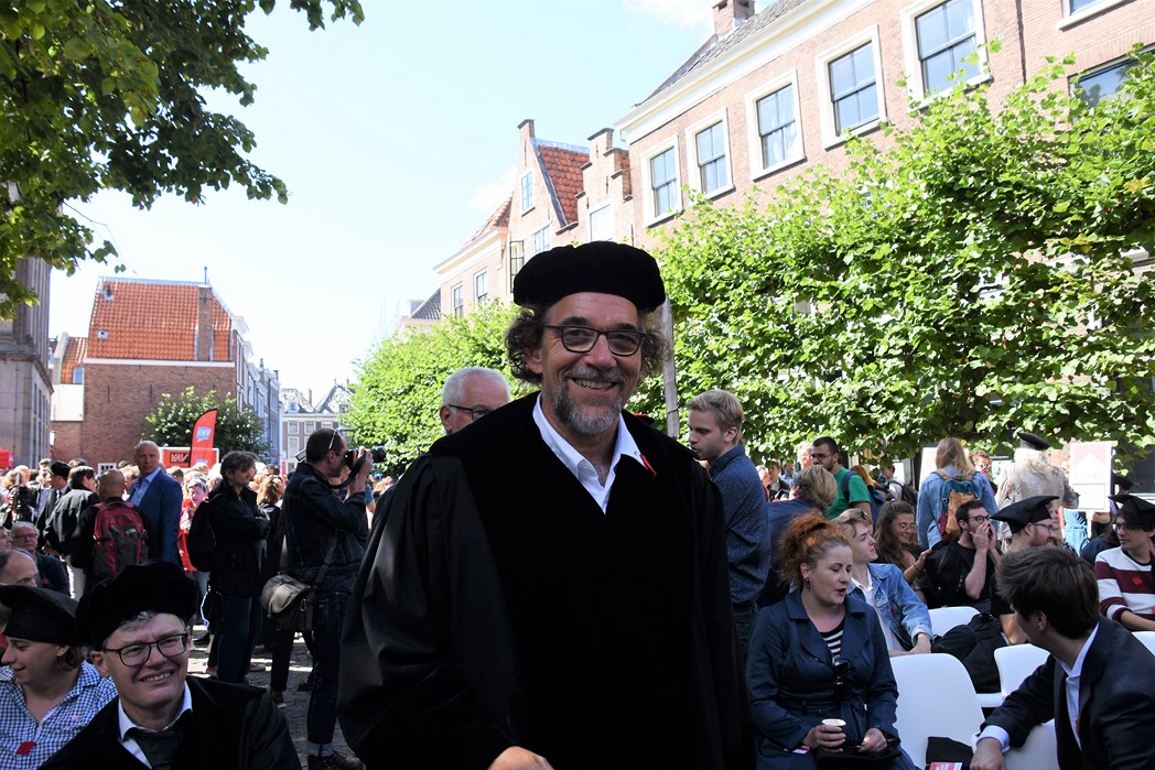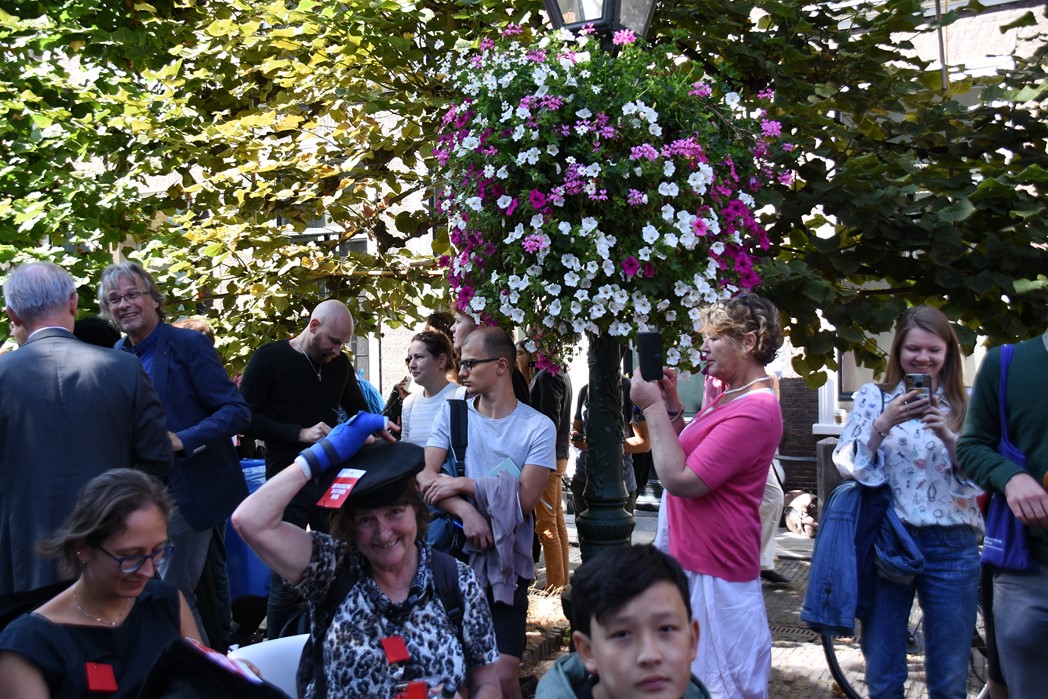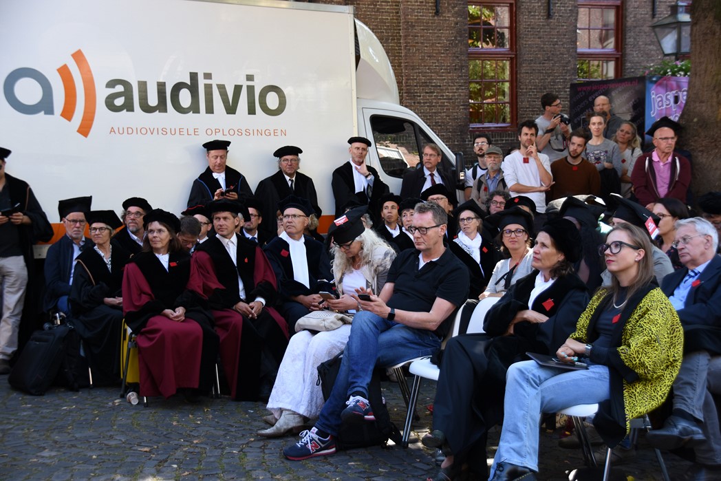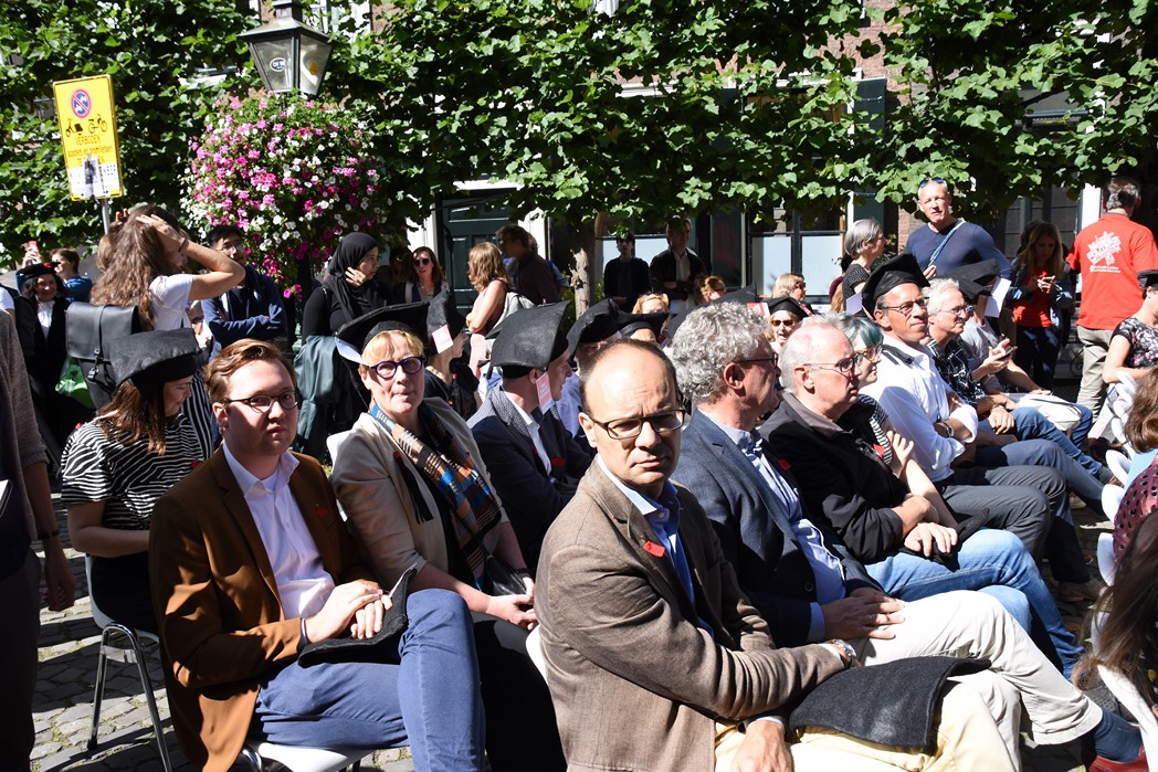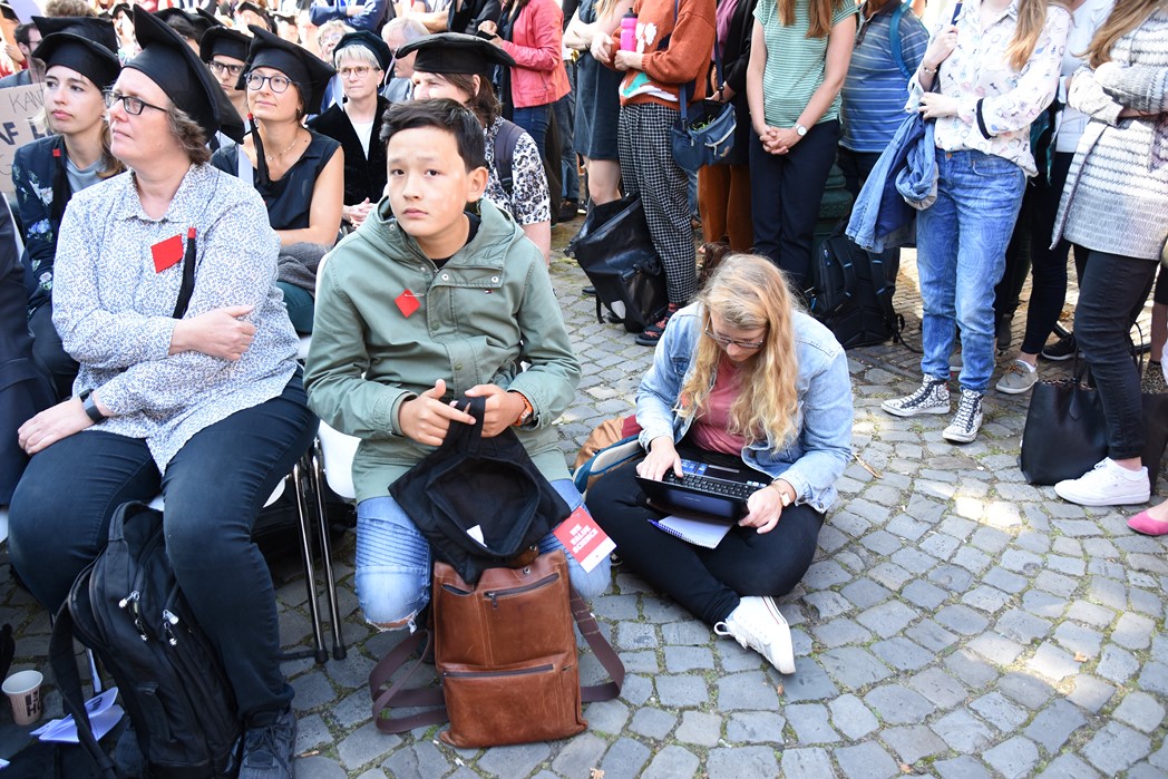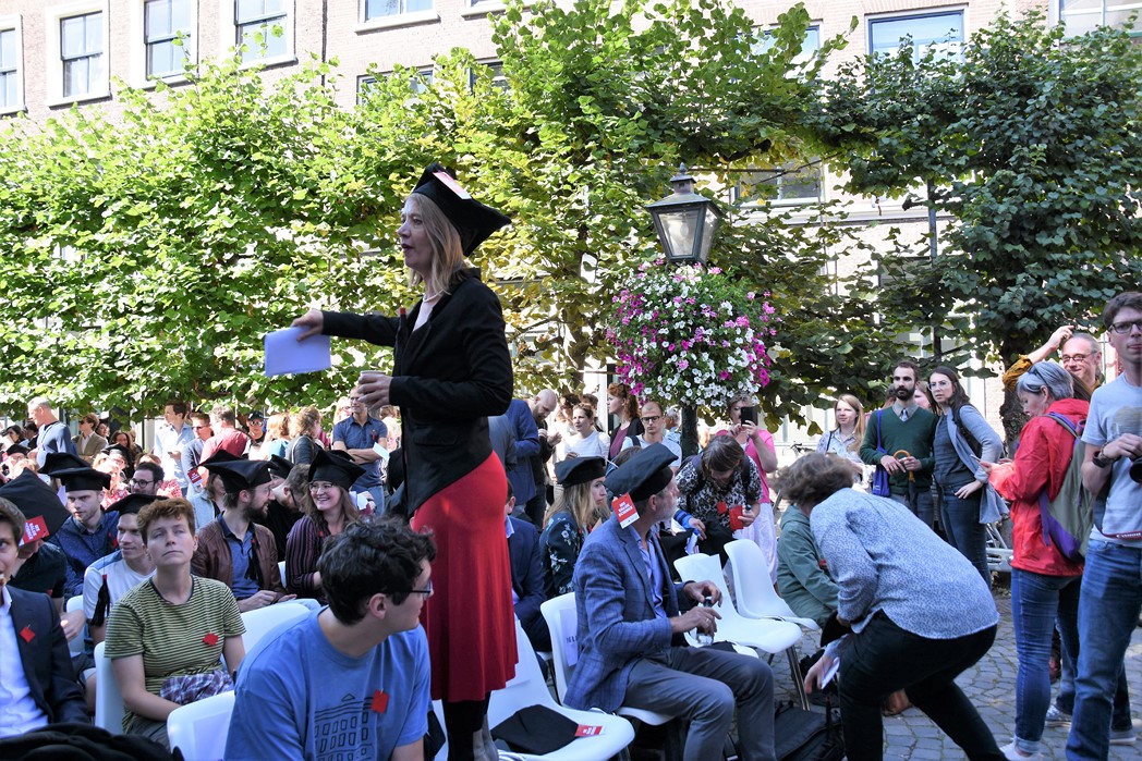 Gestaald kader is het niet. Evenmin zijn het geharnaste actievoerders, gelet op de woorden van één van de sprekers: “Ik had eigenlijk een paar toga’s verwacht op een verregend plein”. Volgens de aanwezige politieman zijn er zo’n 750 mensen op het zonovergoten Leids plein, het Gerecht. Dat is de opkomst bij de alternatieve ‘de ware’ opening van het academisch jaar. Op minder dan honderd meter van de plechtstatige officiële opening in de Leidse Pieterskerk. “Dat is veel, want dan zit je wel aan de max voor dit plein”, zegt hij er nog bij.