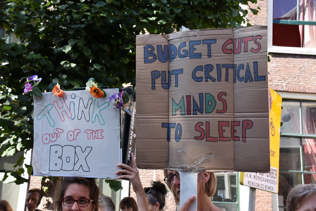 Paul de Beer (namens FNV/VAWO) schetst een beeld dat platte bezuinigings(drift) ver te boven gaat. Het is botsing van visies, van beelden van wat een academie, een universiteit is. In zijn optiek is dat een gemeenschap waar alternatieve zienswijzen en gedachten vrijelijk kunnen worden ontwikkeld en getoetst. “Een echte wetenschapper werkt als een kunstenaar. (…) Maar probeer maar eens een proefschrift goedgekeurd te krijgen dat onorthodox is”. Dát is wat minister Van Engelshoven van Onderwijs wordt verweten; dat de bevoordeling van technische opleidingen ten koste van geesteswetenschappen vooral ook een idee introduceert van een afhánkelijke en versmalde universiteit. Een universiteit waar aantallen publicaties belangrijker zijn dan oorspronkelijkheid: “Het zijn geen werkelijke bijdragen als het gestandaardiseerd gebeurt”.