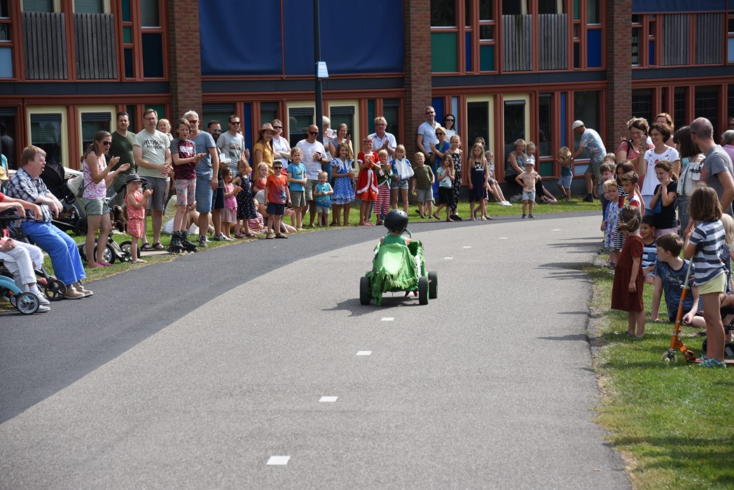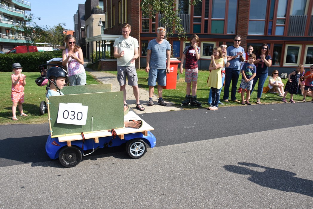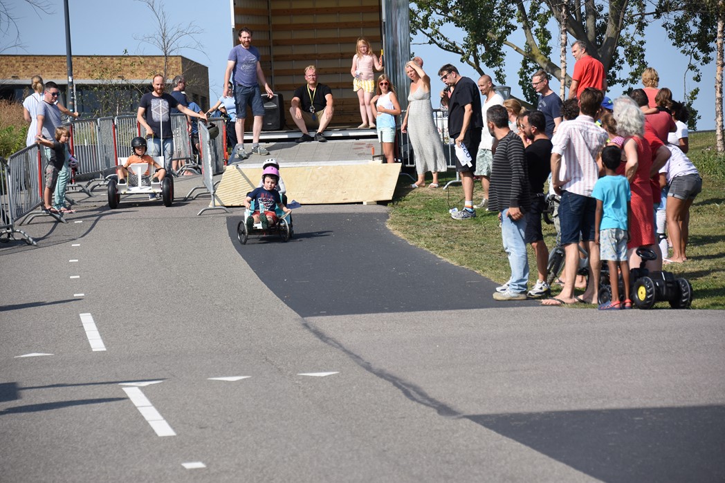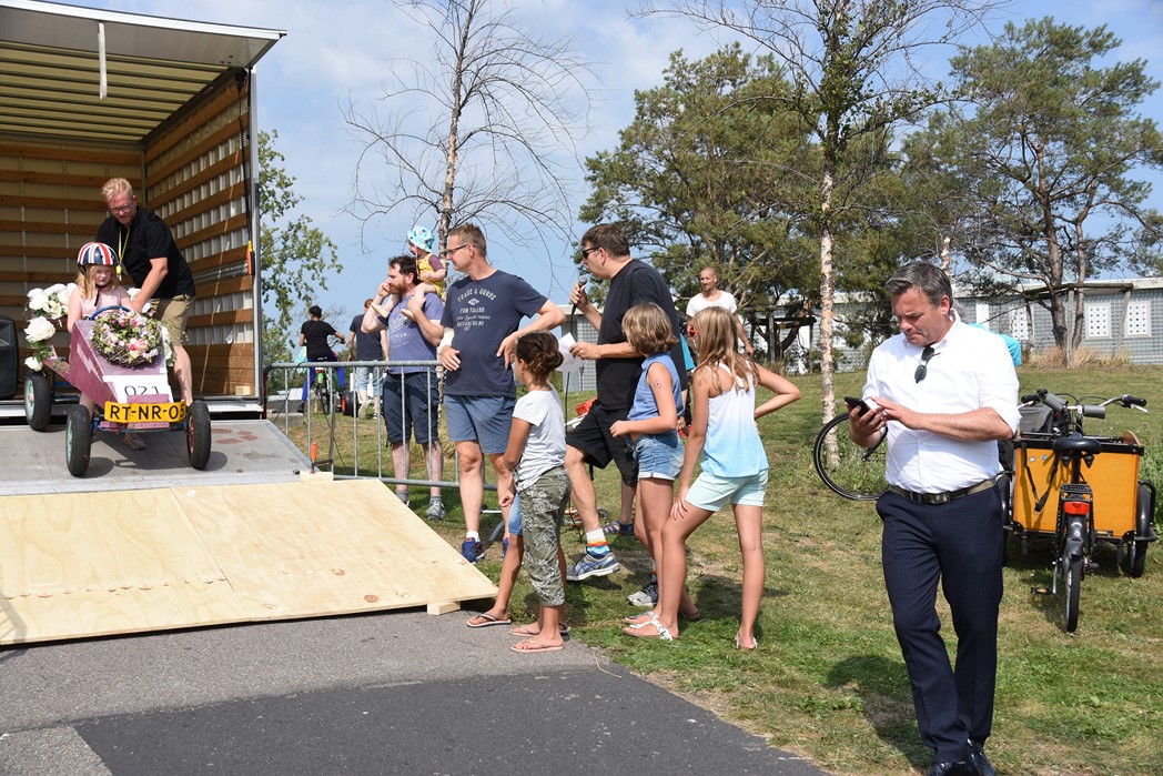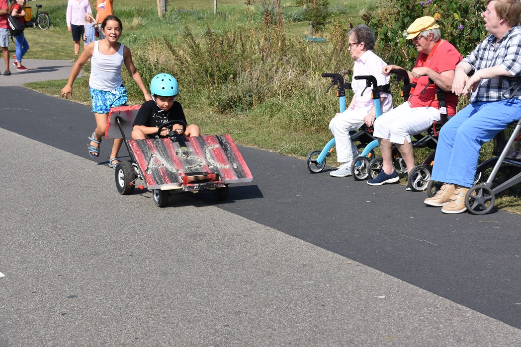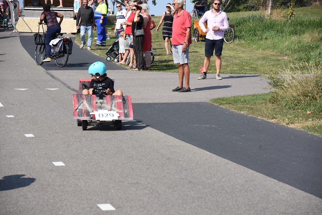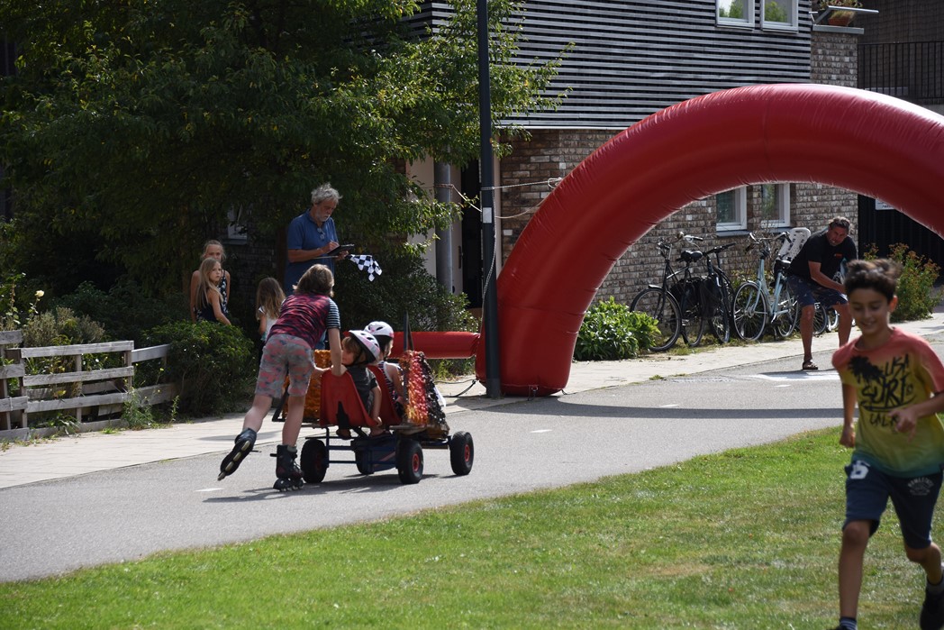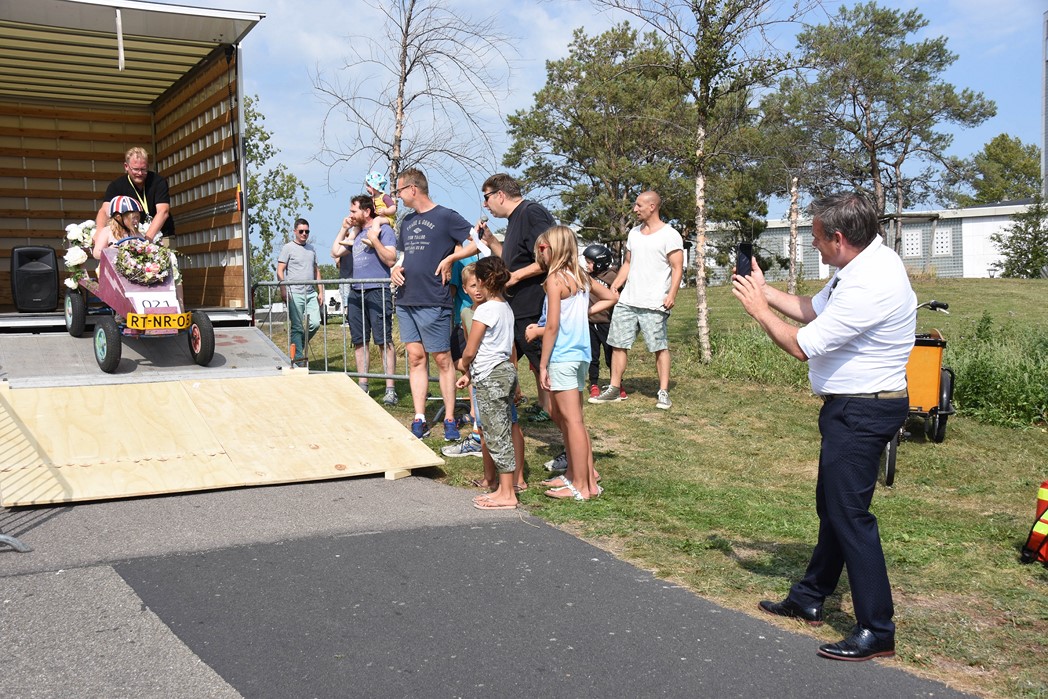 Een van de hoogtepunten van het wijkfeest is elk jaar de zeepkistenrace. Nadat de wethouder rond gekeken had in het parkje langs de Maresingel liep hij met de bestuurders van de zeepkisten naar de heuvel bij de Drakentuin om het startsein van de Zeepkisten Race 2019 te geven. De snelste tijd werd ook dit jaar weer neergezet door Clint Verlooij die zich met de supersnelle tijd van 17 seconden winnaar van 2019 mag noemen.