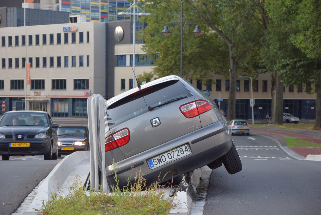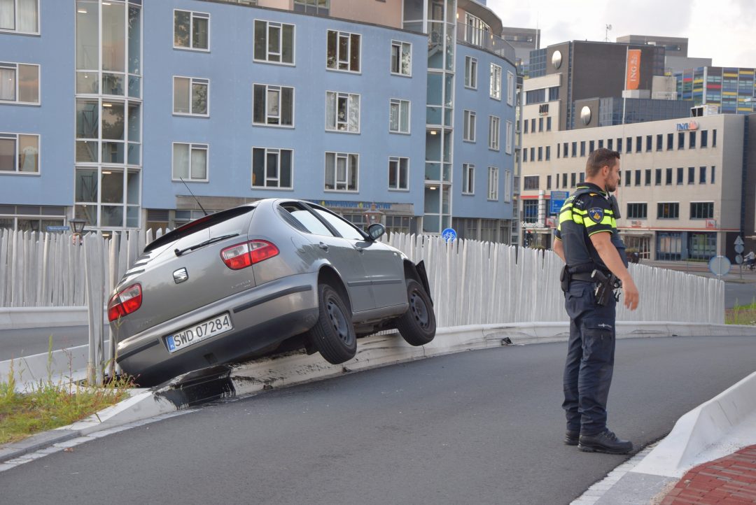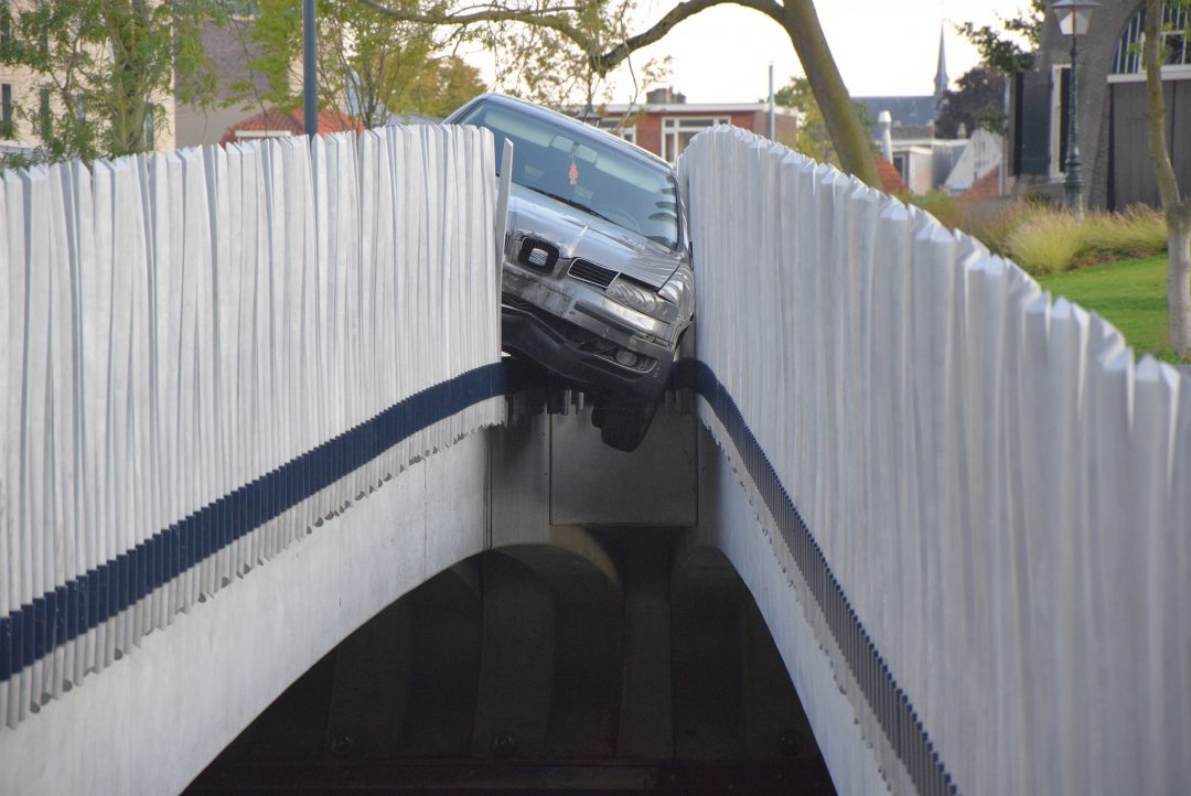 Op de Molenwerf is een automobilist uit de bocht gevlogen bij de Valkbrug. De auto is dwars door de leuning van de afgelopen zomer opgeleverde brug heen geschoten en bungelt nu tussen de brugdelen van de uit vier losse stroken bestaande brug. De bestuurder kwam daarbij vast te zitten in zijn auto, maar bleef wel ongedeerd.