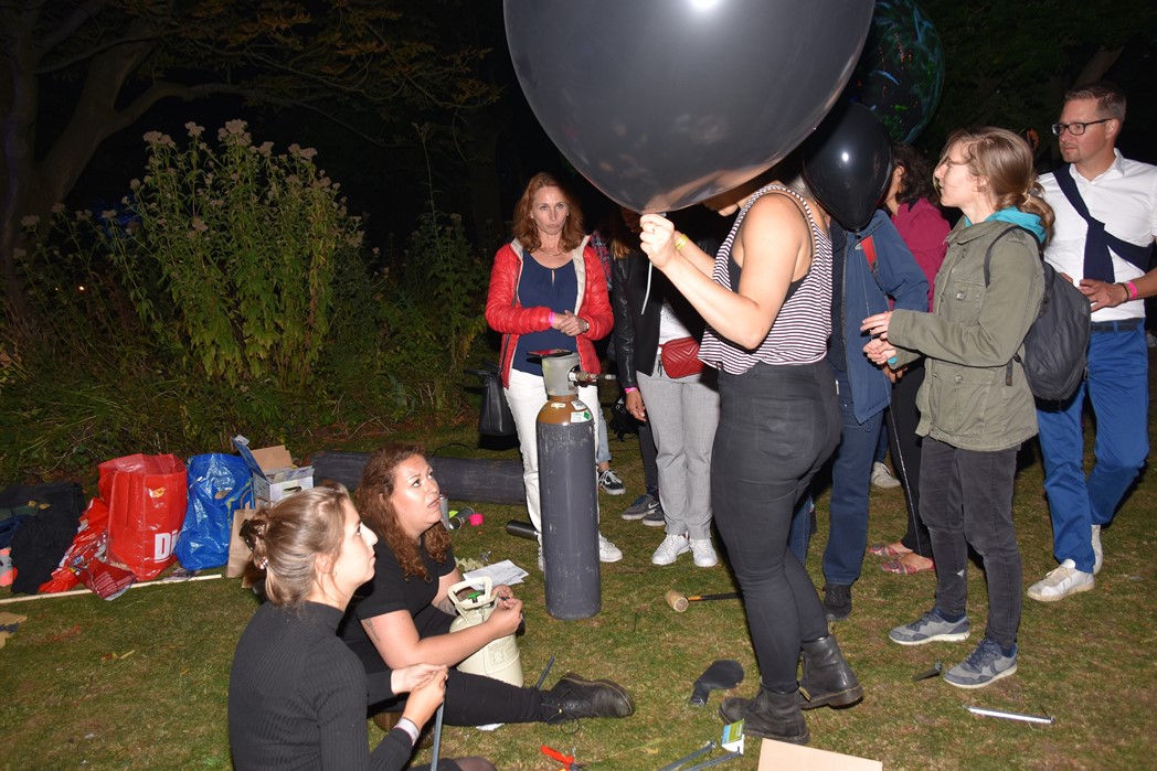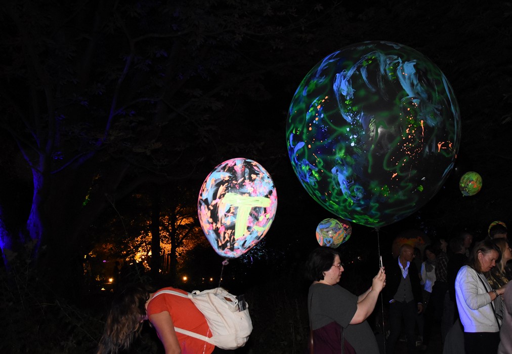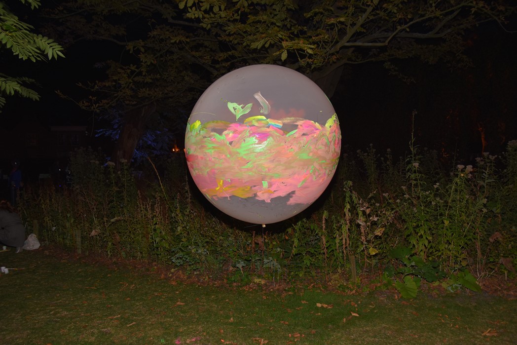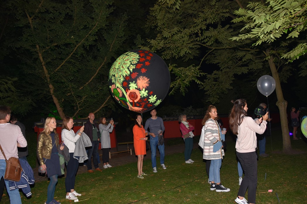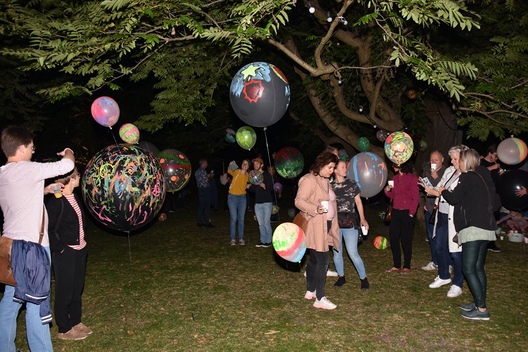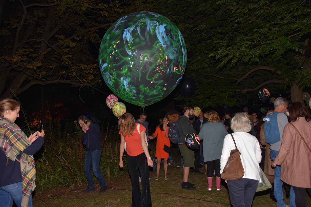 Het is een bedenking bij de Nacht van Ontdekkingen, en andere; wie die evenementen volgt, merkt na verloop van tijd dat herhaling optreedt, dat vernieuwing uit beeld dreigt te verdwijnen. Het is een lastig dilemma, want de evenementen en festivals zijn uiteraard een prima podium voor Leidse kunst en cultuur. Zeker één van de visuele hoogtepunten was het project van Roos Tulen, Het universum van Leiden. Dat kan zich goed meten met andere en haar projecten zijn iedere keer anders, niet vergelijkbaar. De met ultraviolet licht beschenen, door bezoekers beschilderde, heliumballonnen van verschillende grootte maakten van een diepdonkere plek in de Hortus een wereld van ‘planeten’. Eén wereld.